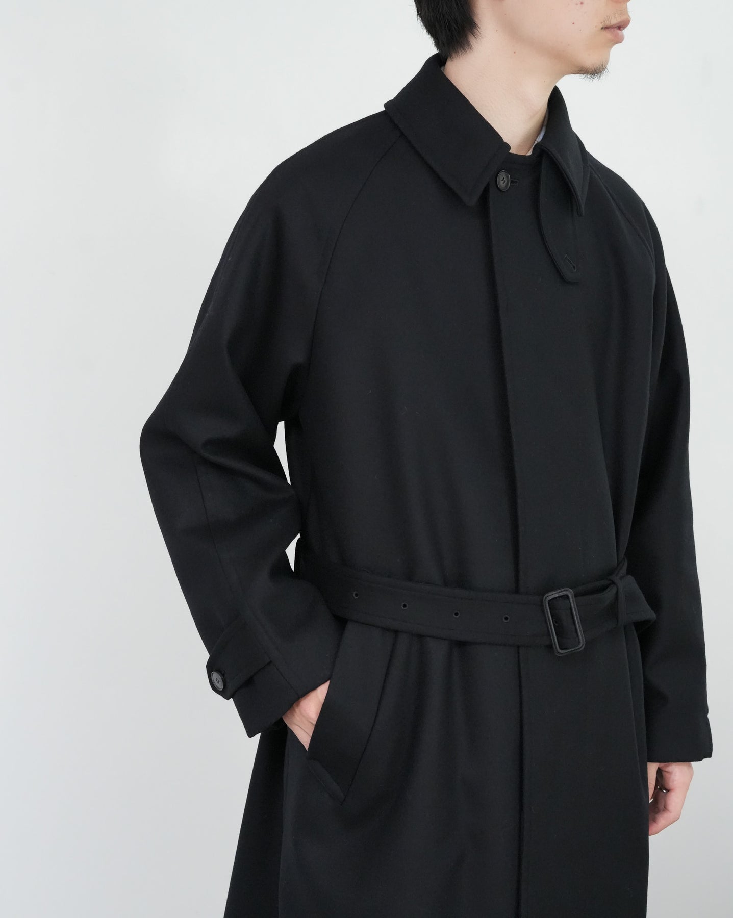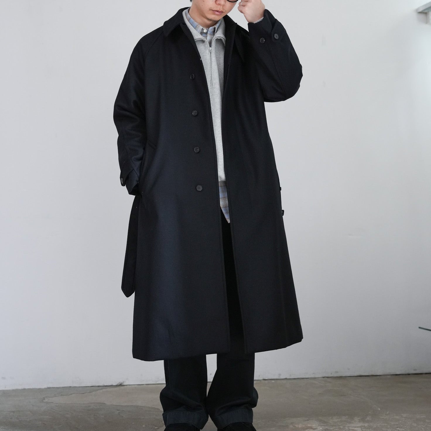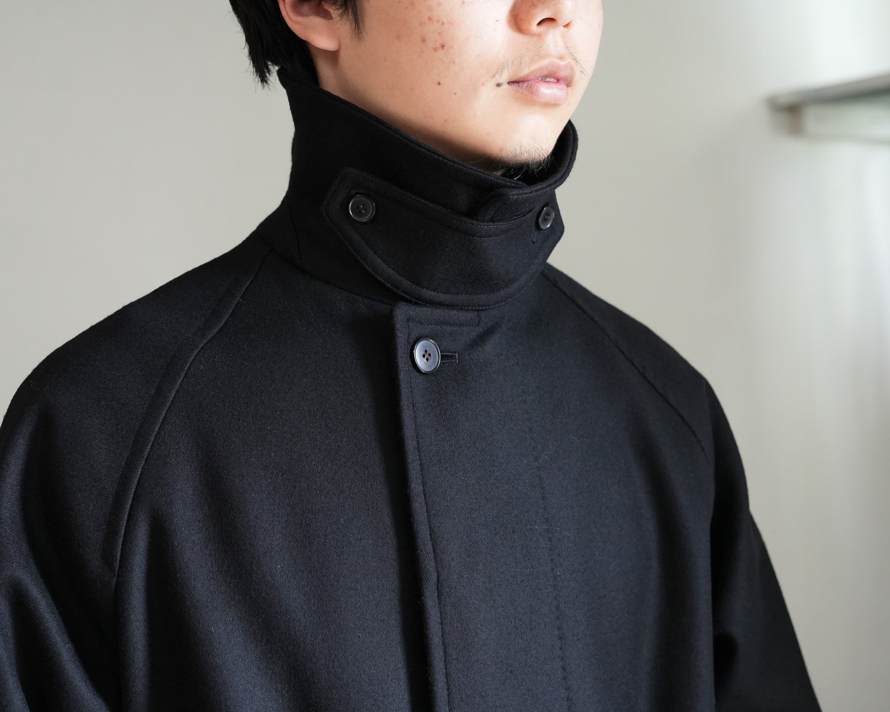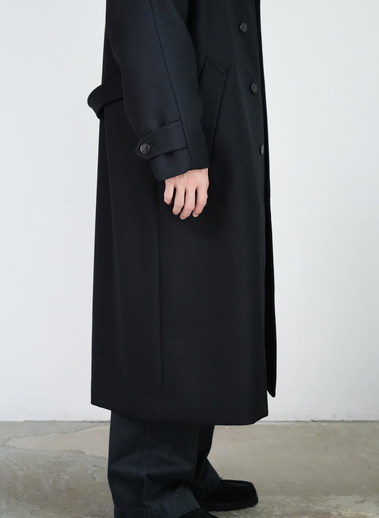 SUPER100'S原料を使い高密度に織り上げた梳毛ダブルクロスです。厚みを抑え高密度に織り、抗ピリング加工を行っています。チンタブ付きのゆったりしたロングコートです。