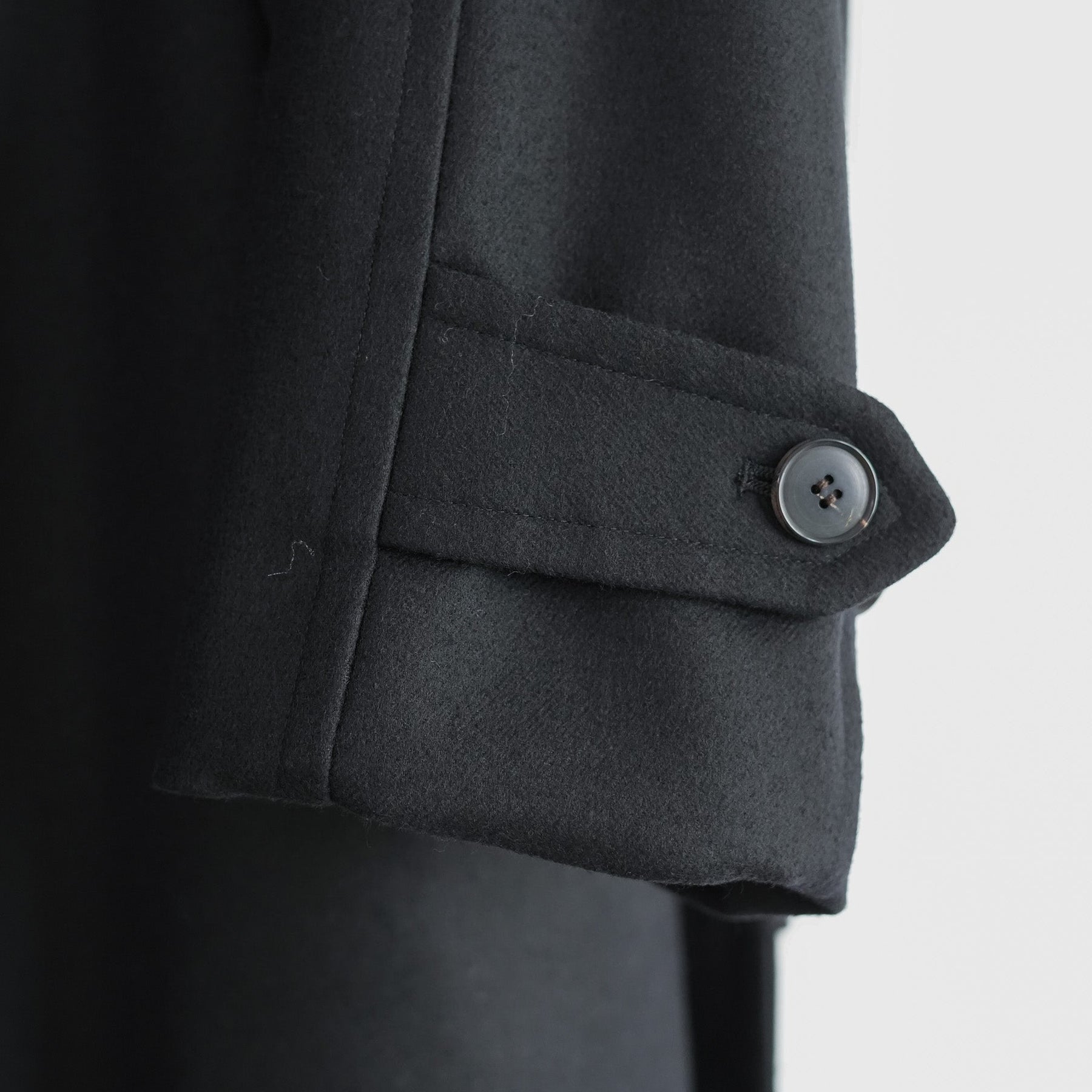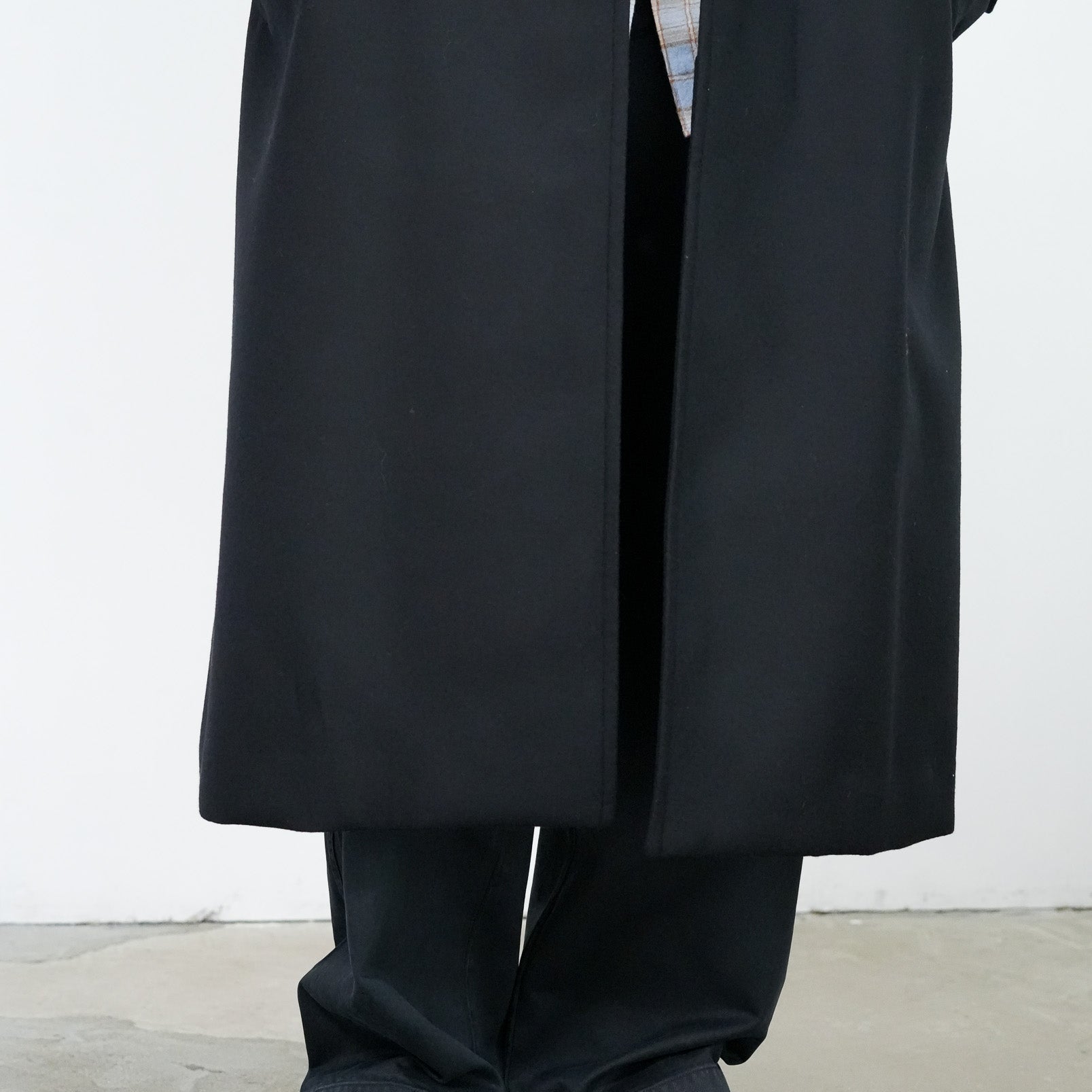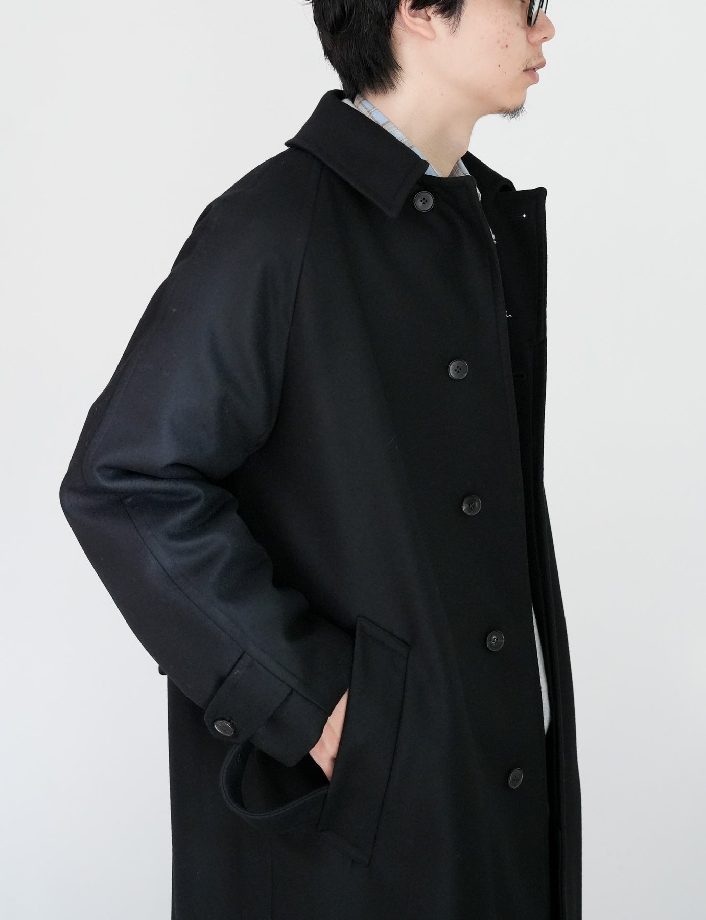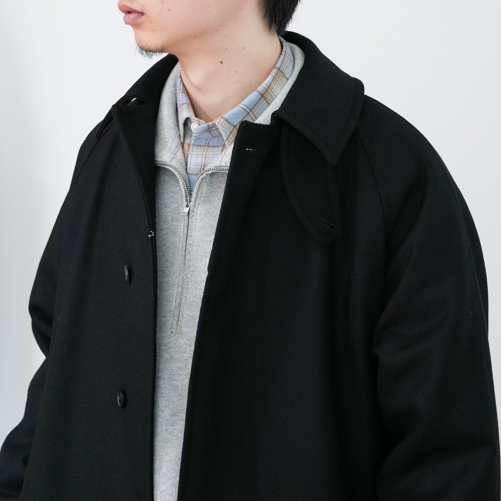 SUPER100'S原料を使い高密度に織り上げた梳毛ダブルクロスです。厚みを抑え高密度に織り、抗ピリング加工を行っています。チンタブ付きのゆったりしたロングコートです。