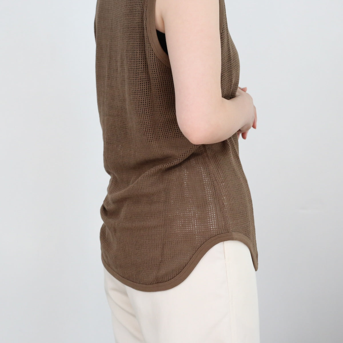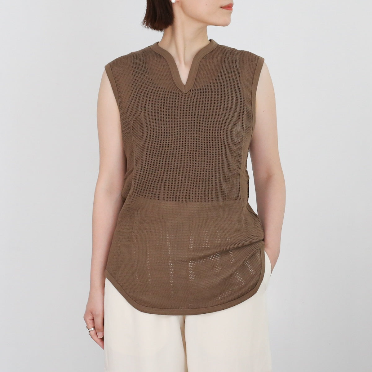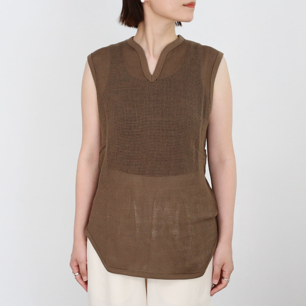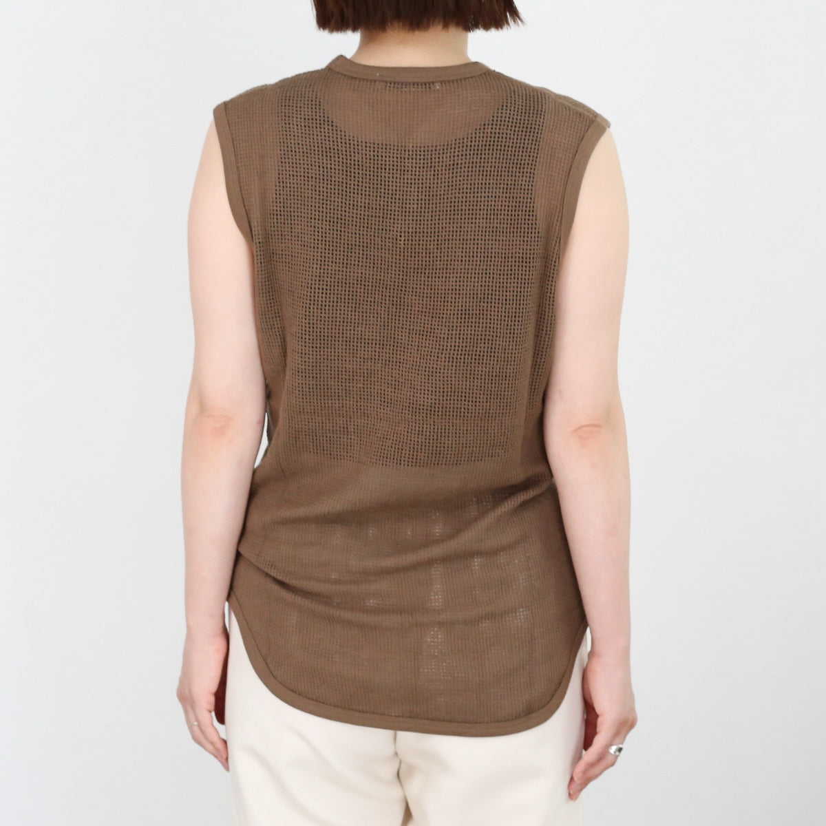 PHEENYらしいリラックス感のある バスケットメッシュノースリーブ。