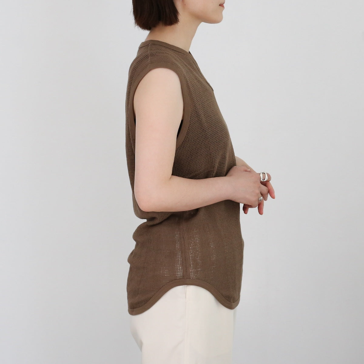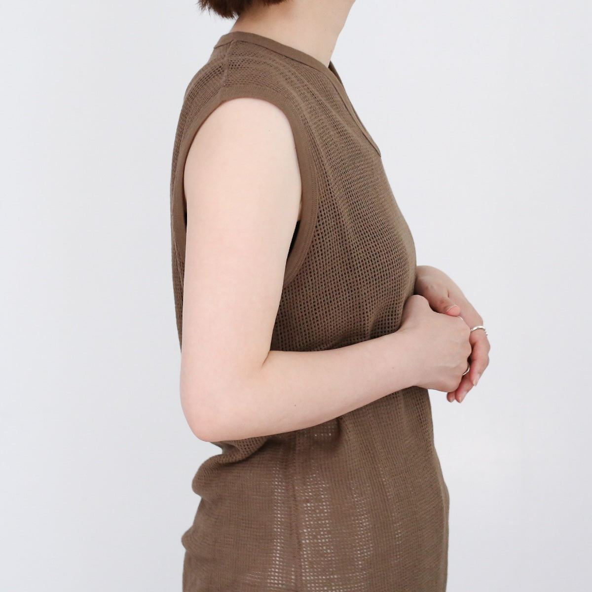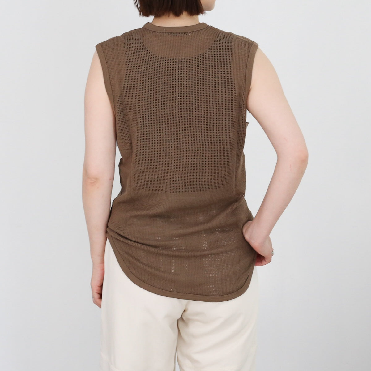 PHEENYらしいリラックス感のある バスケットメッシュノースリーブ。