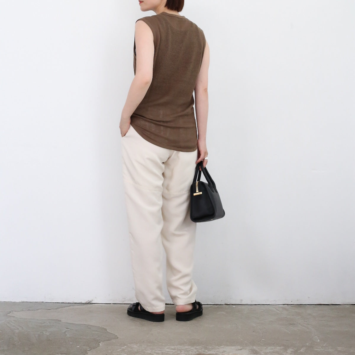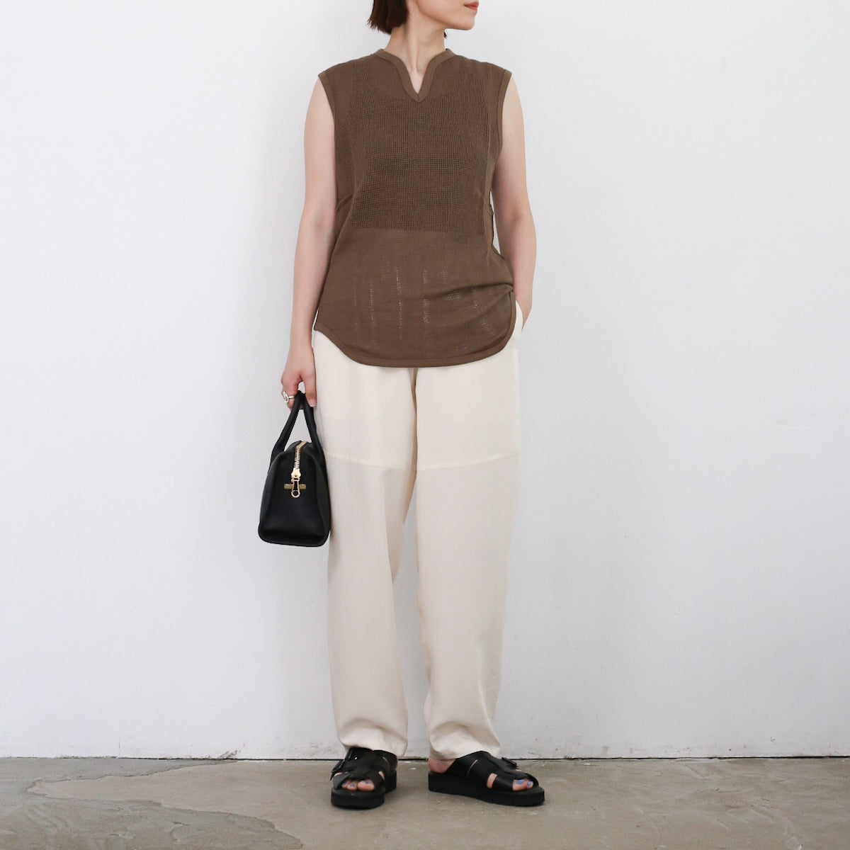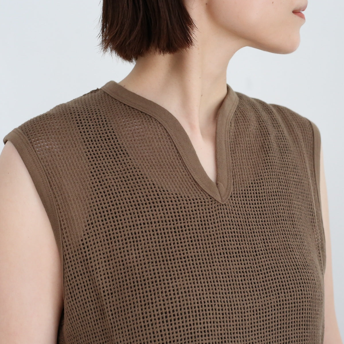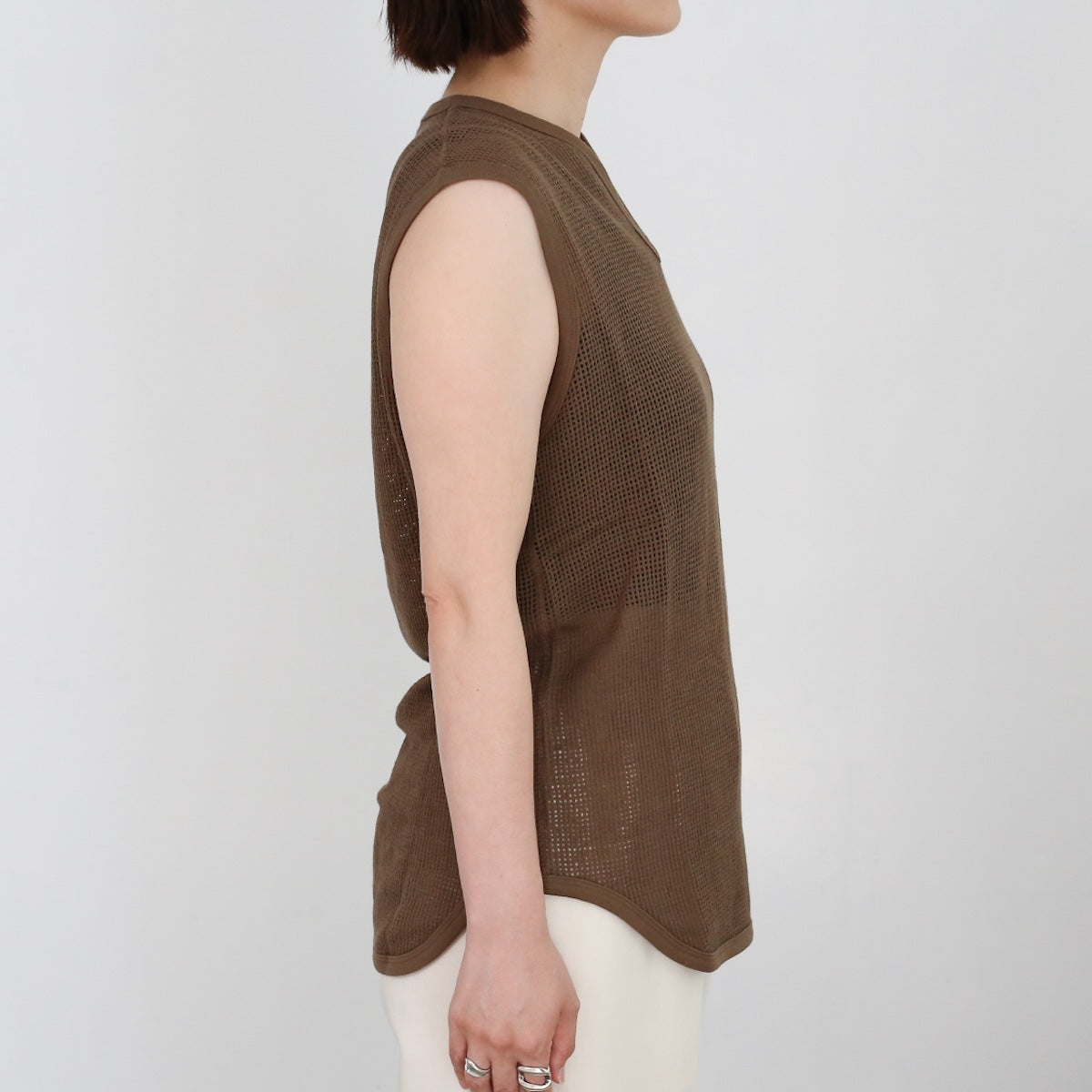 PHEENYらしいリラックス感のある バスケットメッシュノースリーブ。