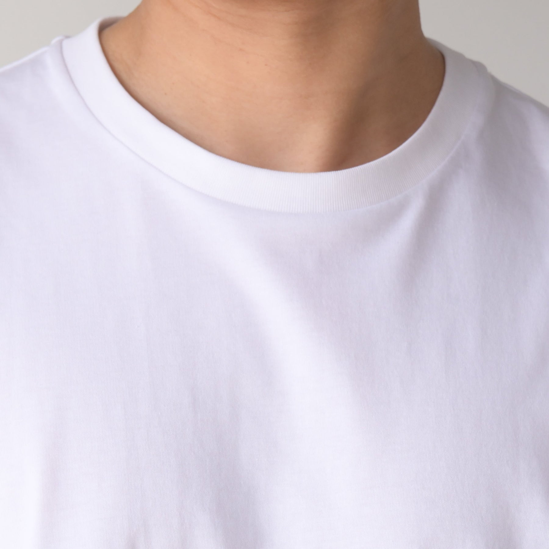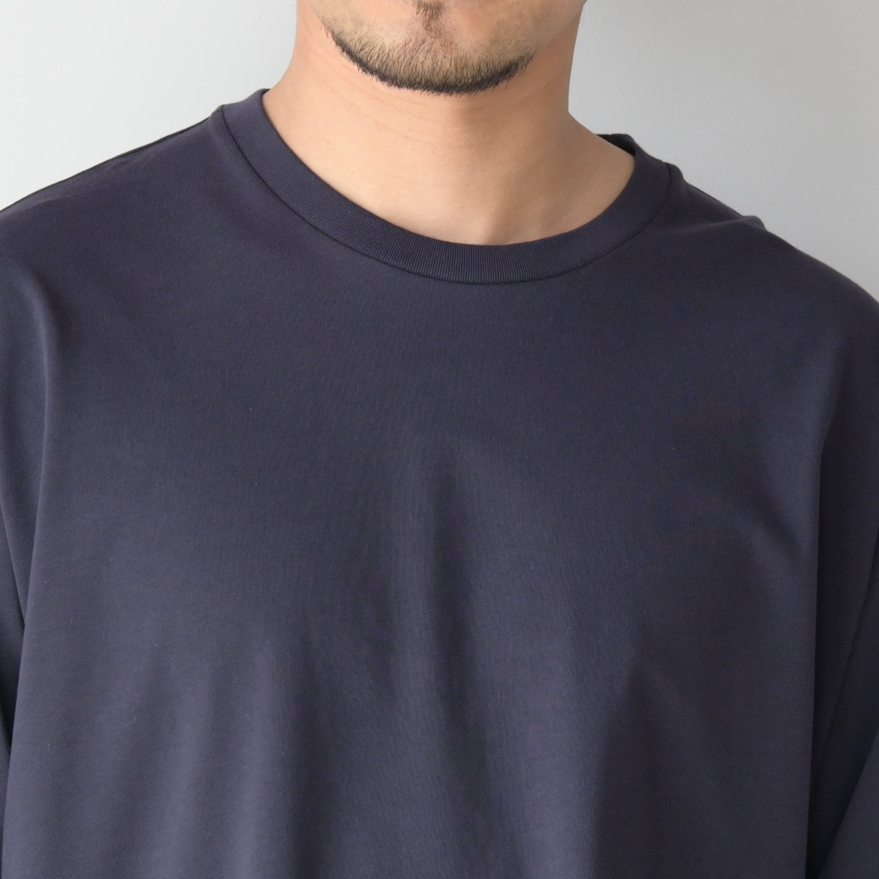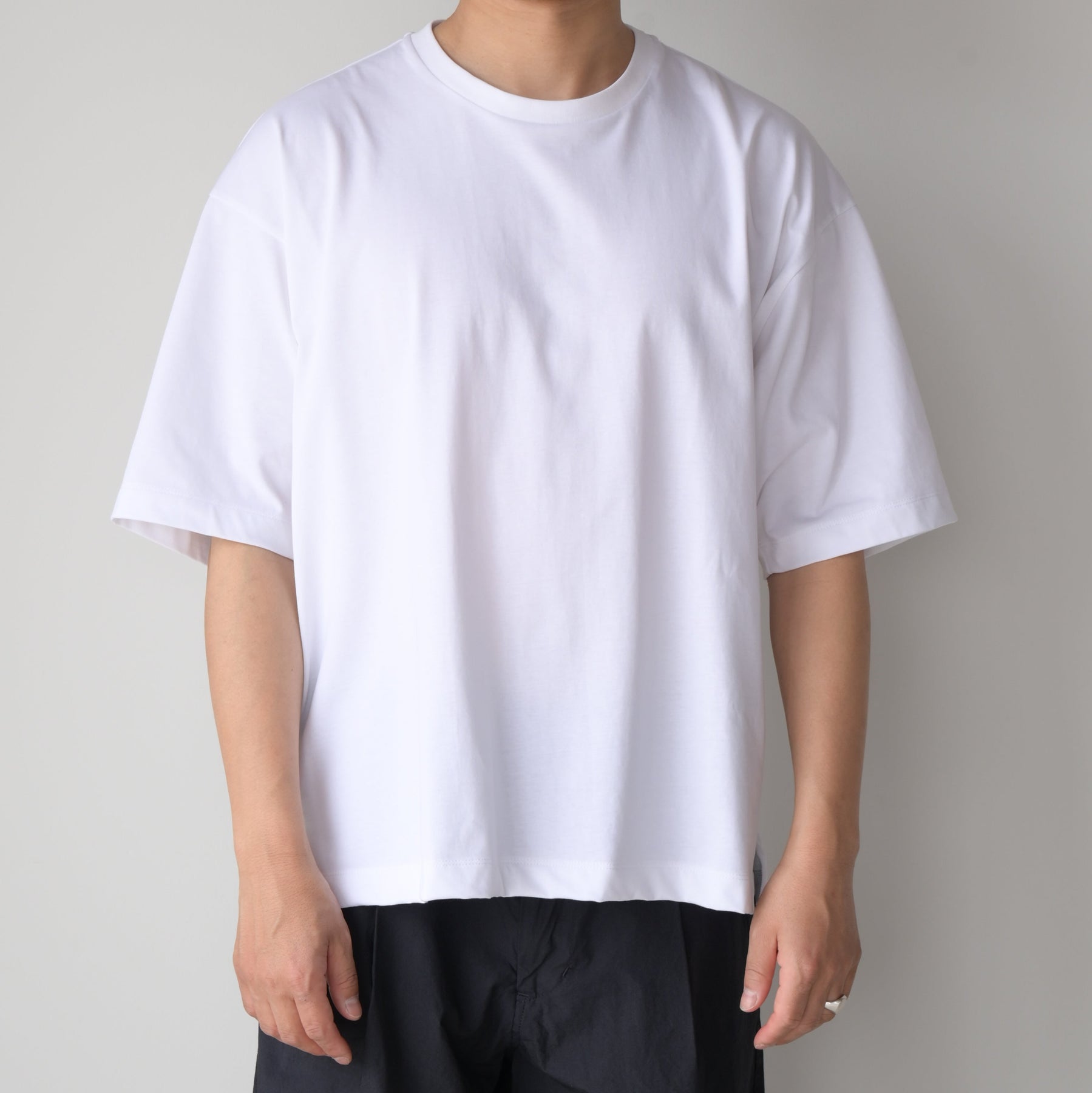 ゆったりとしたシルエットながら、高密度に編み込まれた生地故の上品な風合いがあり、タックパンツなど綺麗めなボトムとも相性が良いTシャツです。