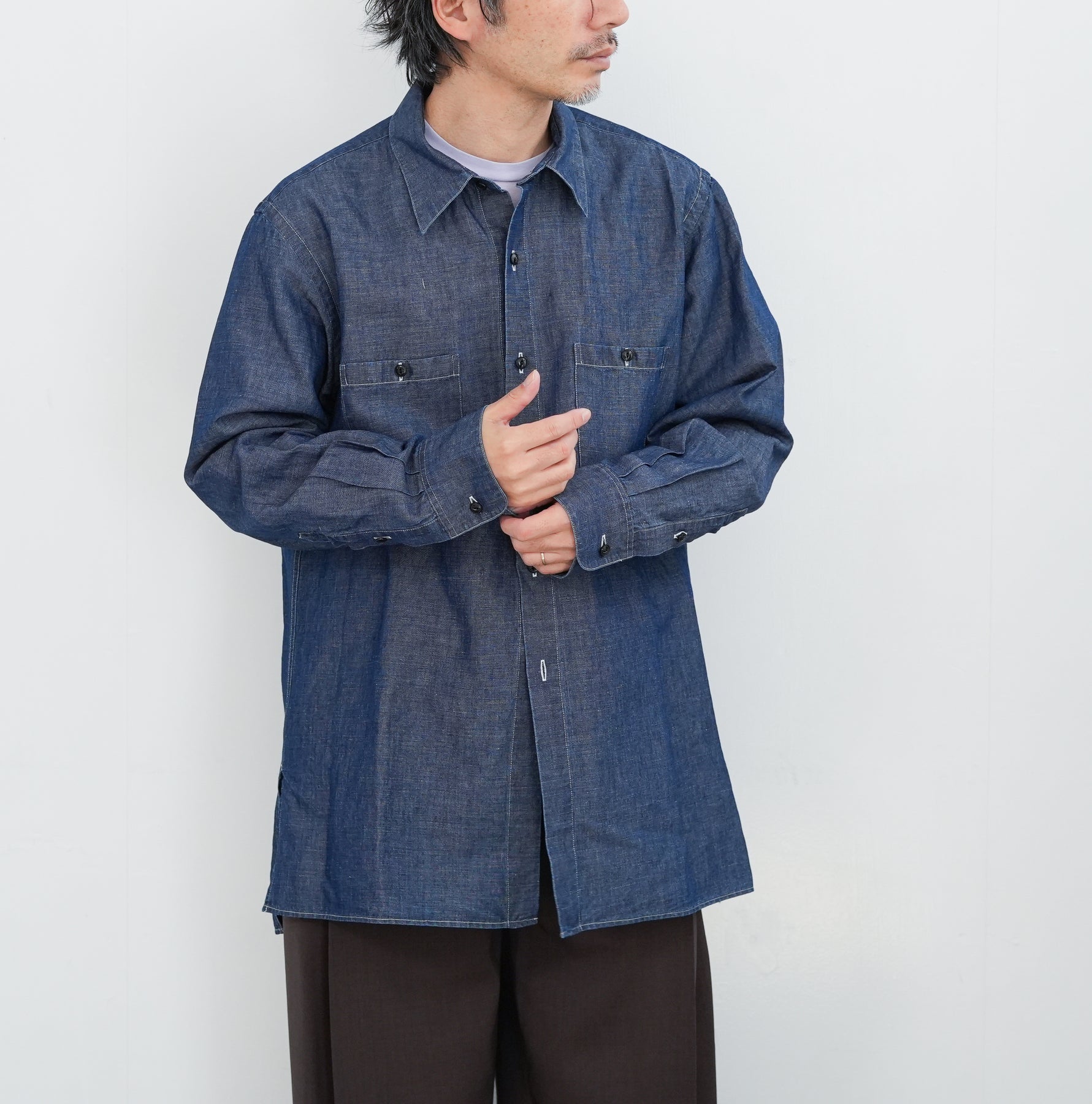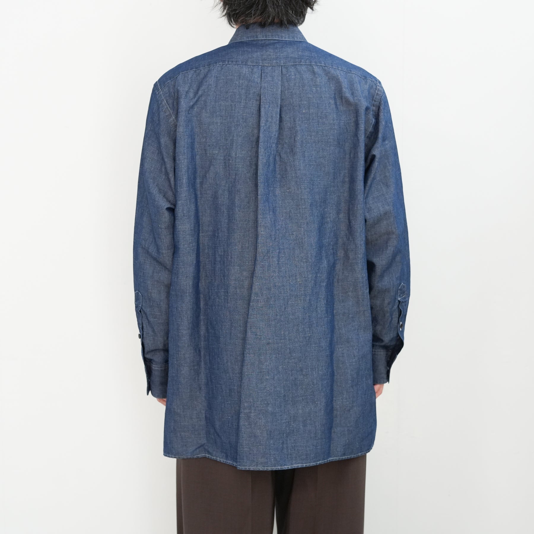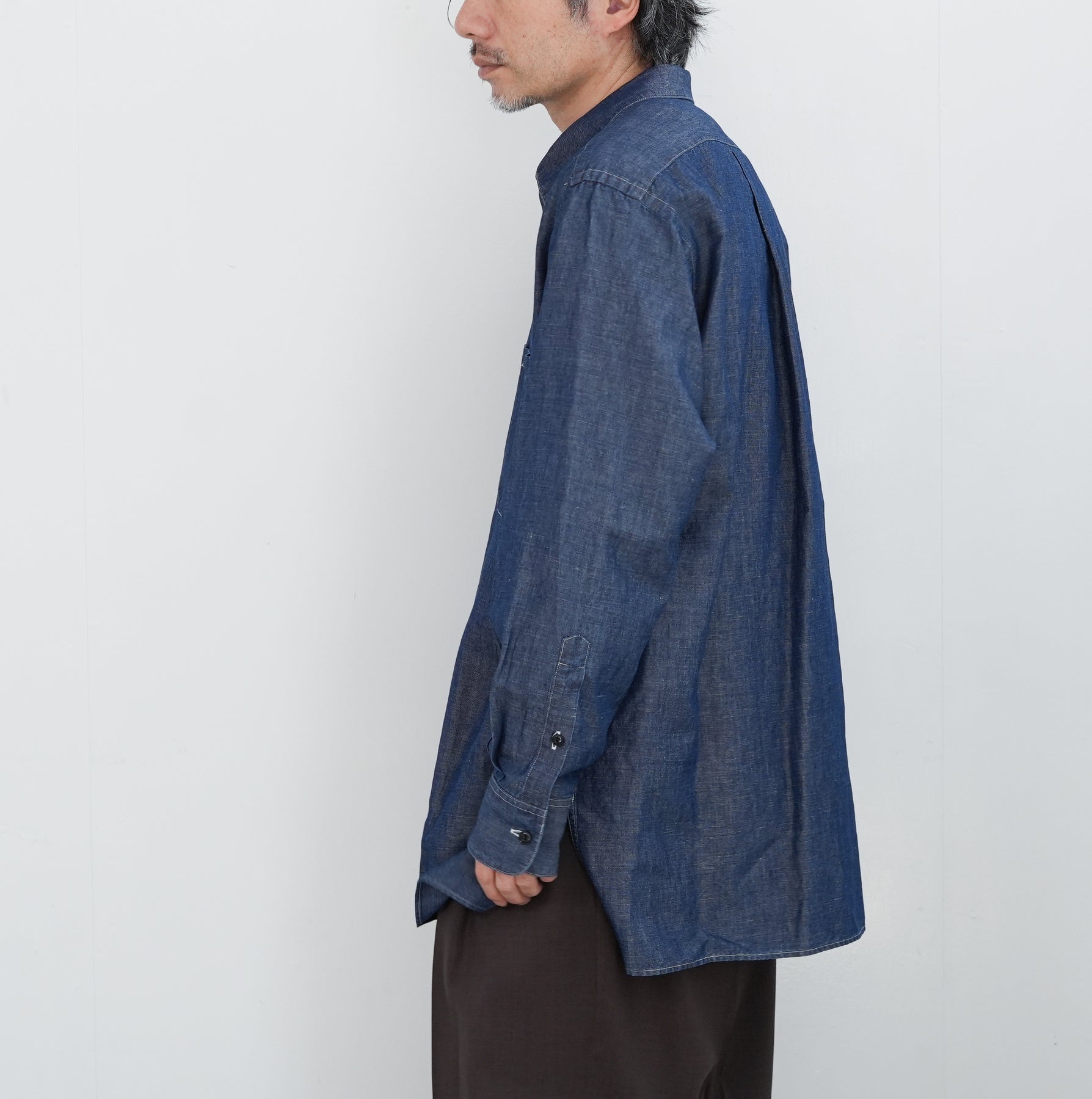 リネンを得意とする機屋にて作成されたイ ンディゴ染料で染めたタテ糸コットンに、ナ チュラルカラーのリネンをヨコ糸に打ち込ん だタンガリー。