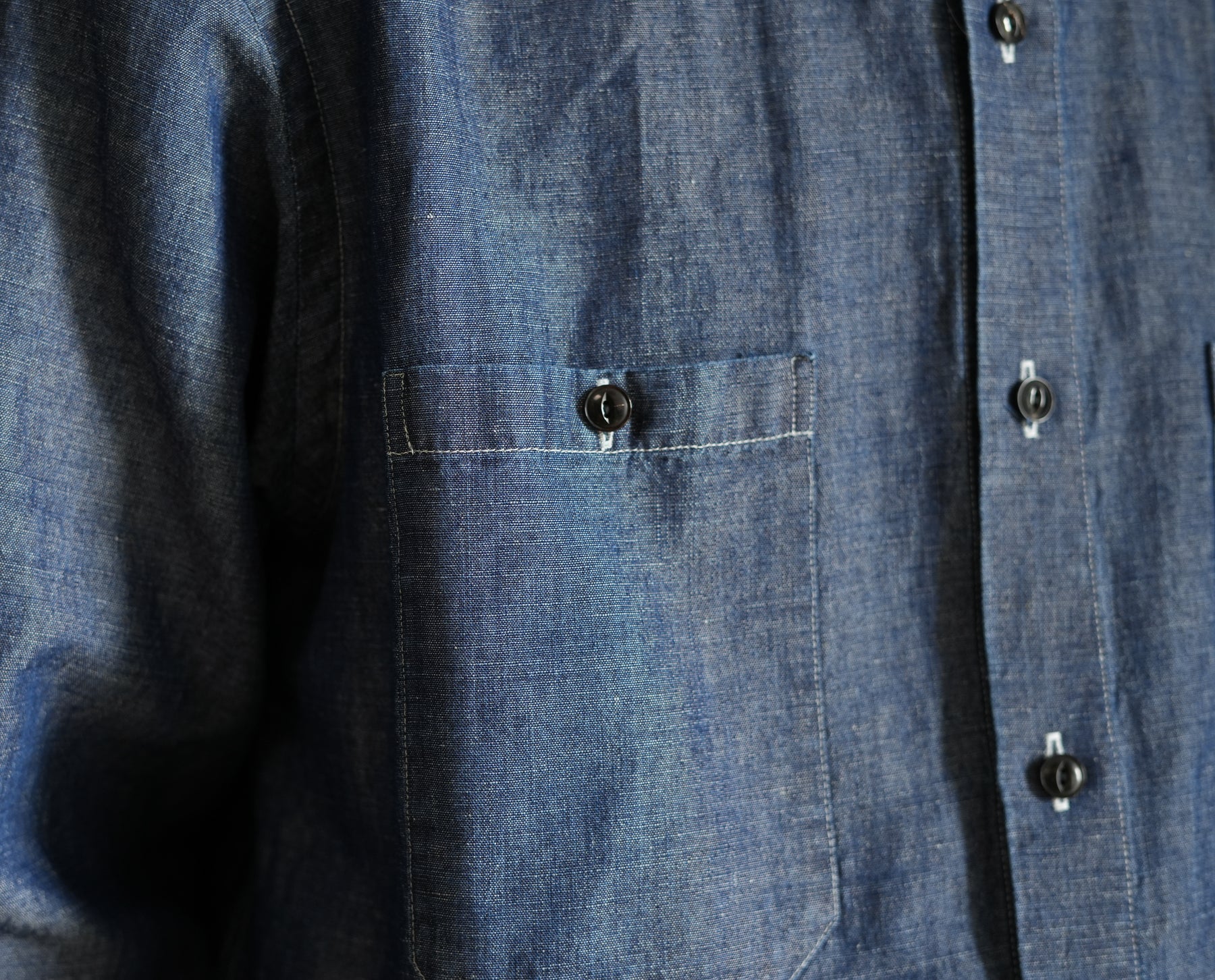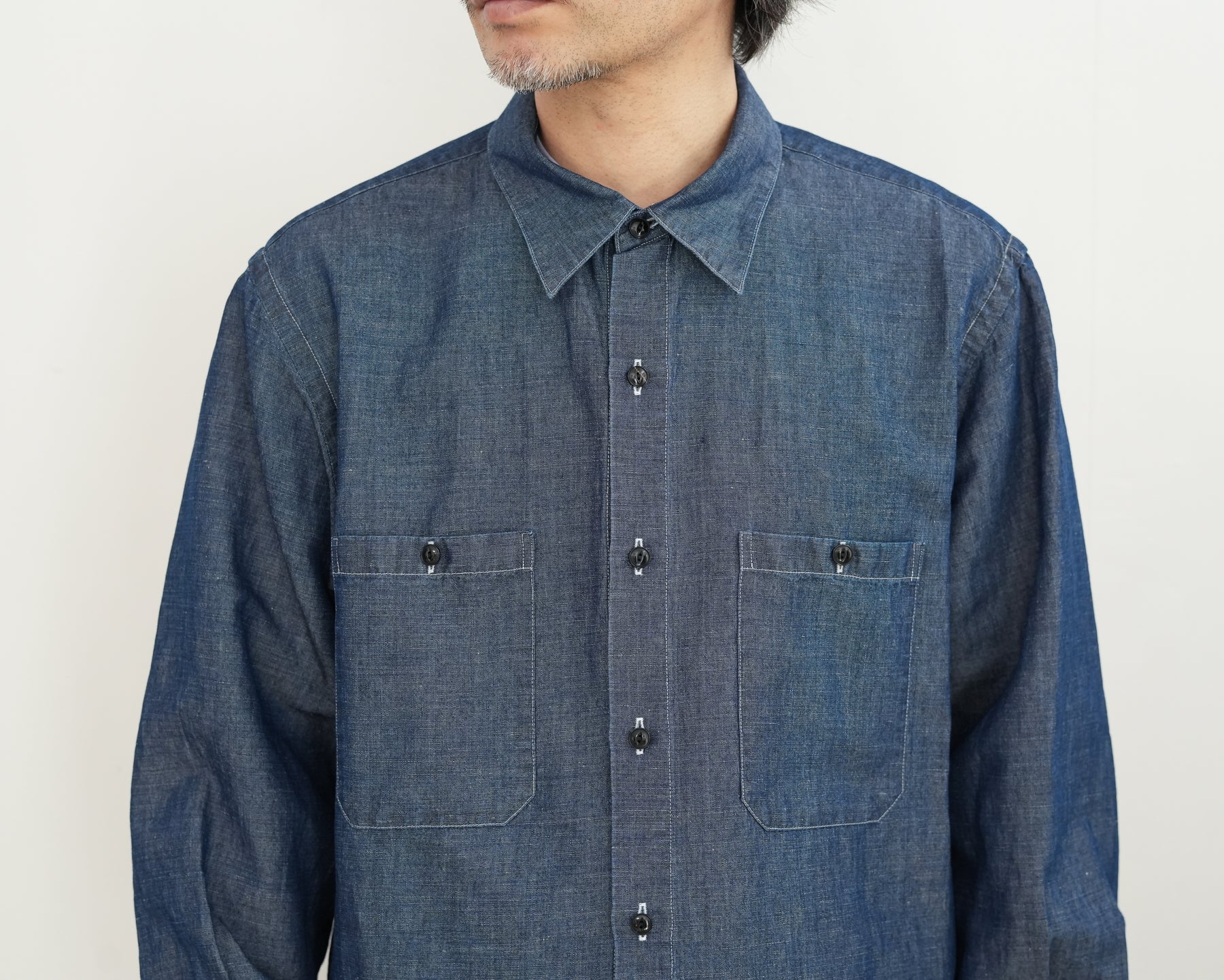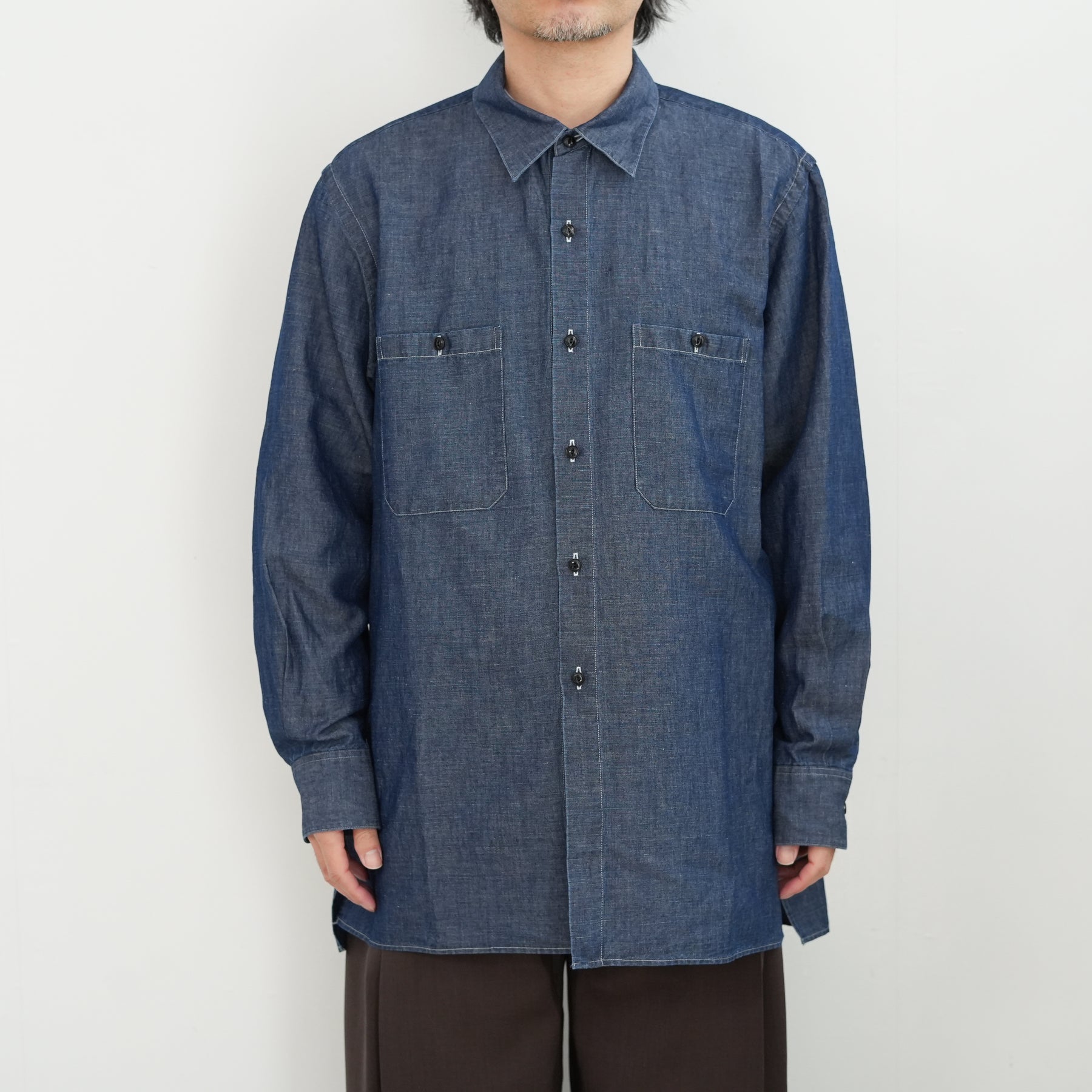 リネンを得意とする機屋にて作成されたイ ンディゴ染料で染めたタテ糸コットンに、ナ チュラルカラーのリネンをヨコ糸に打ち込ん だタンガリー。
