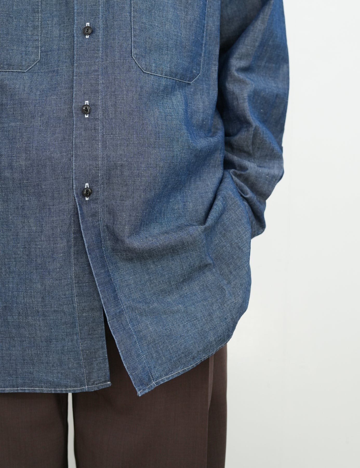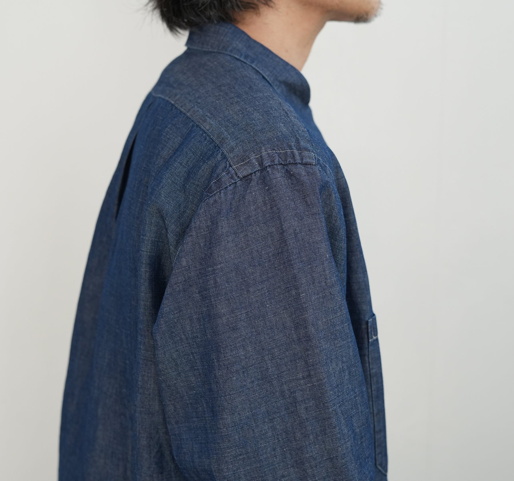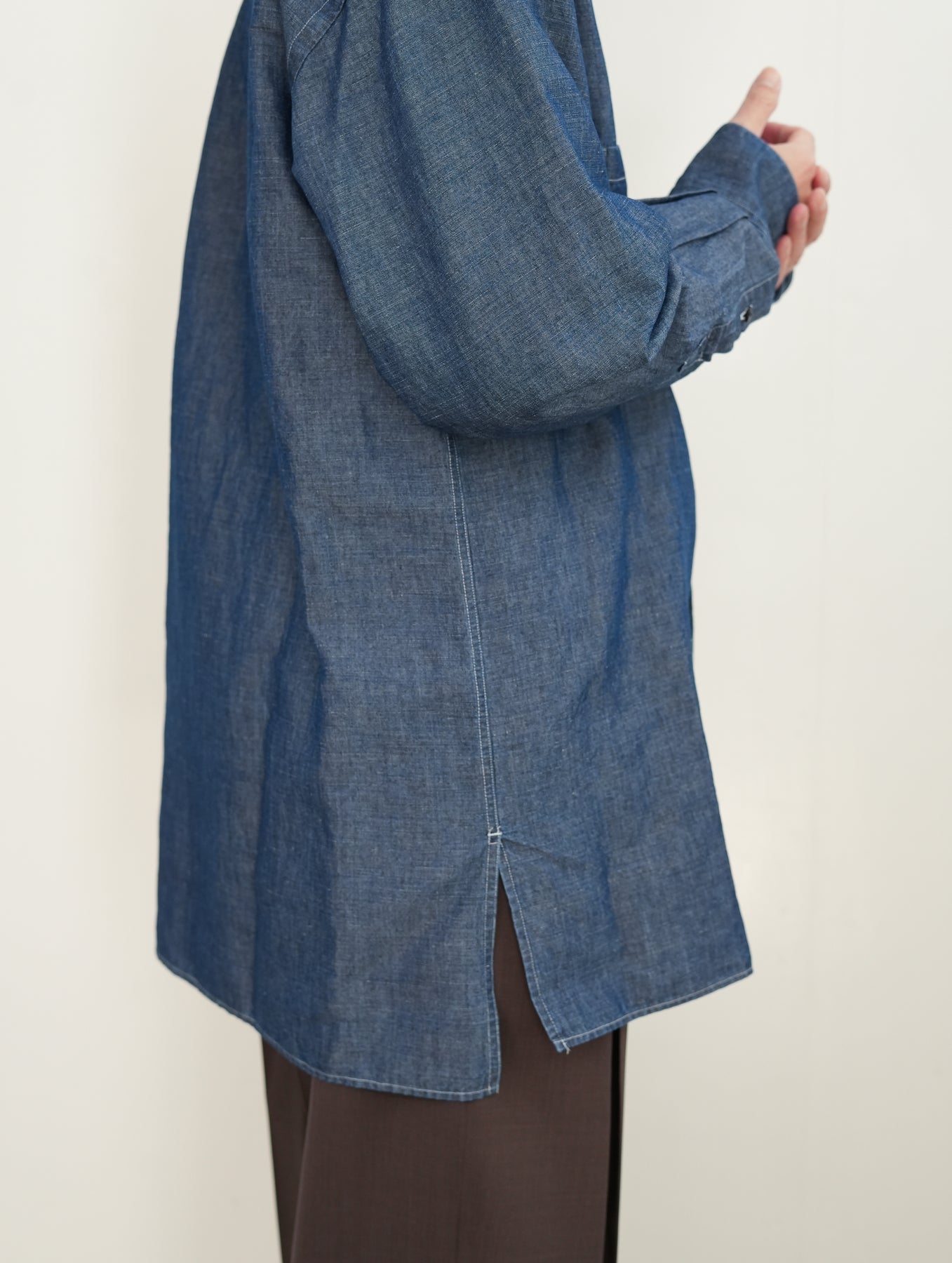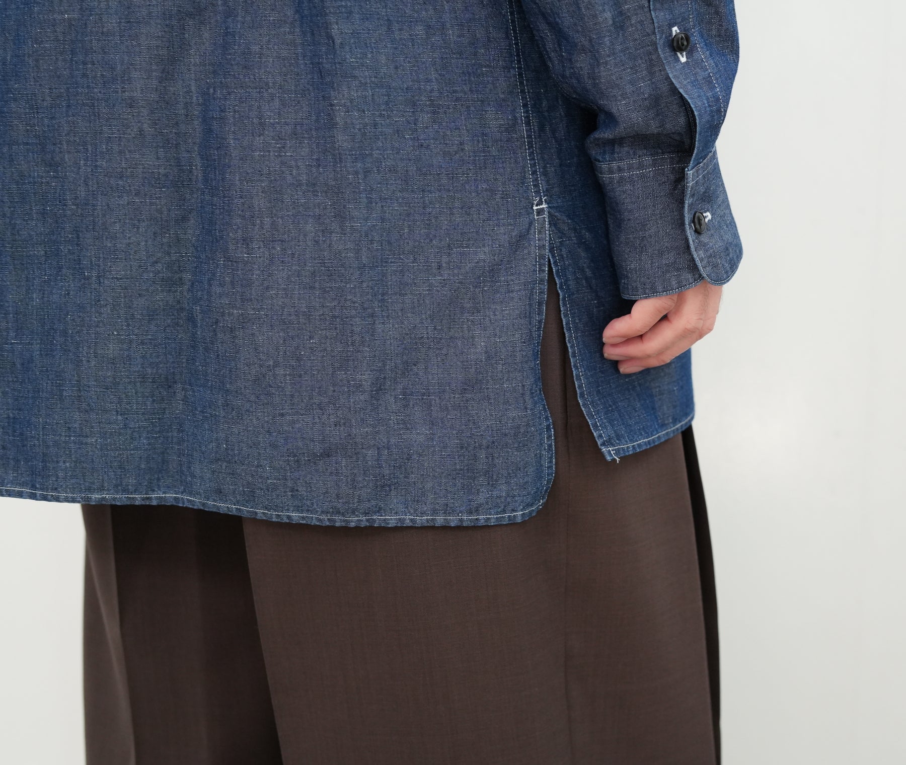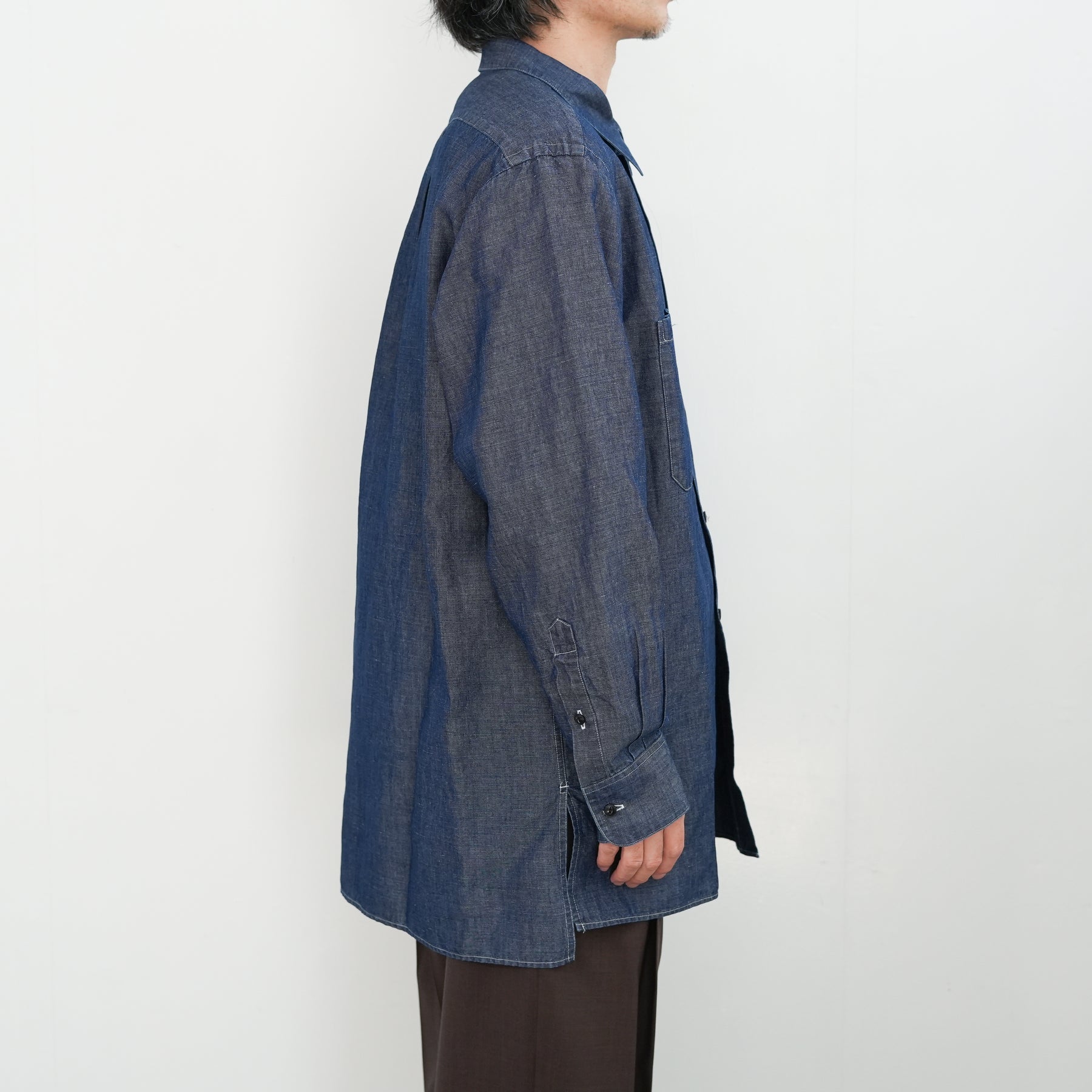 リネンの膨らみと光沢感が上 品な面です。 裾はスクエア型のミリタリーシャツベースの デザインに落とし込み、カジュアル過ぎず に着られるようにしています。
