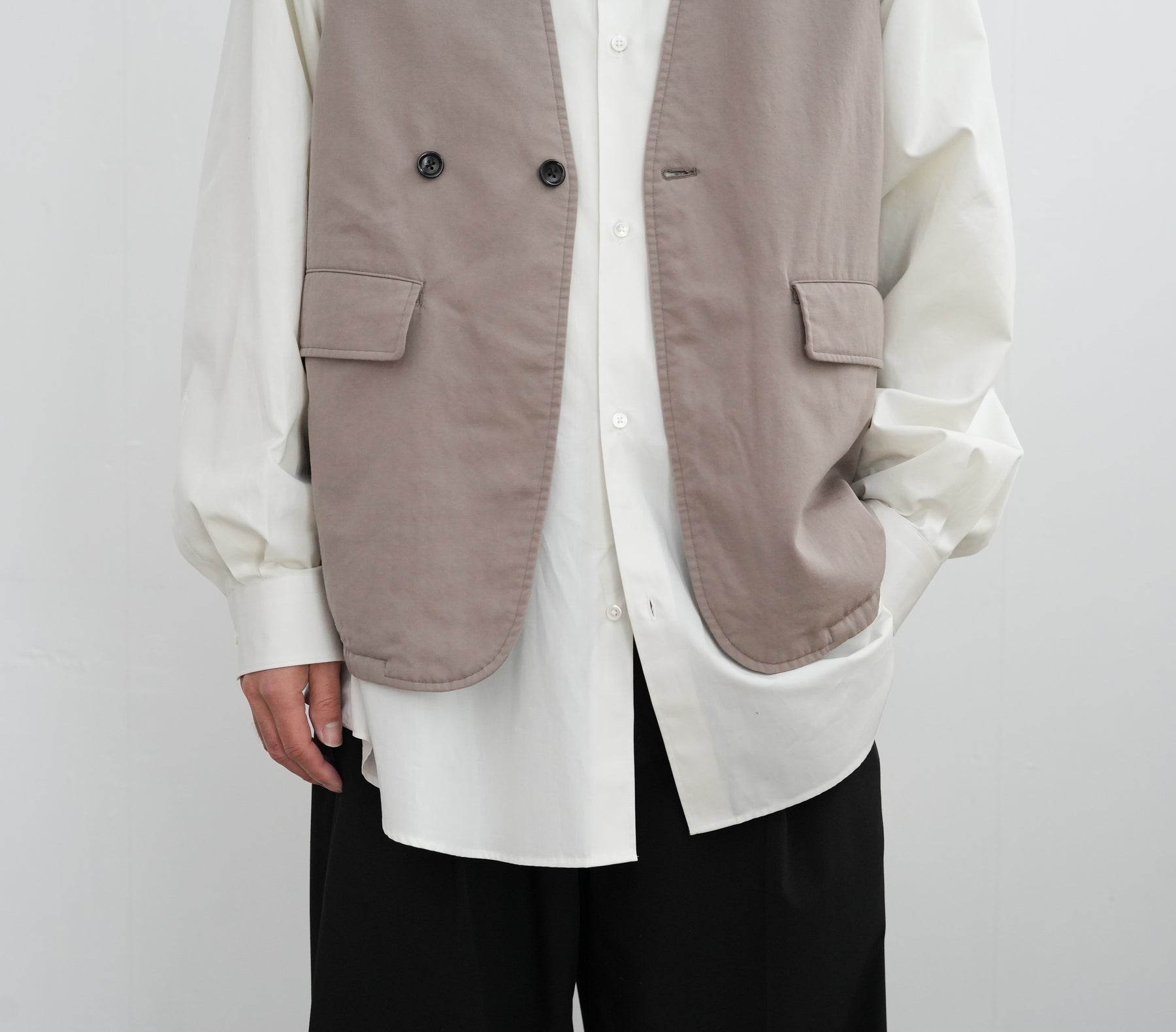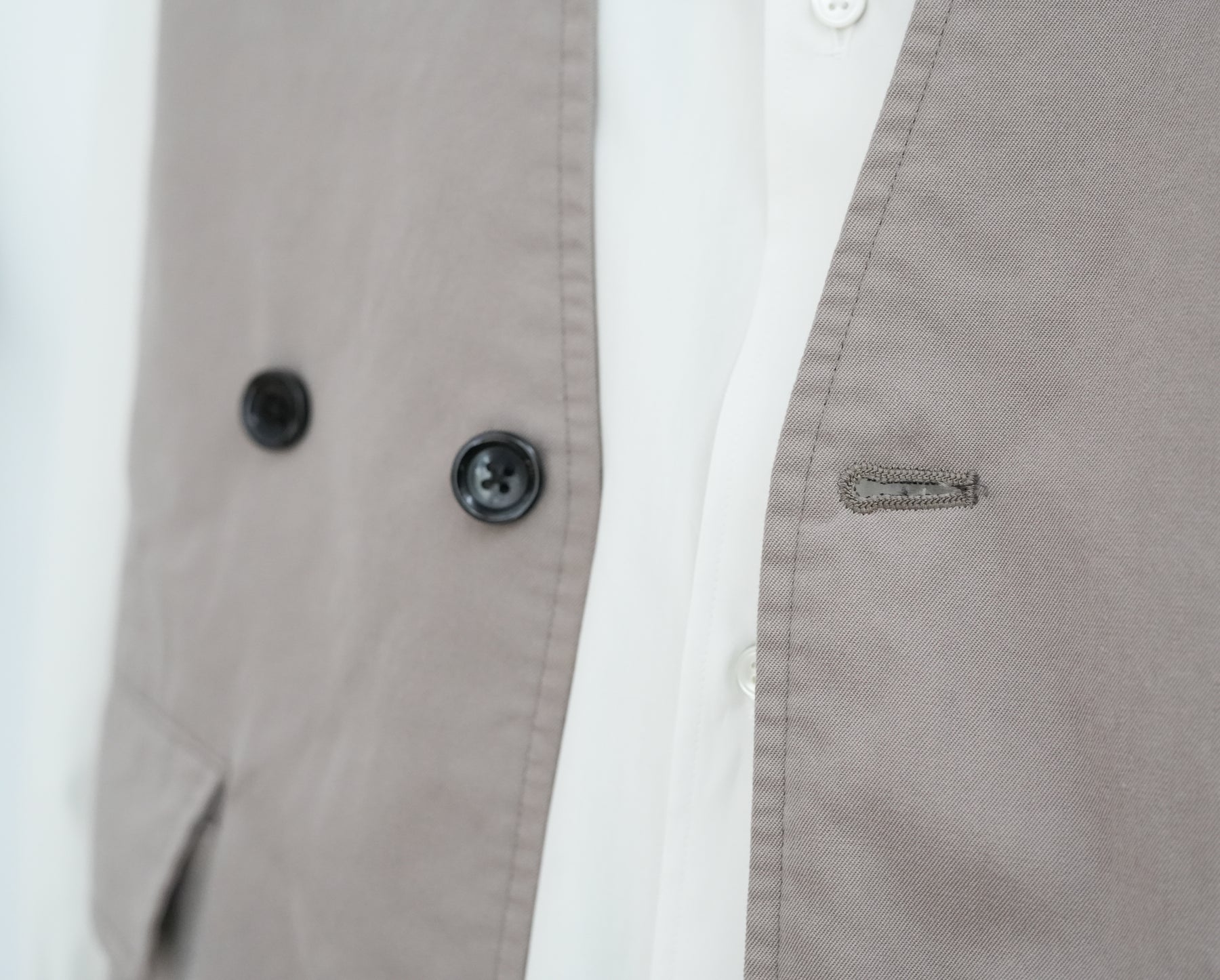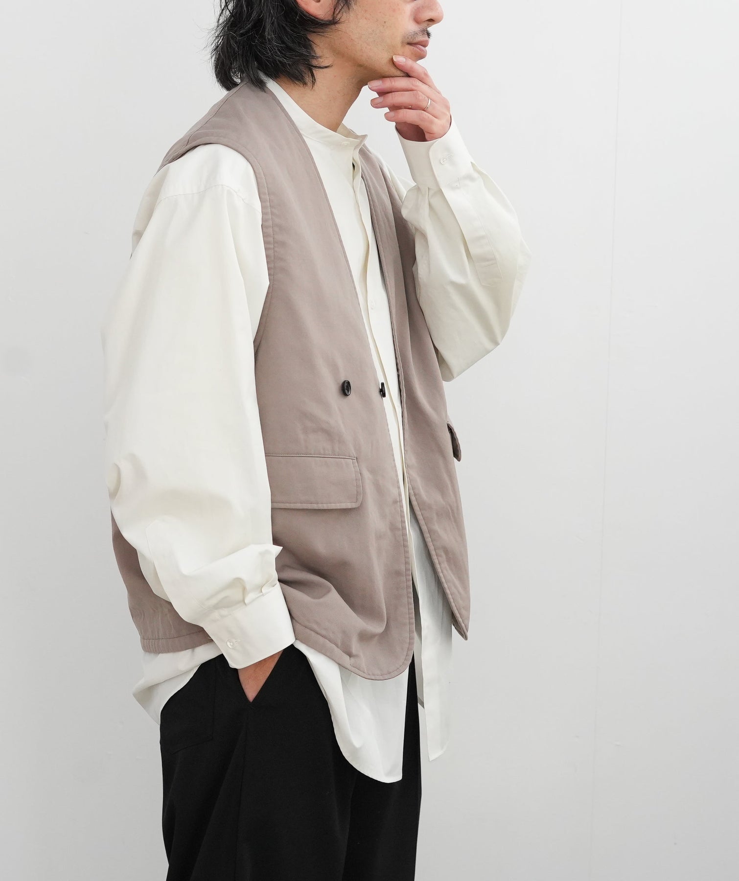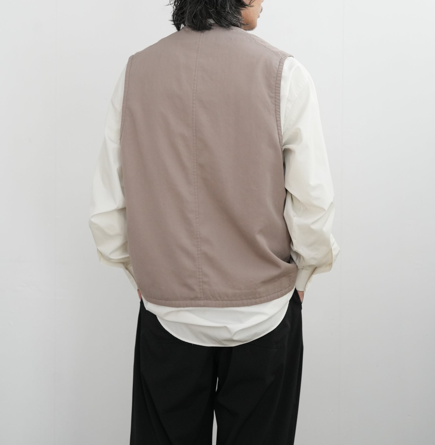 ボタンの留め方次第で多彩な表情を見せるベスト。同素材のジャケットとのセットアップはもちろん、単品でも活躍。縦糸と横糸の密度設計によって綾目をシャープに際立たせ、ハリ感とドレープ性を兼ね備えたオリジナルウールツイルを使用。スケール改質処理により綾目が一層クリアに浮かび上がり、染色性の向上によって深みのある陰影と独特の風合いを実現。製品に施した縮絨加工によって生まれる歪みやシワ、擦れやアタリが唯一無二の表情を生み出し、1点ごとに異なる風合いを楽しめます。