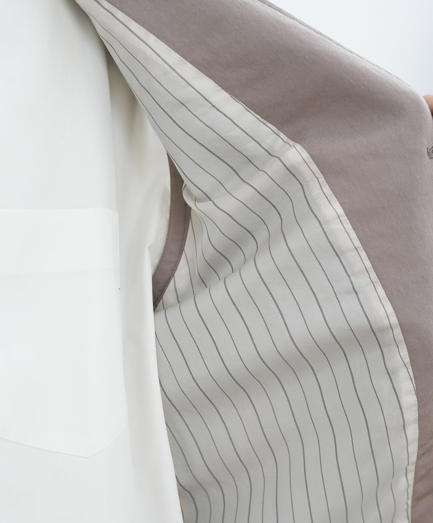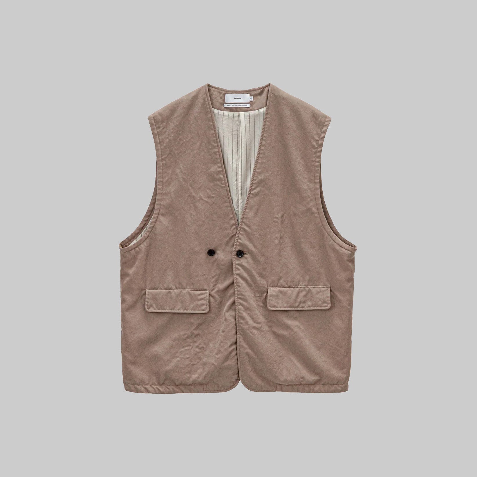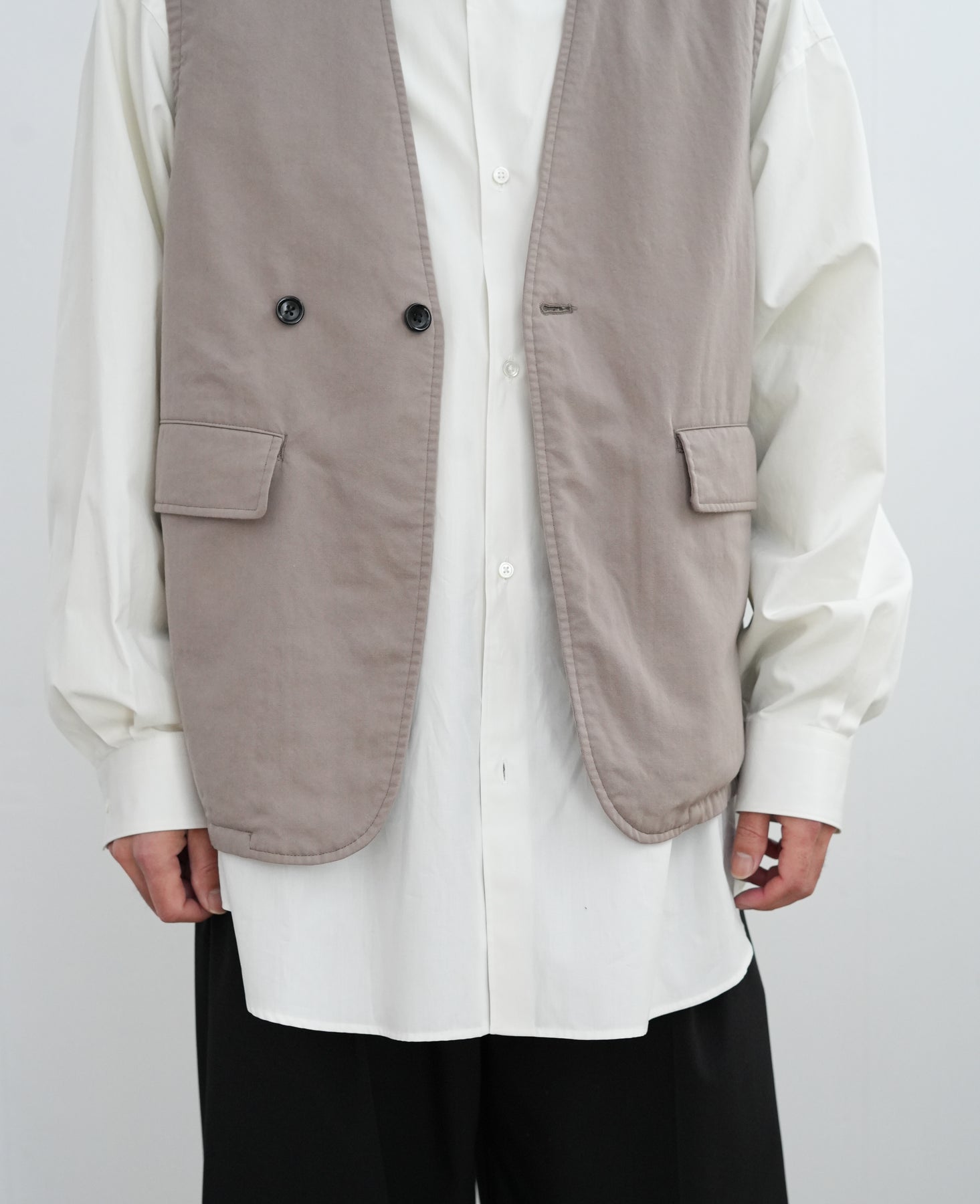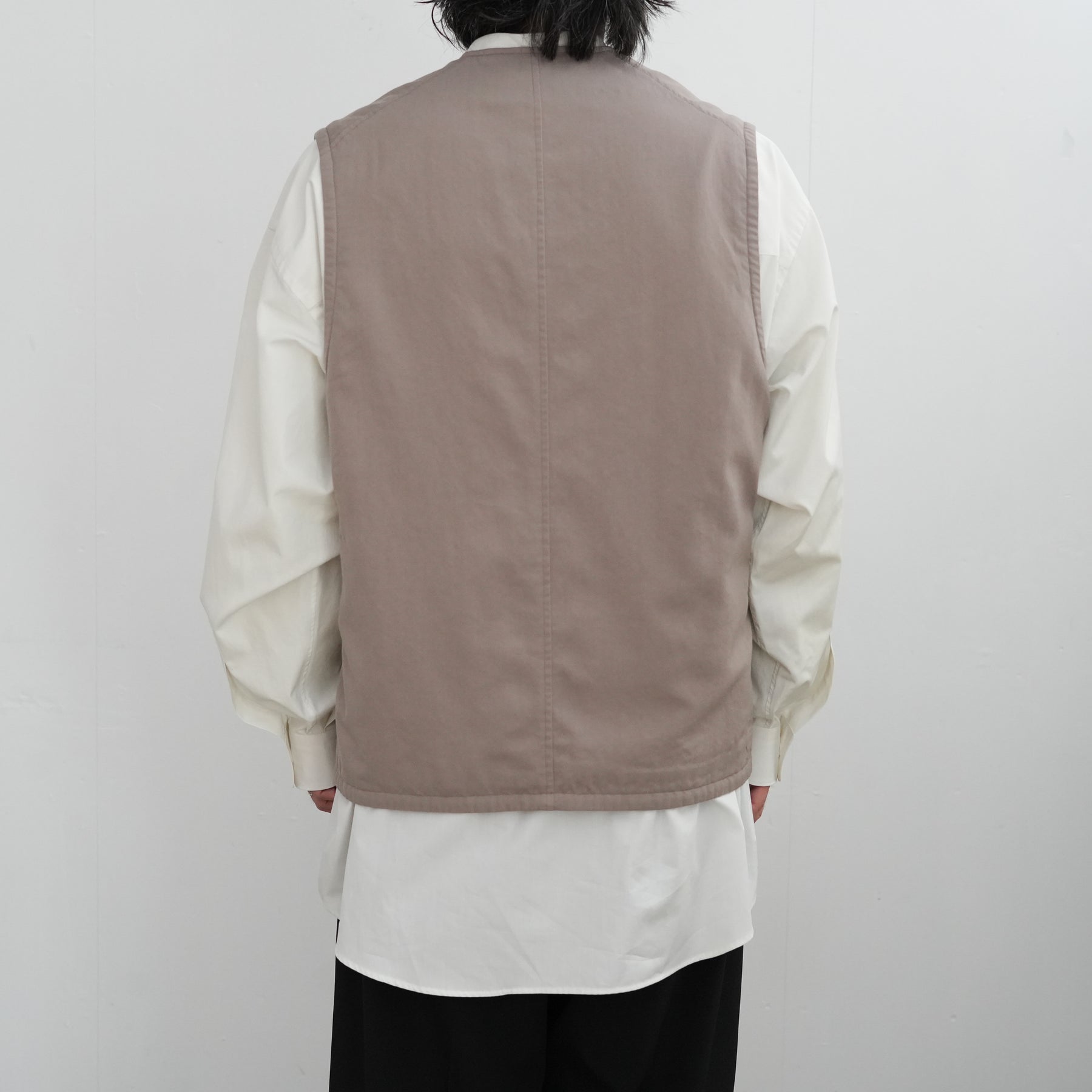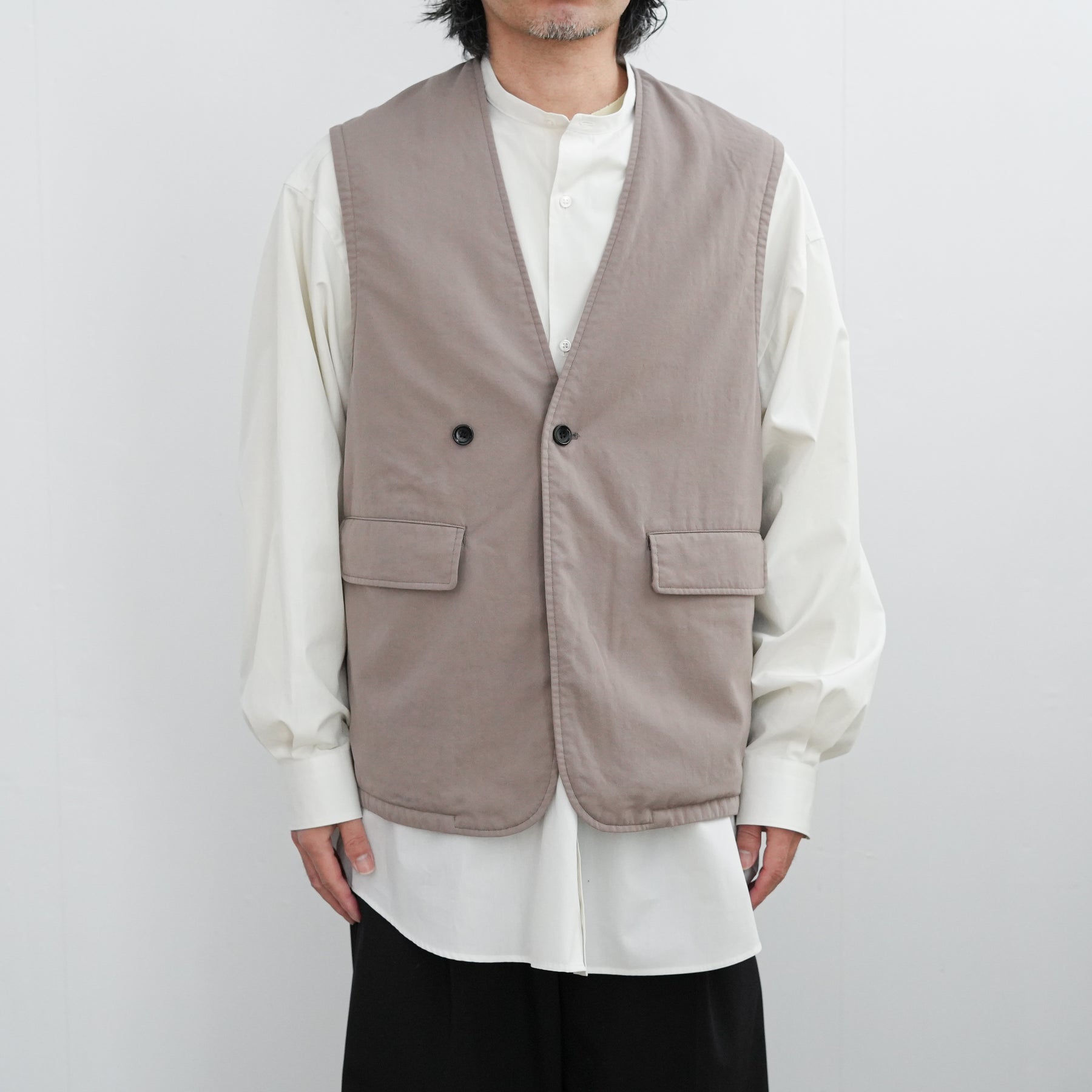 ボタンの留め方次第で多彩な表情を見せるベスト。同素材のジャケットとのセットアップはもちろん、単品でも活躍。縦糸と横糸の密度設計によって綾目をシャープに際立たせ、ハリ感とドレープ性を兼ね備えたオリジナルウールツイルを使用。スケール改質処理により綾目が一層クリアに浮かび上がり、染色性の向上によって深みのある陰影と独特の風合いを実現。製品に施した縮絨加工によって生まれる歪みやシワ、擦れやアタリが唯一無二の表情を生み出し、1点ごとに異なる風合いを楽しめます。