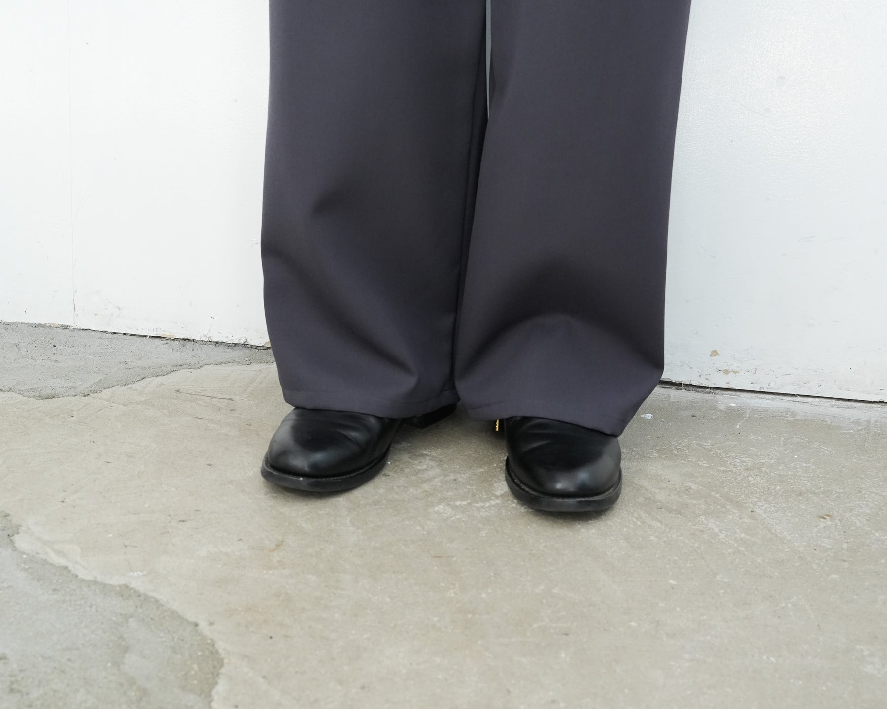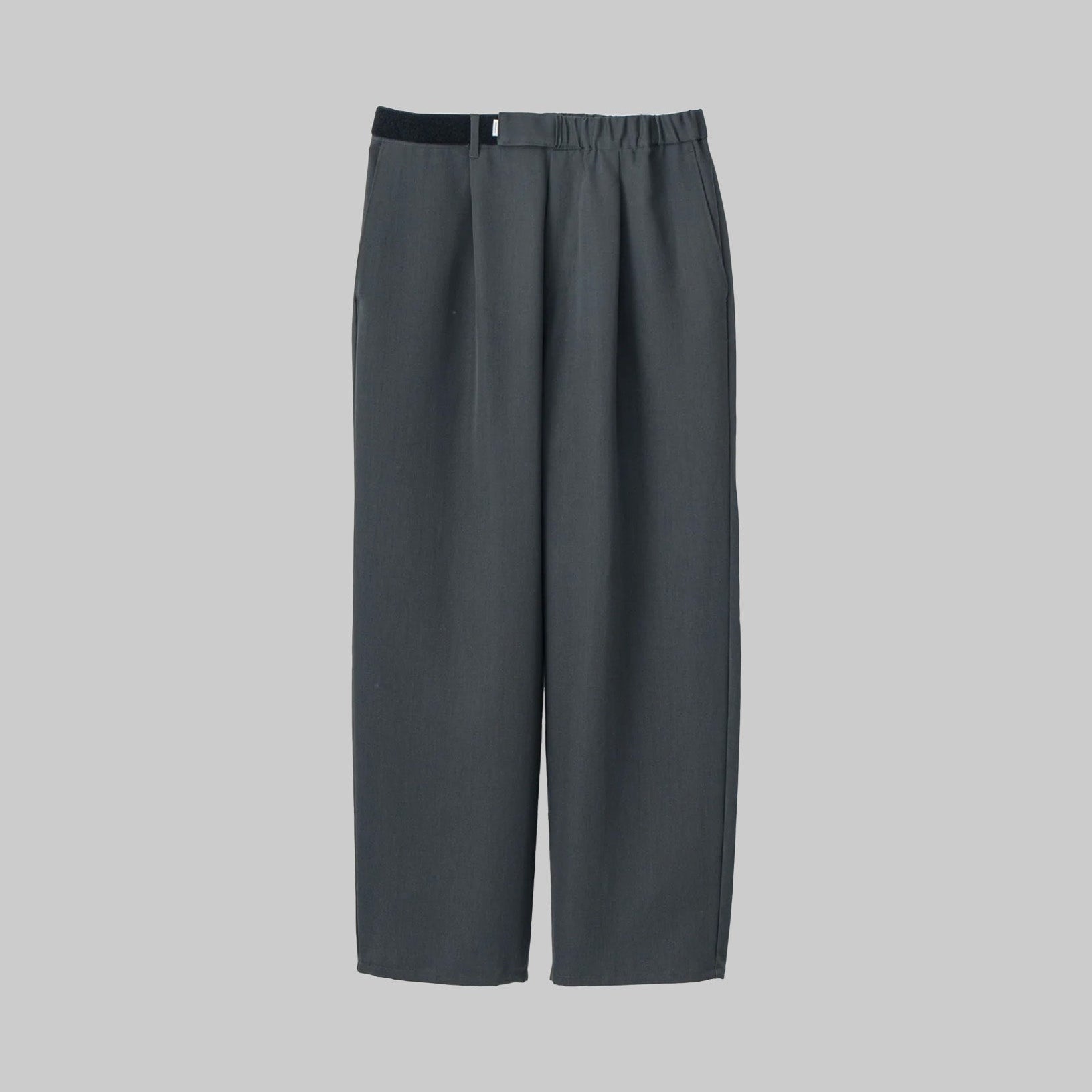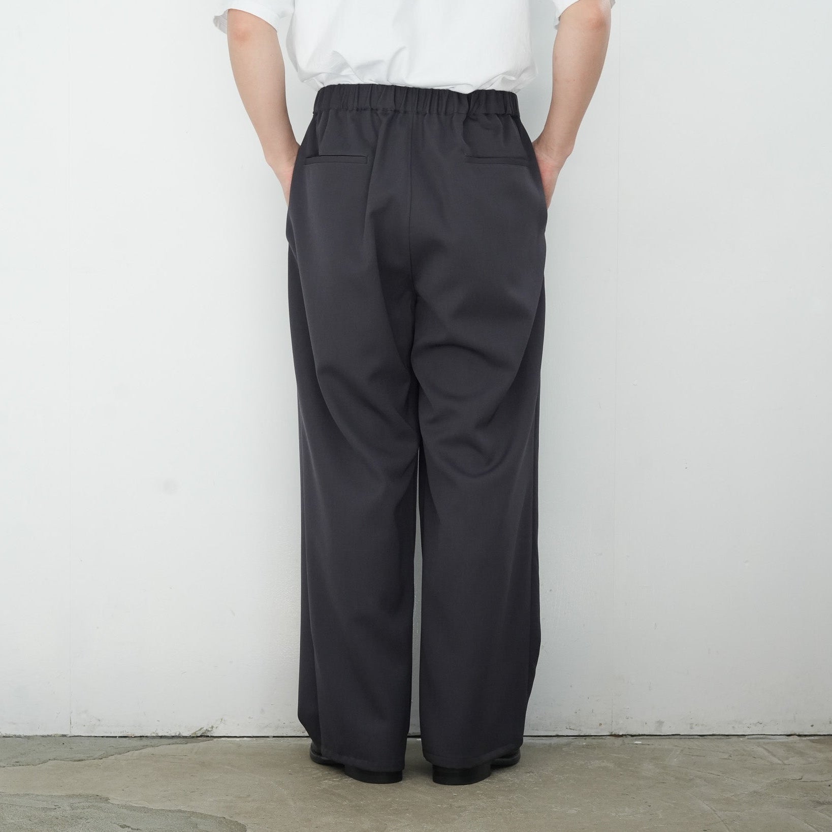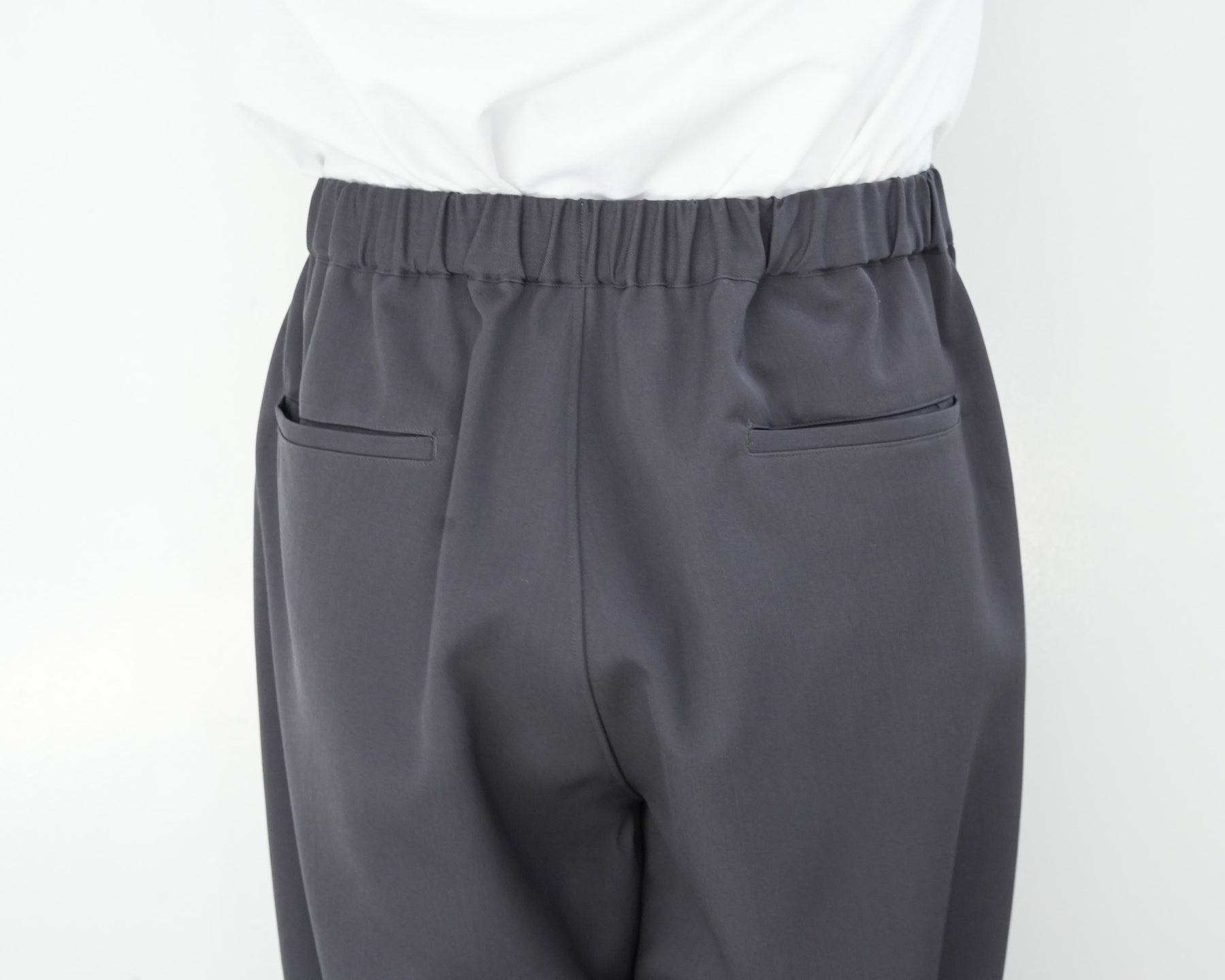 フランスのシェフパンツをべースにしたGraphpaper定番のボリュームのあるワイドパンツ。ウエストのサイズを簡単に調整できてシルエットもアレンジ可能です。縦糸と横糸のバランスに徹底的にこだわり製作したウールギャバジン素材。美しい綾目と程良いハリ感、しなやかなドレープ感が特徴です。特殊な樹脂をウール繊維の内部まで染み込ませることでフィラメントのような光沢とクリアな質感に仕上げています。
