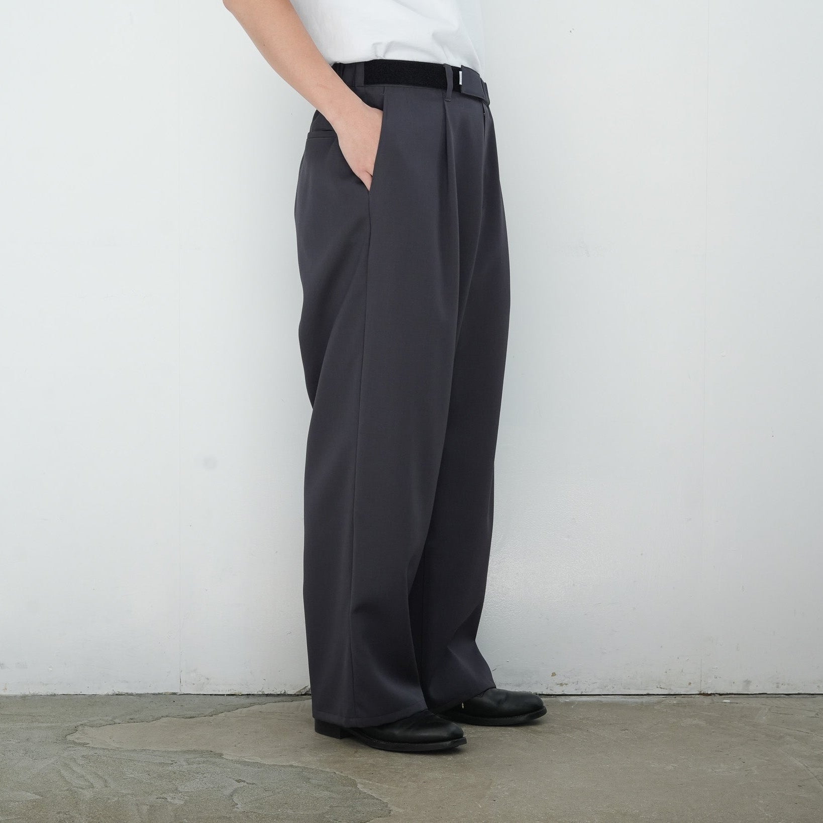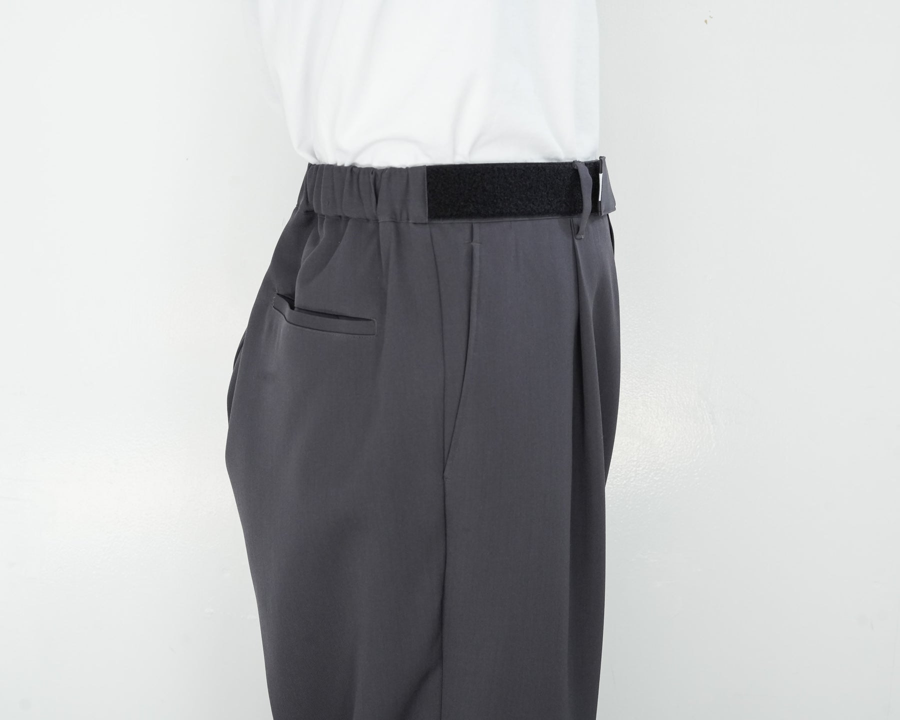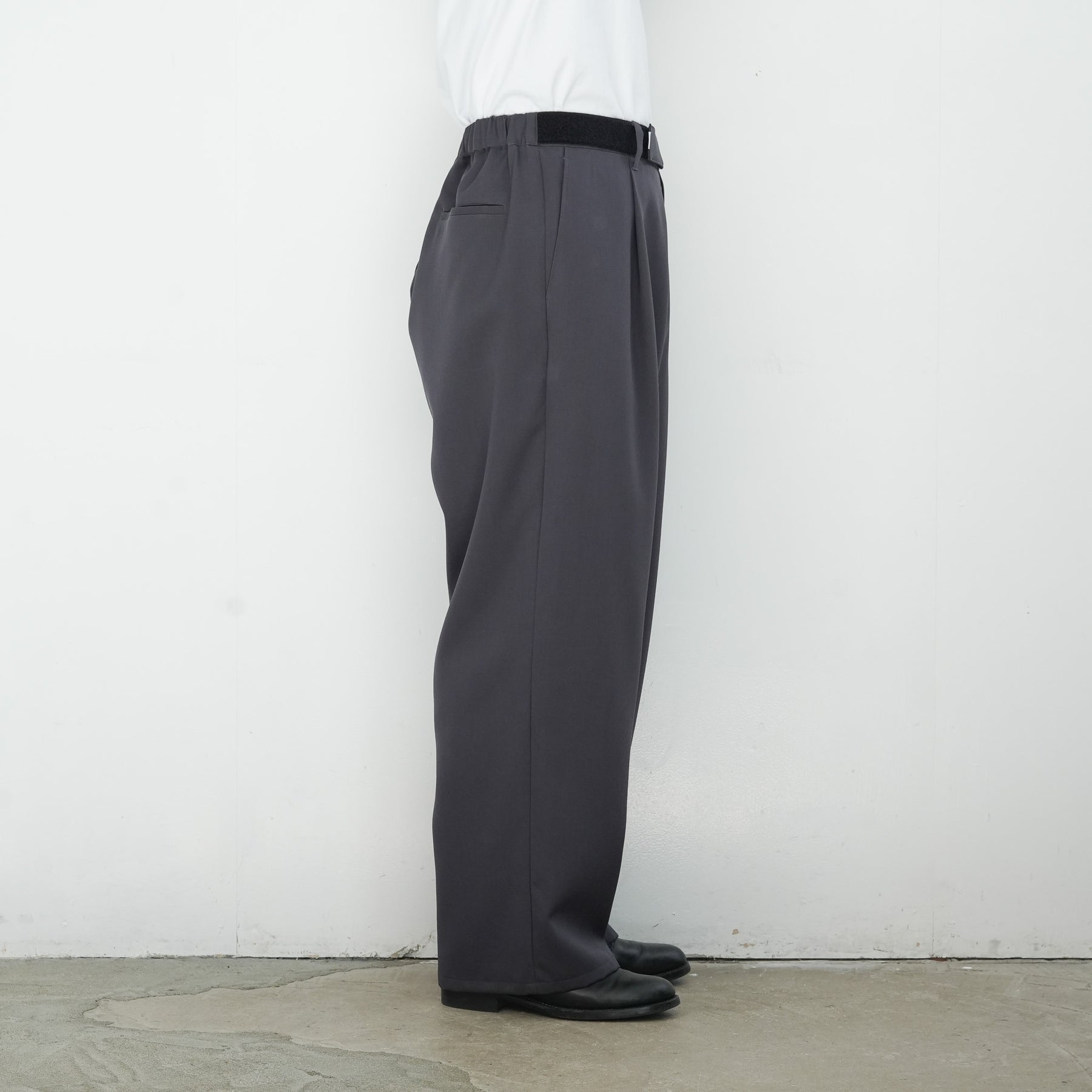 フランスのシェフパンツをべースにしたGraphpaper定番のボリュームのあるワイドパンツ。ウエストのサイズを簡単に調整できてシルエットもアレンジ可能です。縦糸と横糸のバランスに徹底的にこだわり製作したウールギャバジン素材。美しい綾目と程良いハリ感、しなやかなドレープ感が特徴です。特殊な樹脂をウール繊維の内部まで染み込ませることでフィラメントのような光沢とクリアな質感に仕上げています。