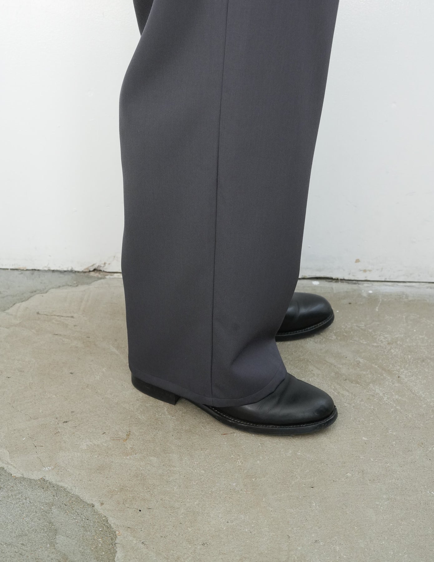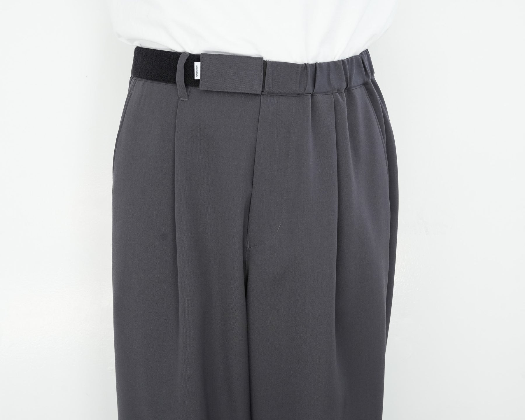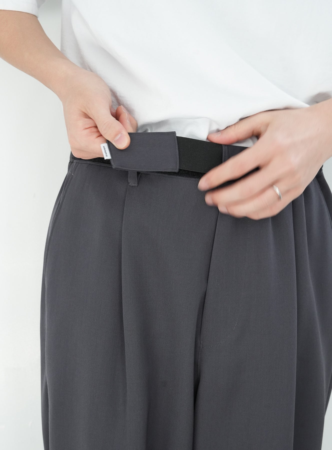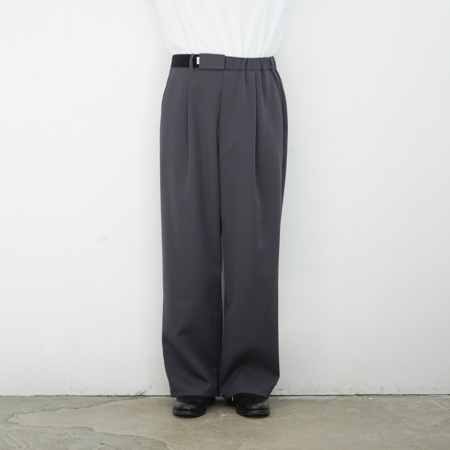 フランスのシェフパンツをべースにしたGraphpaper定番のボリュームのあるワイドパンツ。ウエストのサイズを簡単に調整できてシルエットもアレンジ可能です。縦糸と横糸のバランスに徹底的にこだわり製作したウールギャバジン素材。美しい綾目と程良いハリ感、しなやかなドレープ感が特徴です。特殊な樹脂をウール繊維の内部まで染み込ませることでフィラメントのような光沢とクリアな質感に仕上げています。