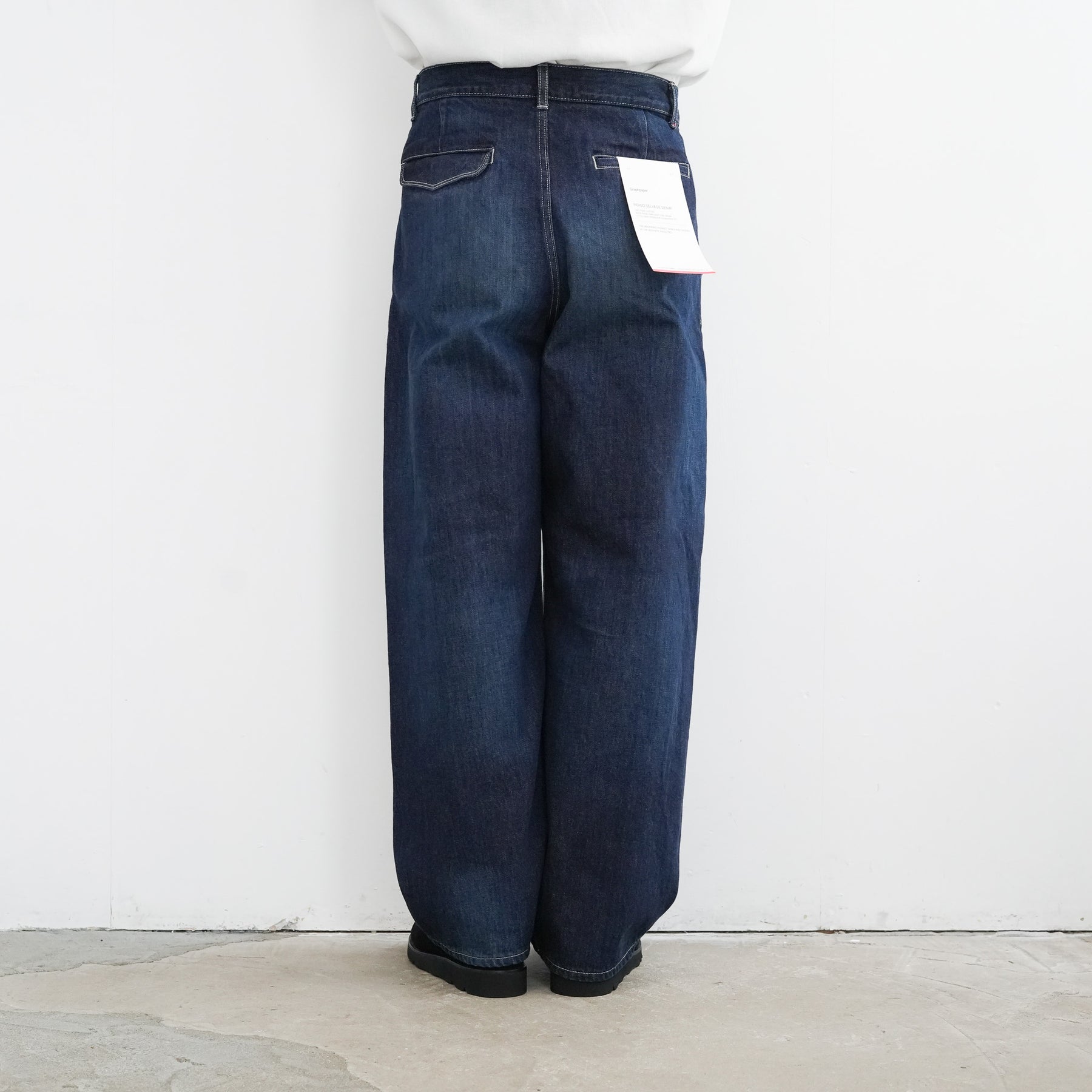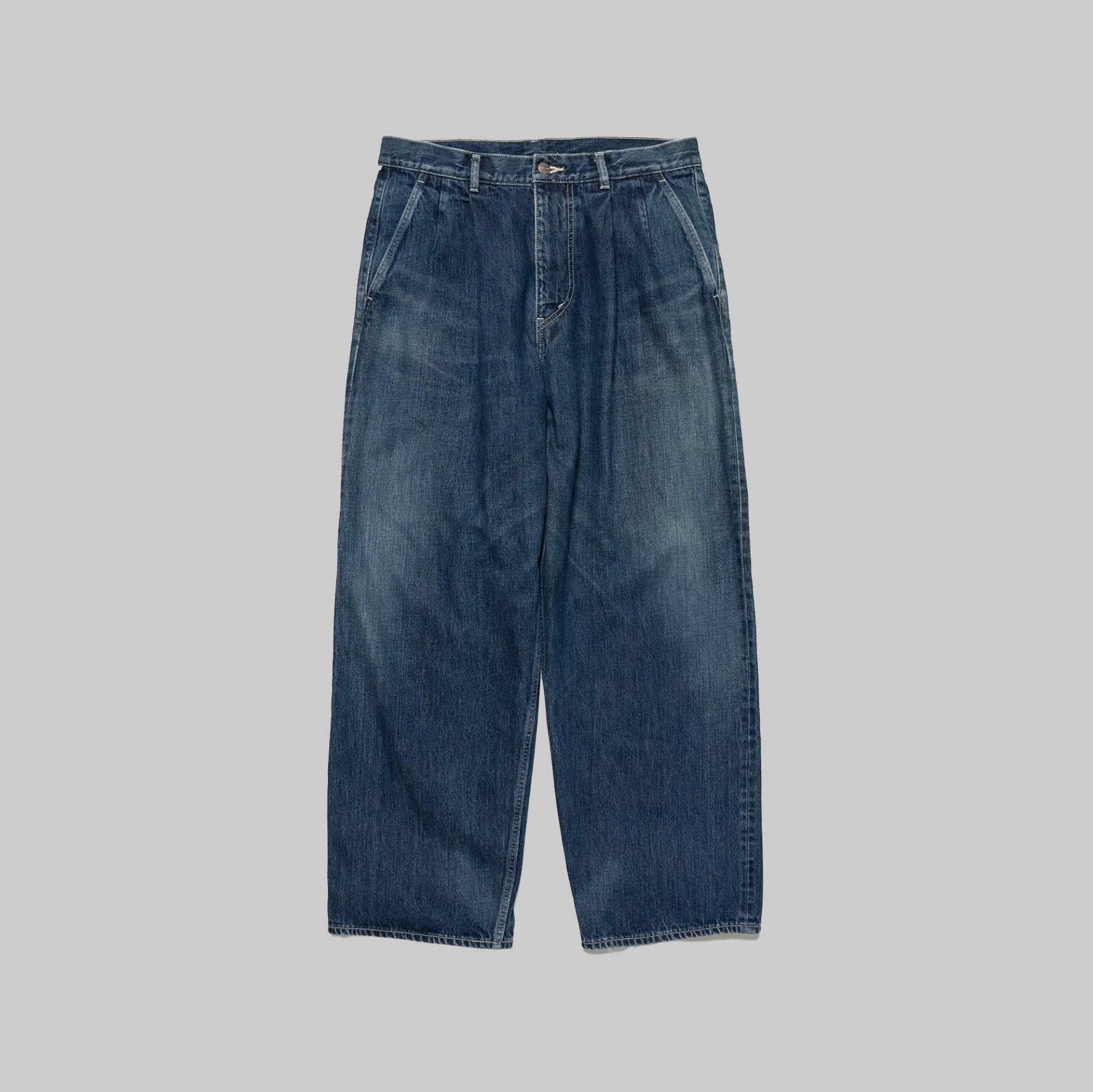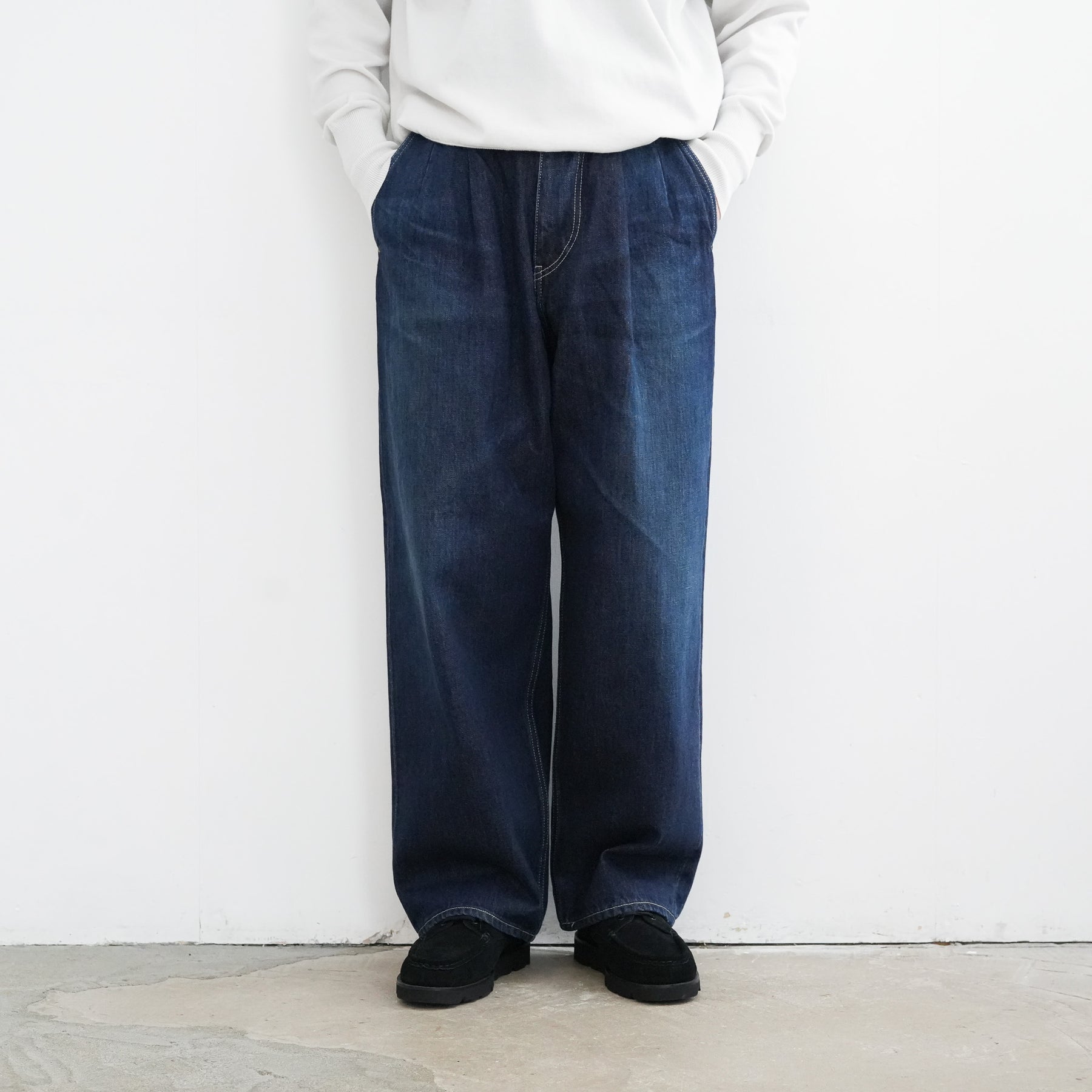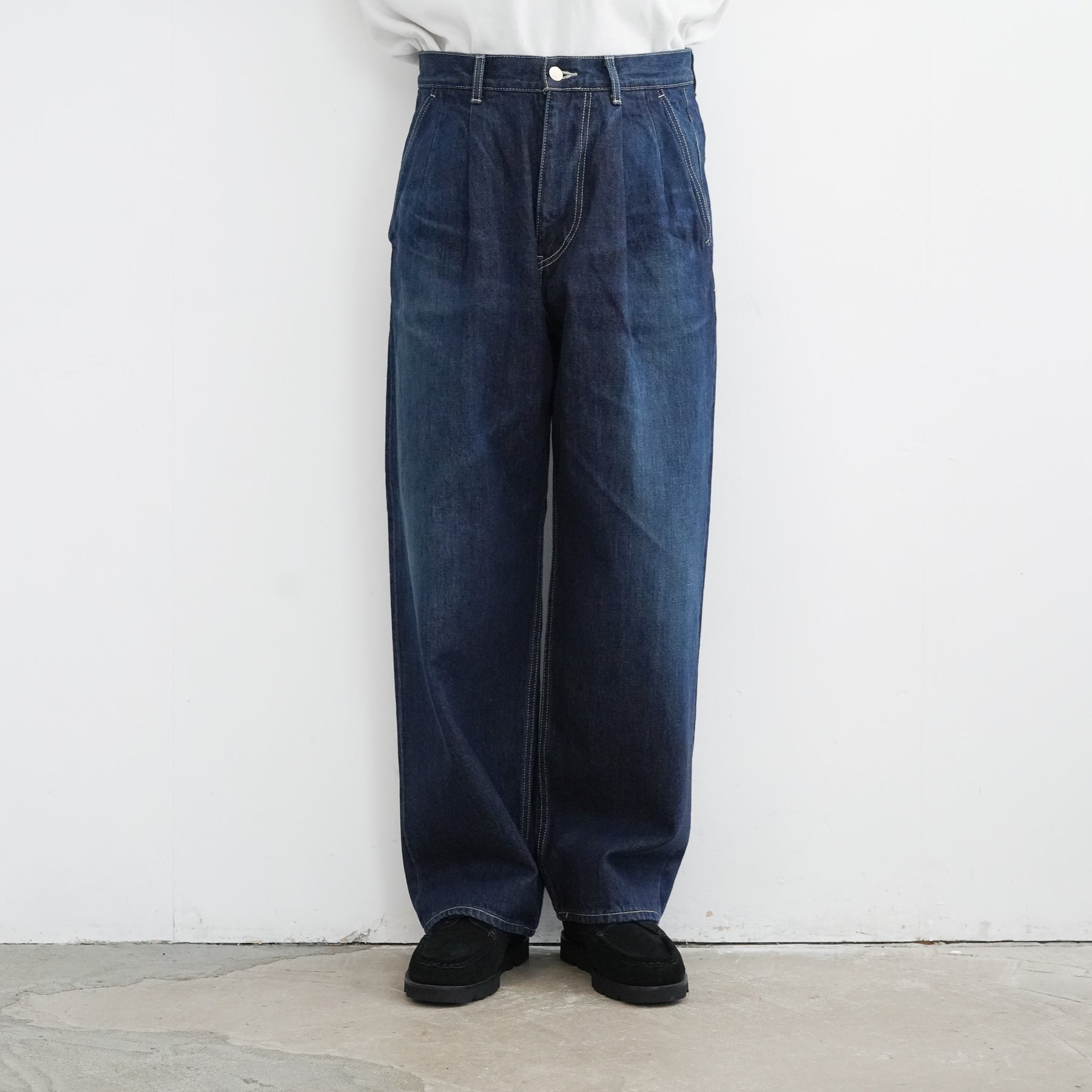 130年もの歴史を誇る米国Cone Denim社が作る13.75オンスのセルビッチデニム。ウエストにはタックが入り、ヒップからワタリにかけて適度な余裕があるワイドストレートパンツ。旧式力織機でゆっくりと織り上げることで生まれる、生地表面のざらっとした凹凸やムラがデニム本来の風合いを感じさせる魅力的な素材。ダークフェイドはメリハリのある濃淡が特徴です。