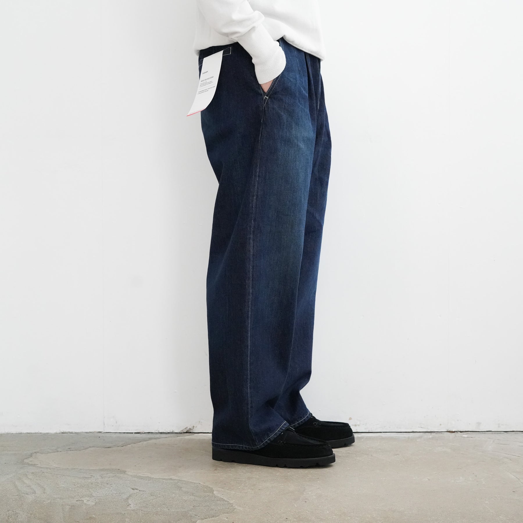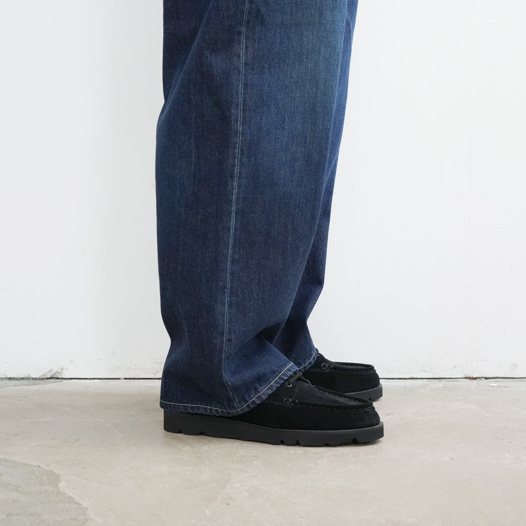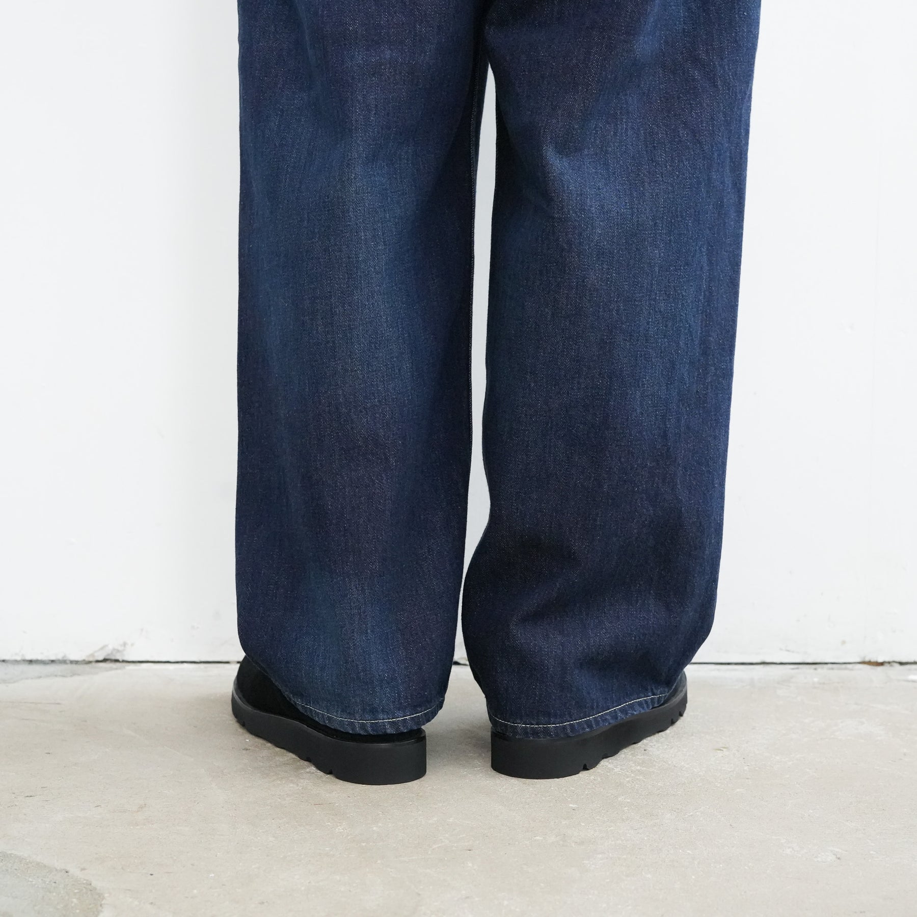 130年もの歴史を誇る米国Cone Denim社が作る13.75オンスのセルビッチデニム。ウエストにはタックが入り、ヒップからワタリにかけて適度な余裕があるワイドストレートパンツ。旧式力織機でゆっくりと織り上げることで生まれる、生地表面のざらっとした凹凸やムラがデニム本来の風合いを感じさせる魅力的な素材。ダークフェイドはメリハリのある濃淡が特徴です。