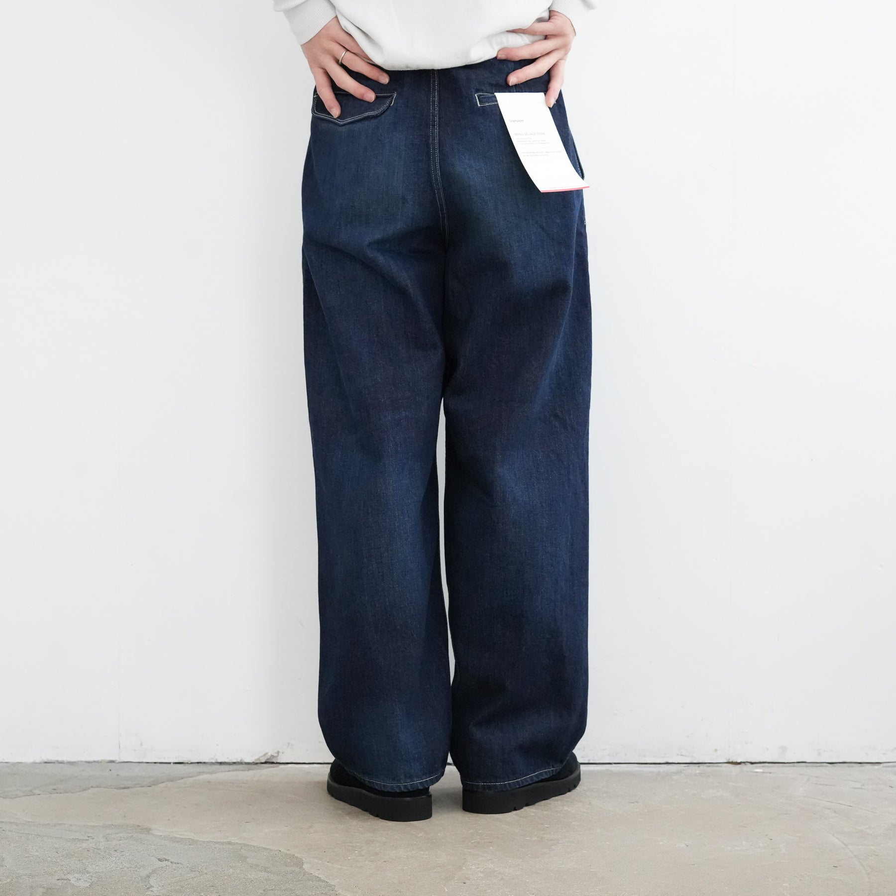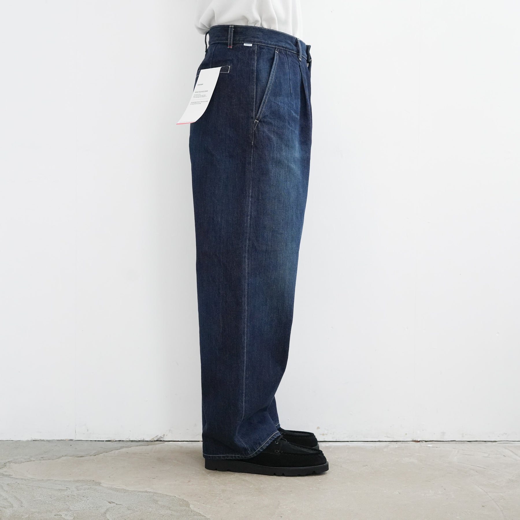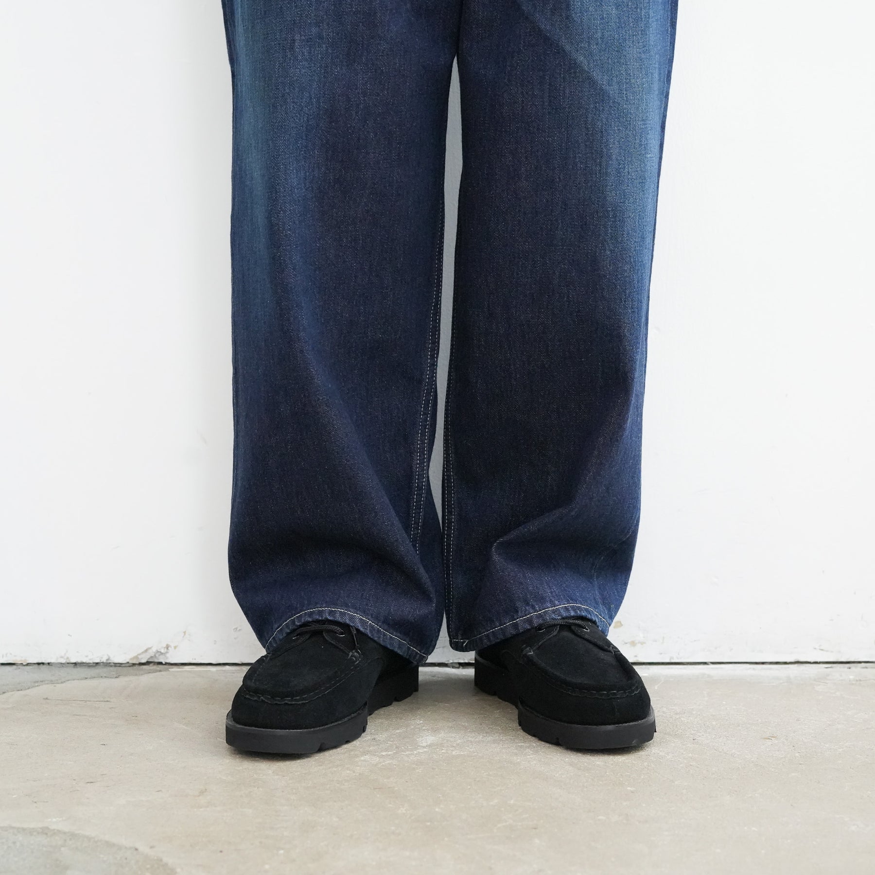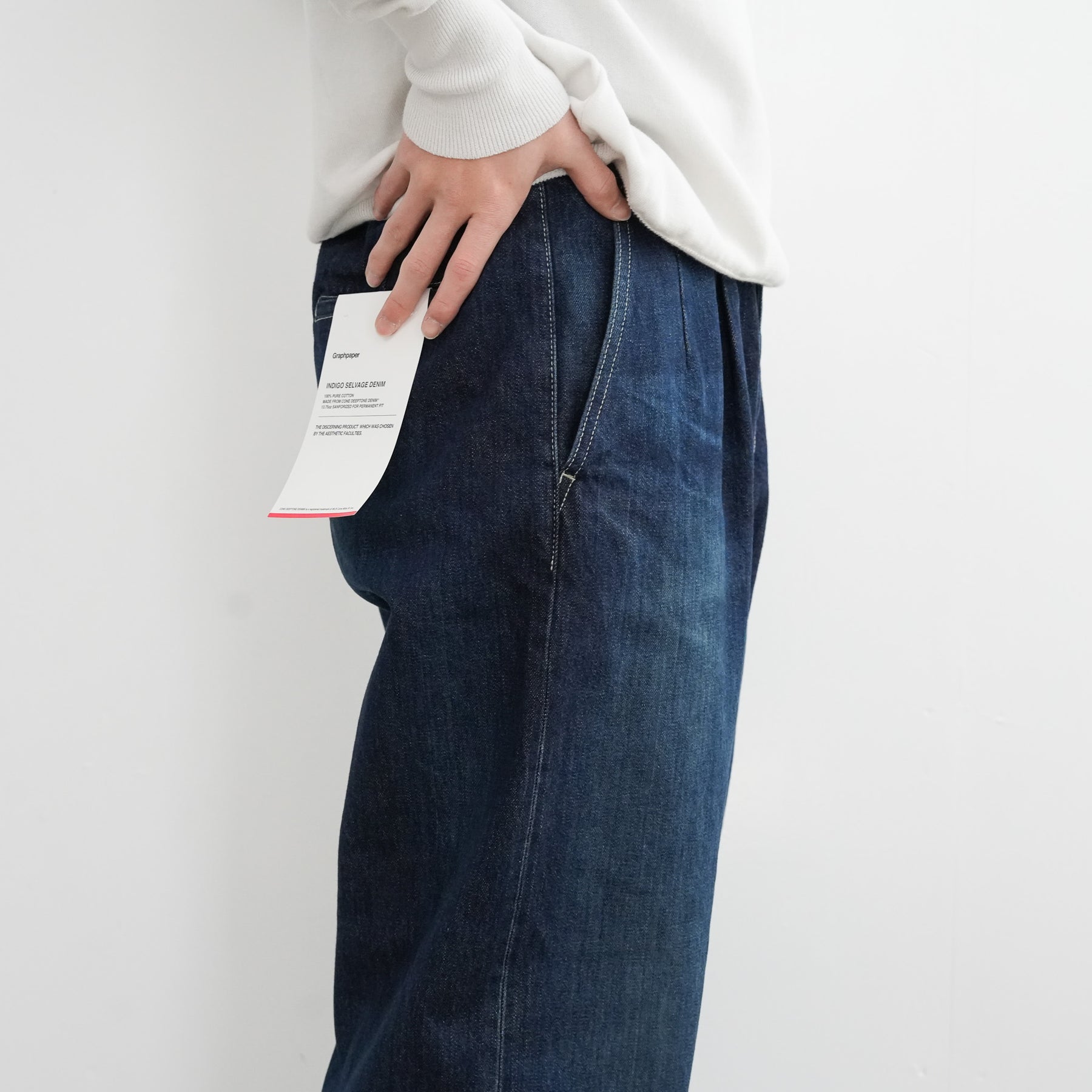 130年もの歴史を誇る米国Cone Denim社が作る13.75オンスのセルビッチデニム。ウエストにはタックが入り、ヒップからワタリにかけて適度な余裕があるワイドストレートパンツ。旧式力織機でゆっくりと織り上げることで生まれる、生地表面のざらっとした凹凸やムラがデニム本来の風合いを感じさせる魅力的な素材。ダークフェイドはメリハリのある濃淡が特徴です。