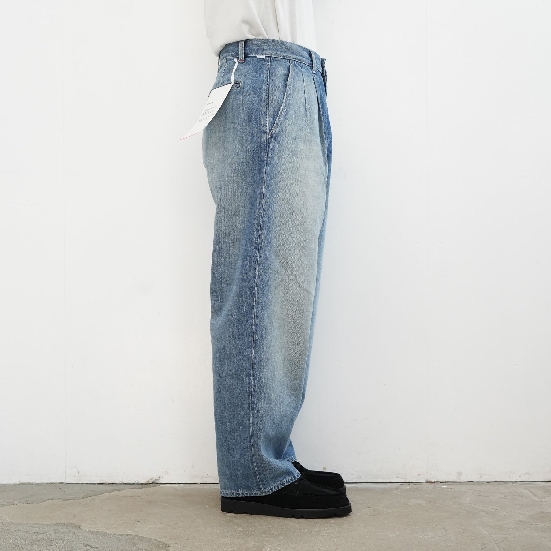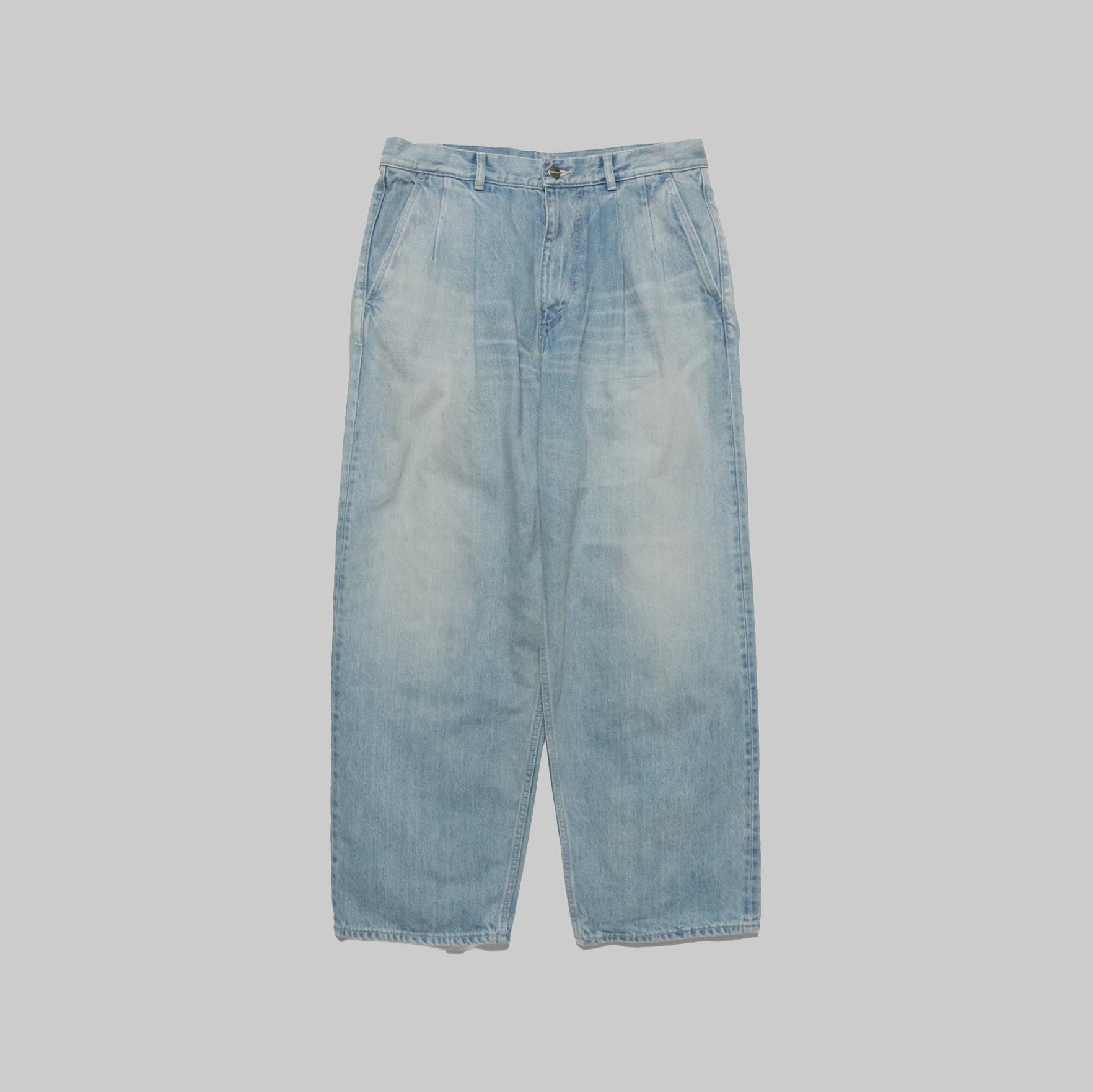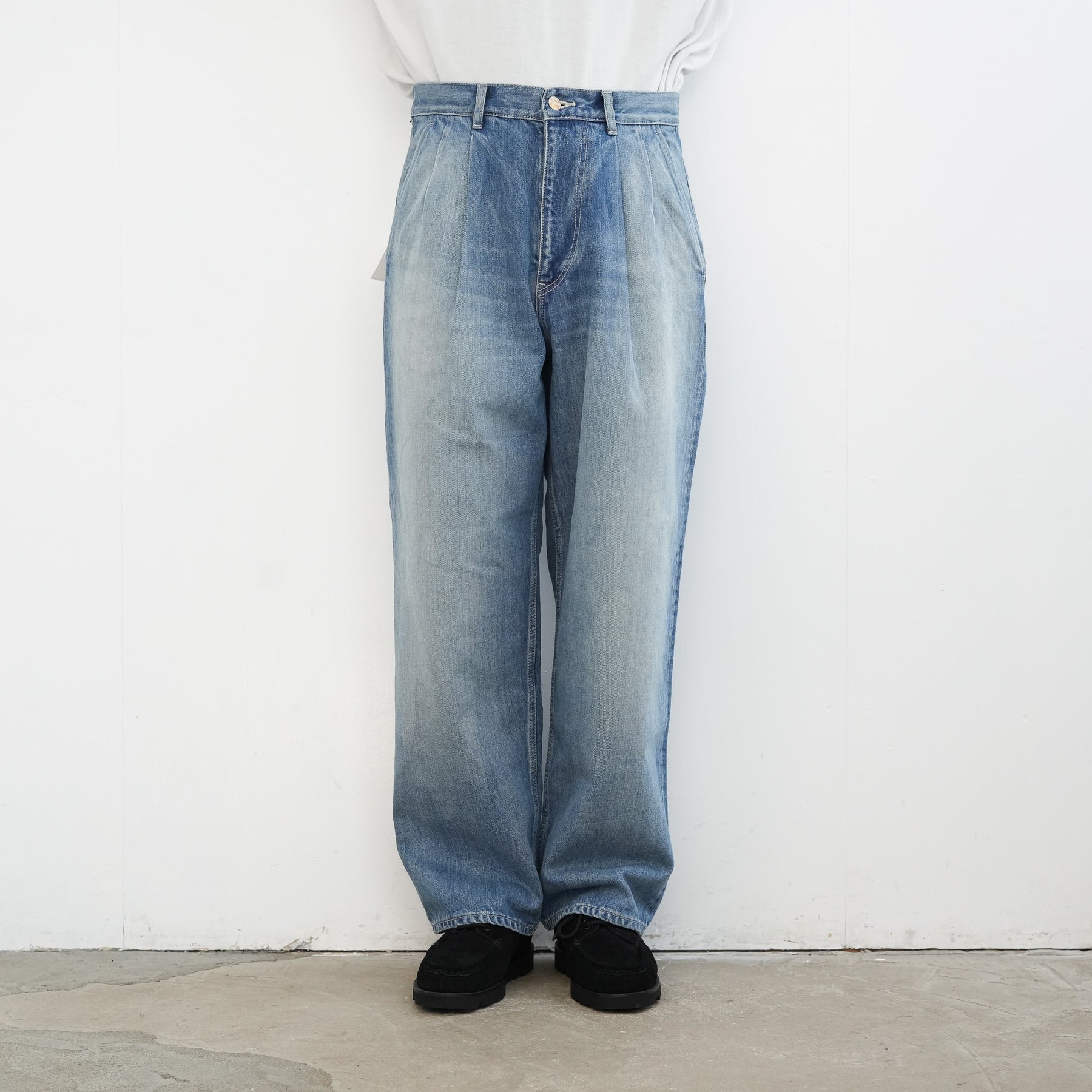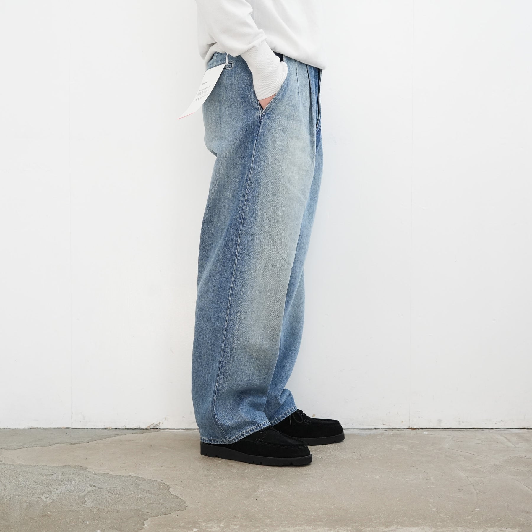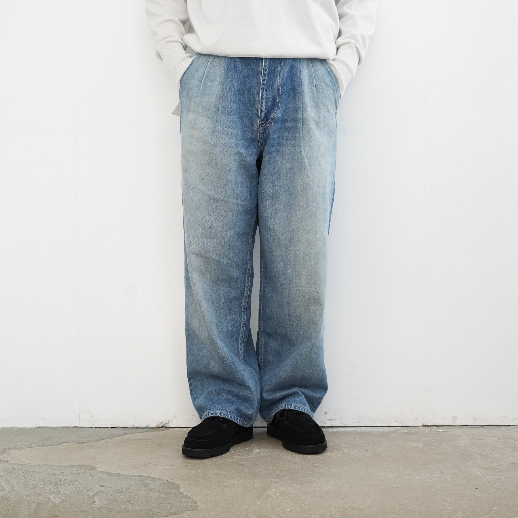 130年もの歴史を誇る米国Cone Denim社が作る13.75オンスのセルビッチデニム。ウエストにはタックが入り、ヒップからワタリにかけて適度な余裕があるワイドストレートパンツ。旧式力織機でゆっくりと織り上げることで生まれる、生地表面のざらっとした凹凸やムラがデニム本来の風合いを感じさせる魅力的な素材。ライトフェイドは長く使い込まれたような淡い色合いが特徴です。