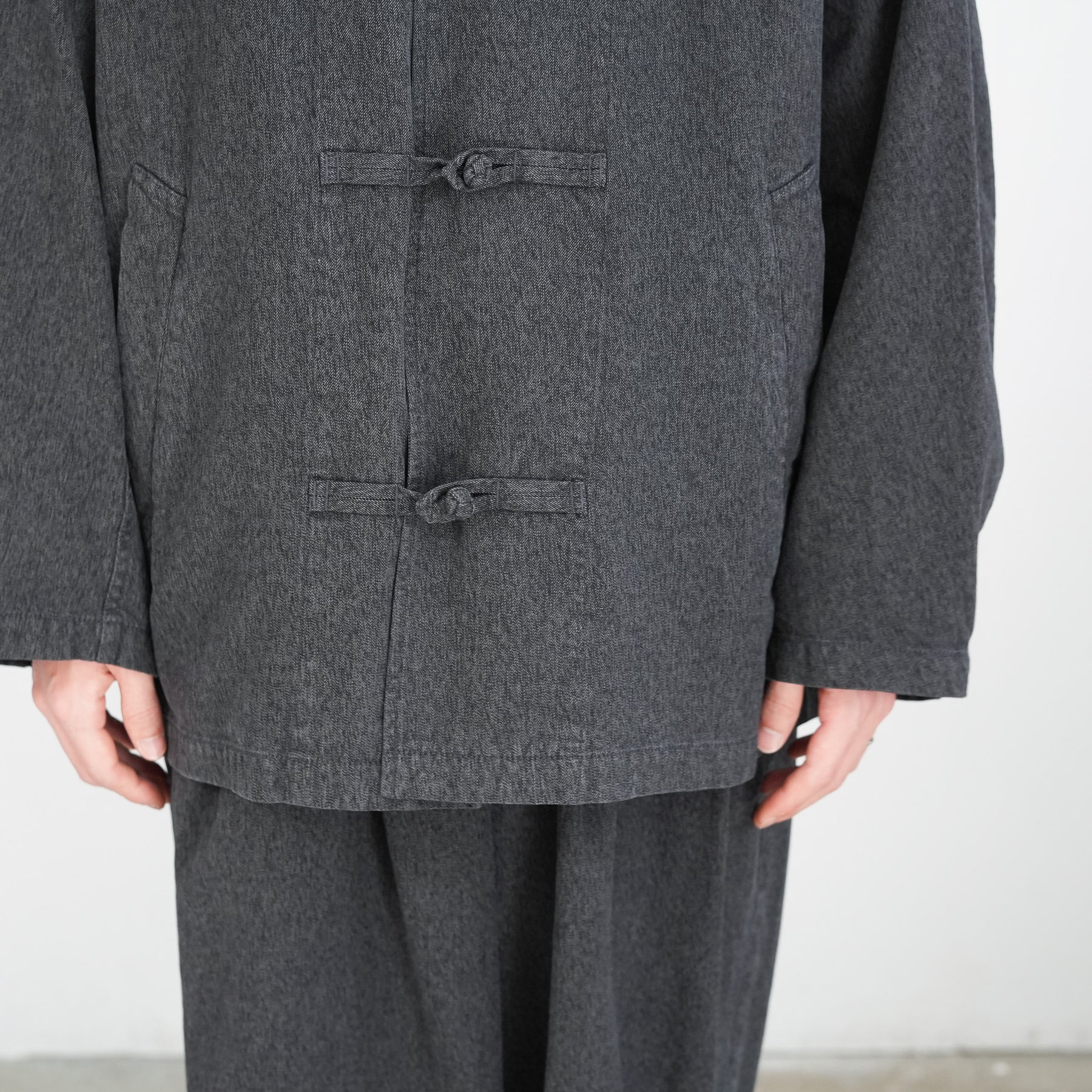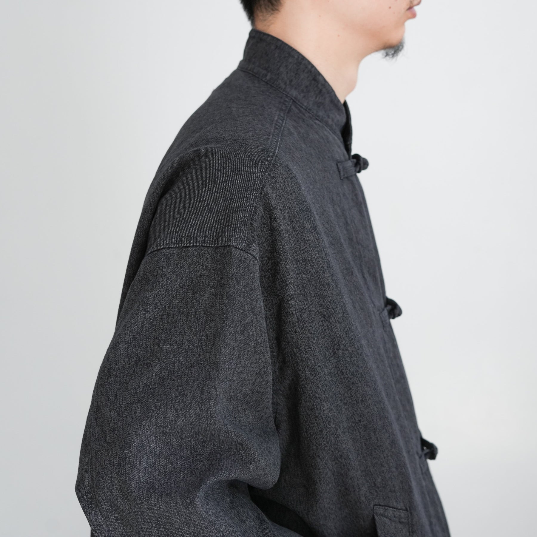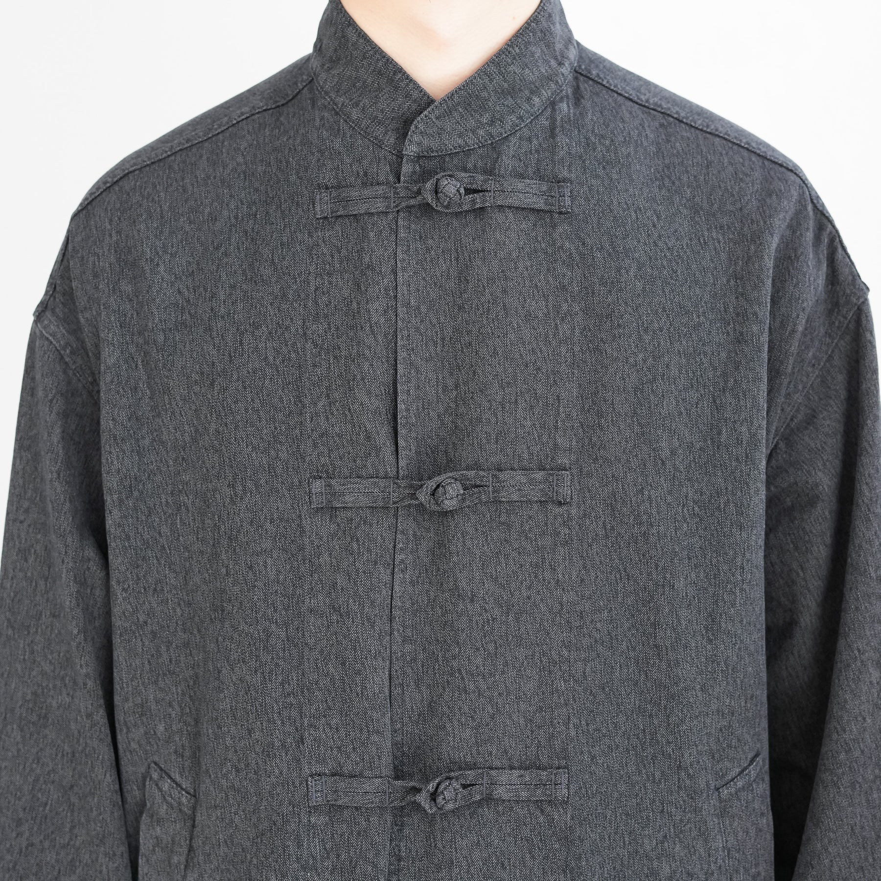 マオカラーと玉結びボタンのディテールを備えた、ゆったりとしたシルエットのライトアウター。硫化染めの黒糸と白糸を撚り合わせて織り上げたメランジギャバジンを採用。霜降り状の豊かな色合いと、洗い加工によるフェード感・パッカリングが深みのある表情を引き出す。