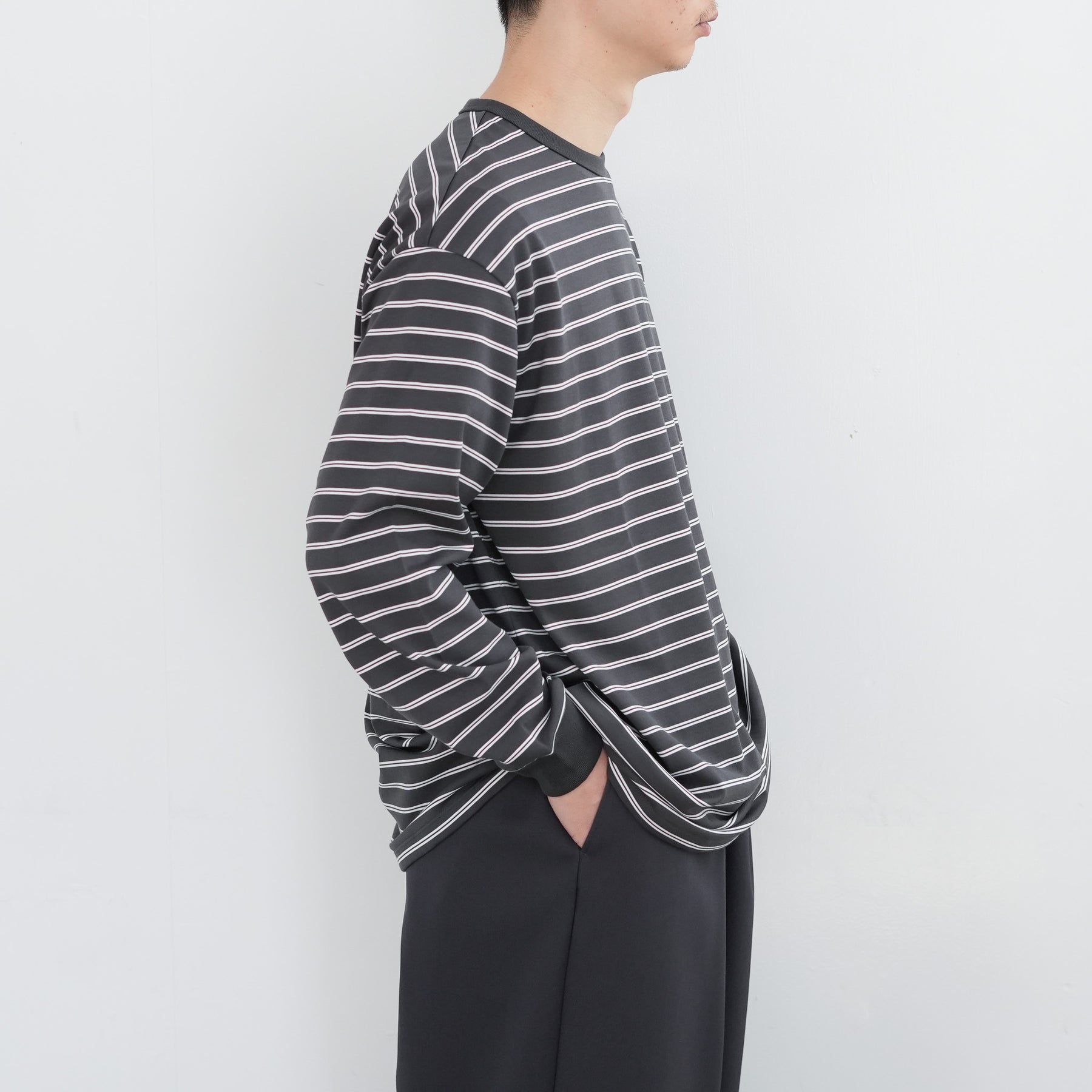 極細糸を撚り合わせた滑らかな天竺素材のロングスリーブボーダーTシャツ。非常に細い3本の糸を撚り合わせることで生まれる自然な光沢と柔らかな肌なじみ。糸の良さを最大限に引き出した均整の取れた編み目が、美しく上品な表情を演出。