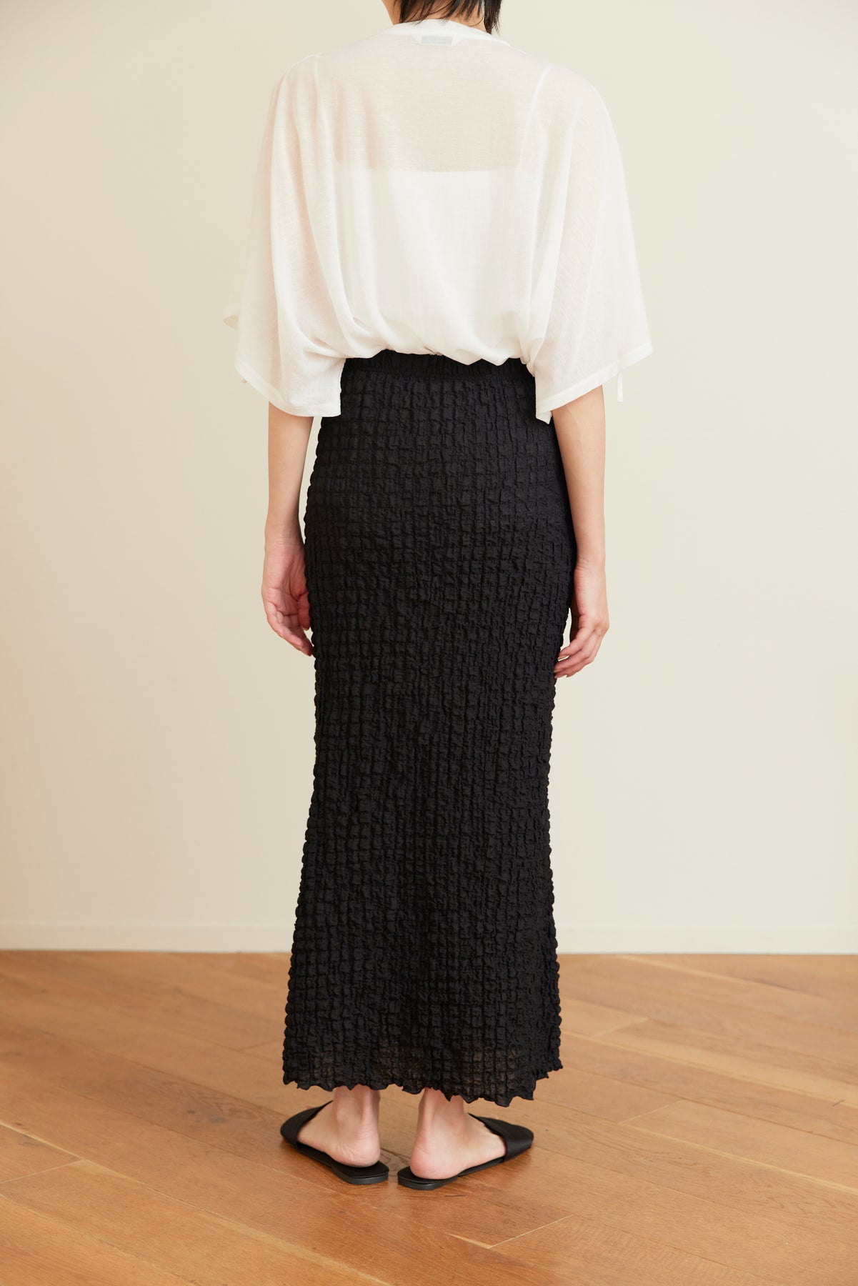 女性らしい丸みのあるマーメイドシルエットは、カジュアルなTシャツと合わせたスタイリングもおすすめです。