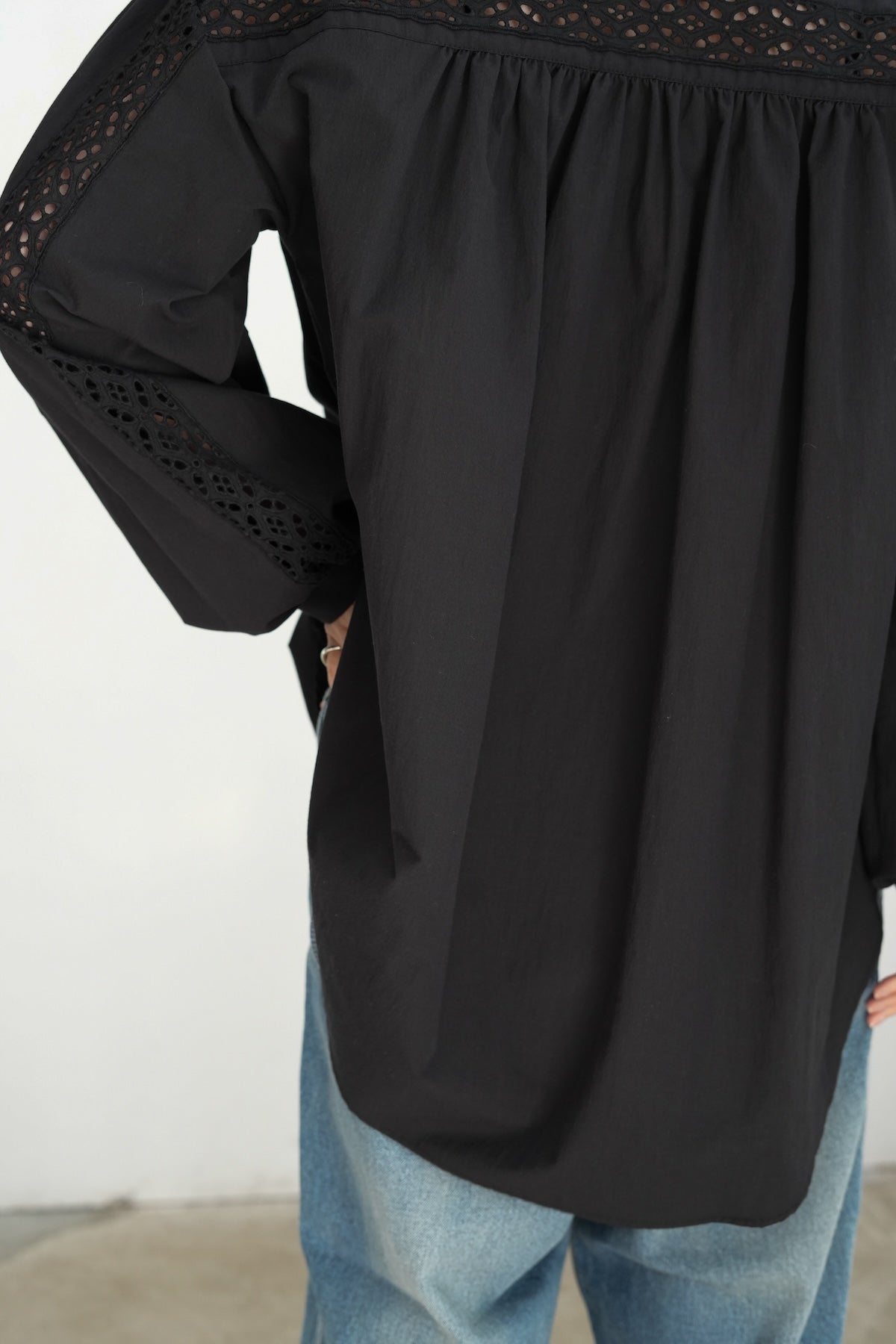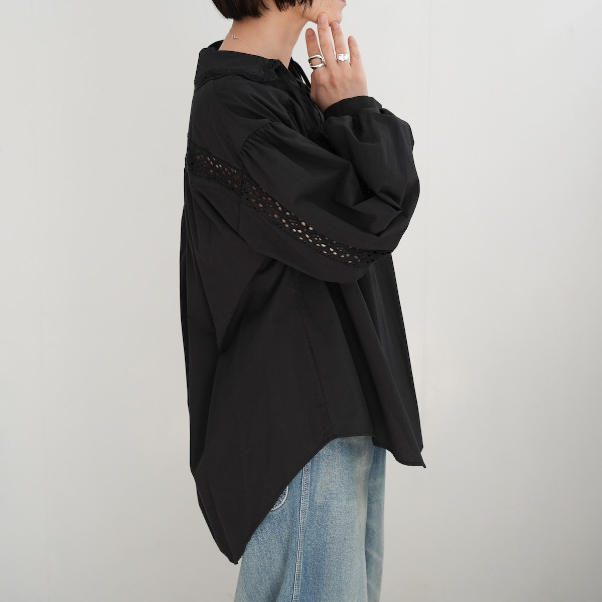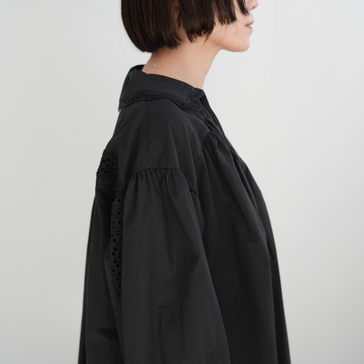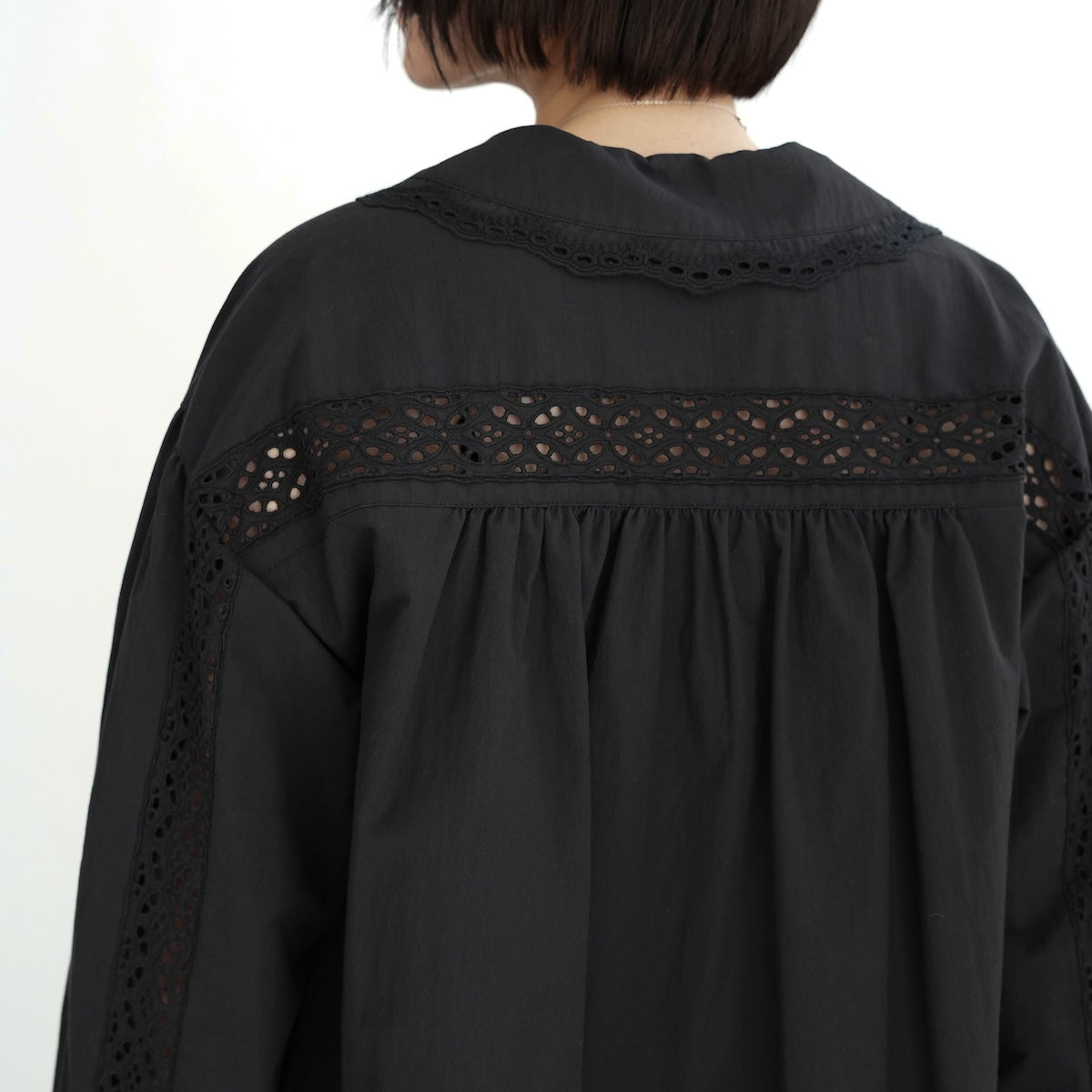 後ろ身頃から袖にかけては繊細なコットンレースの切り替えを施し、クラフト感のあるロマンチックな表情をプラス。