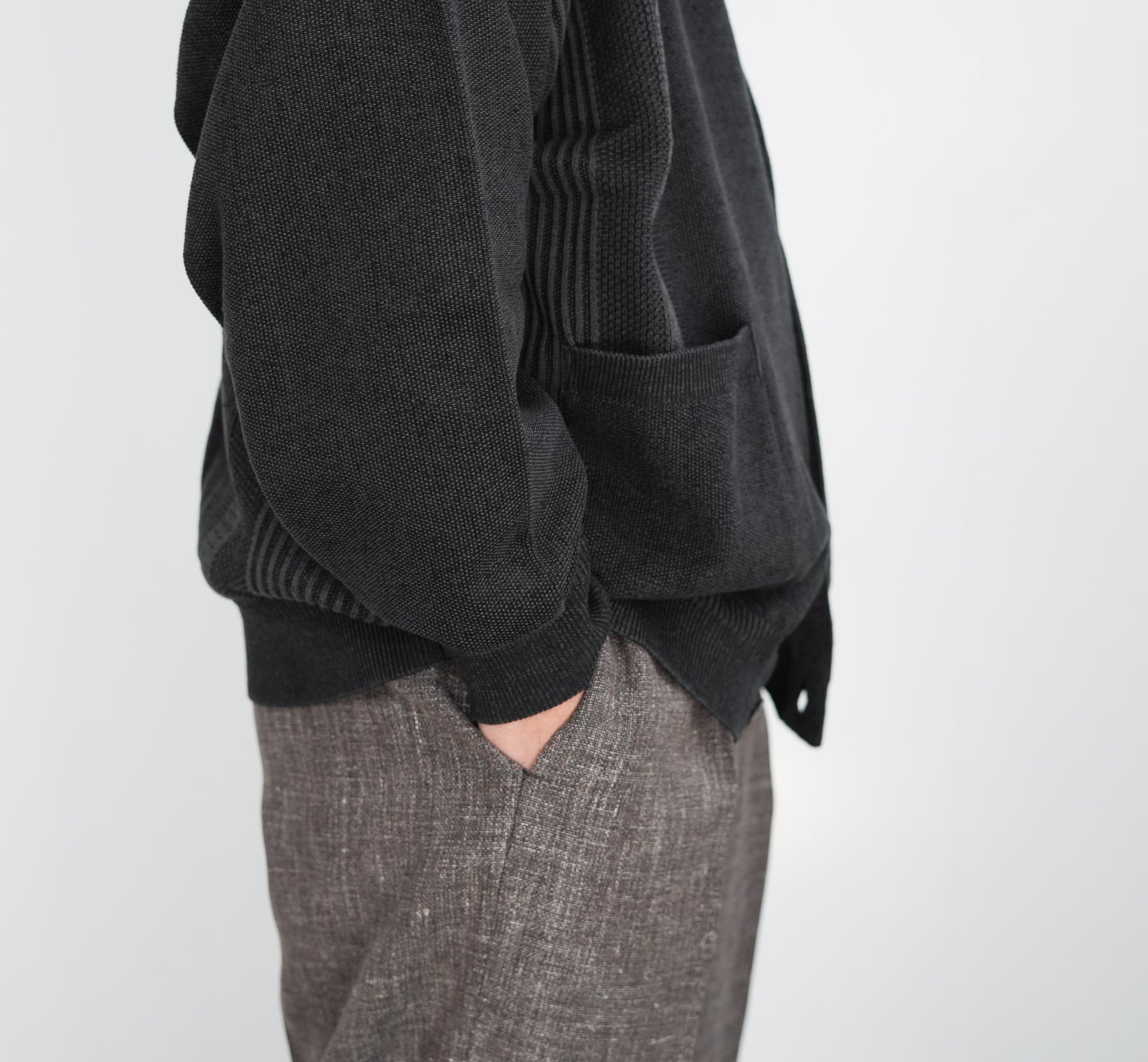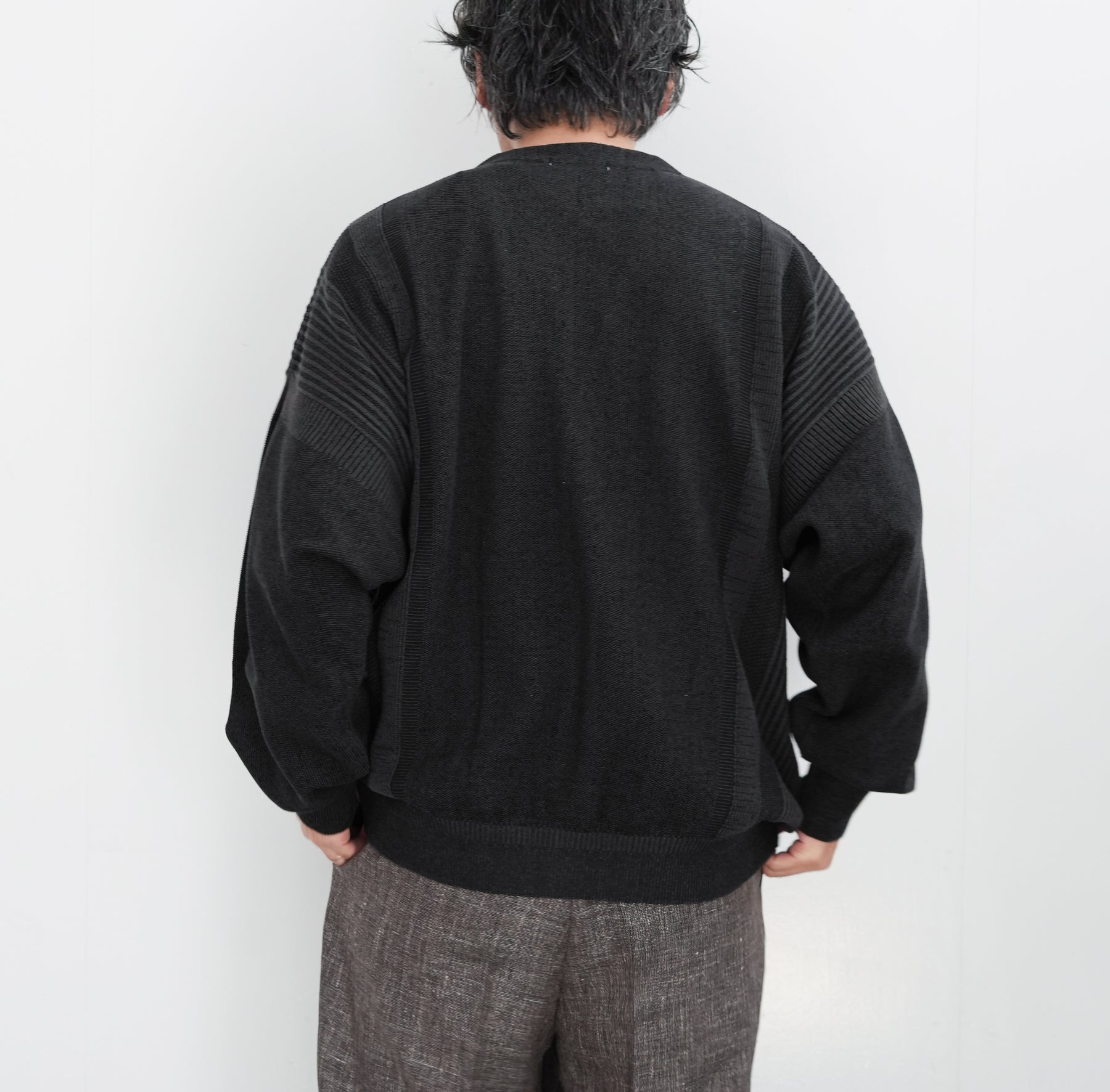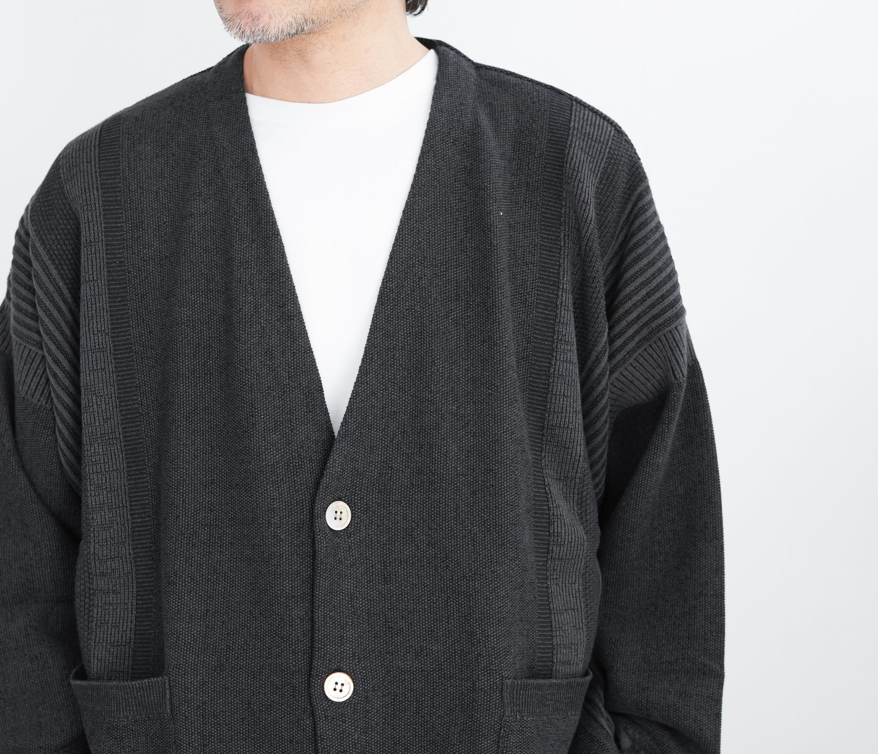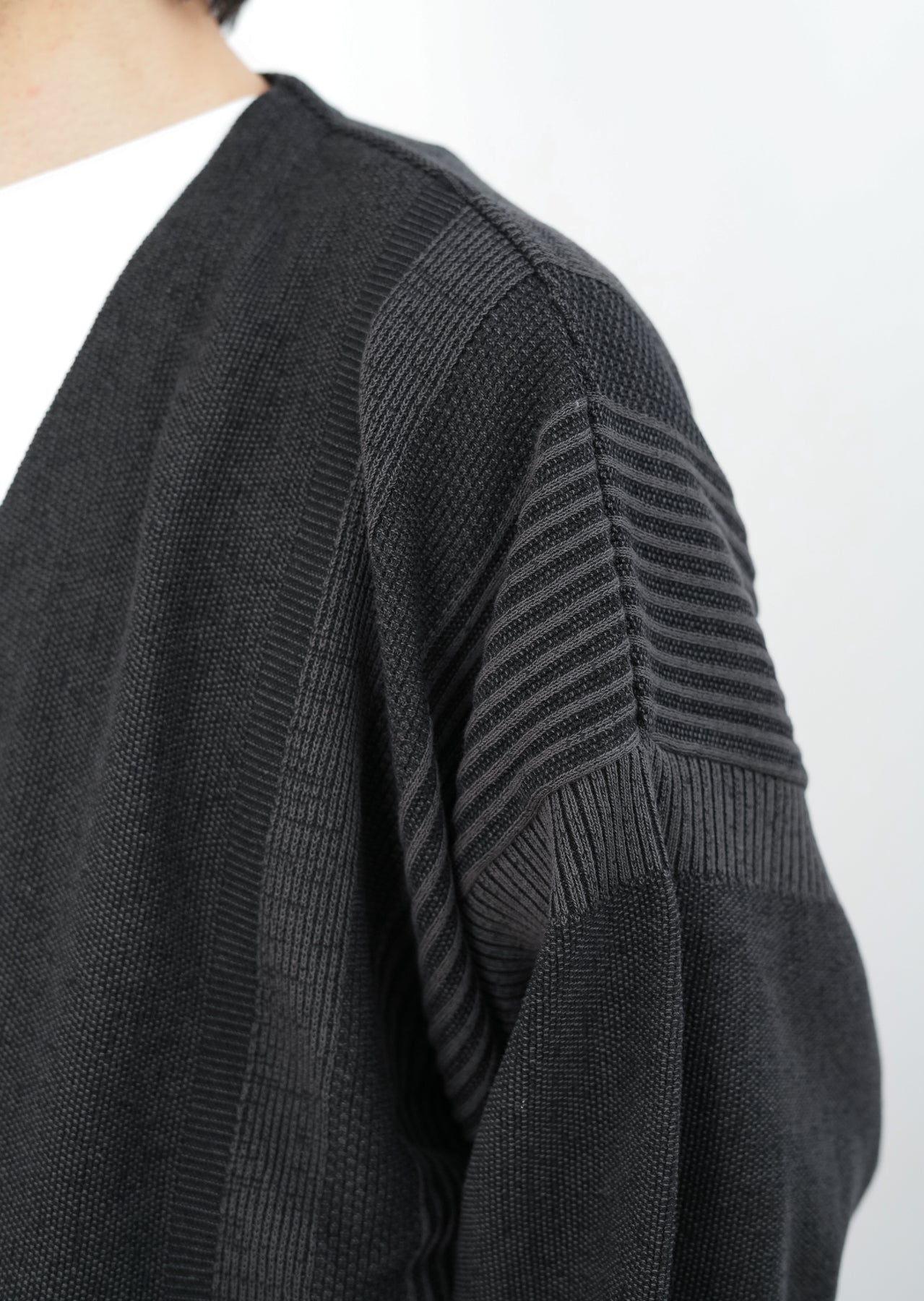 身頃中央と袖の鹿の子編みの細かな凹当で耕された田を表しています。
