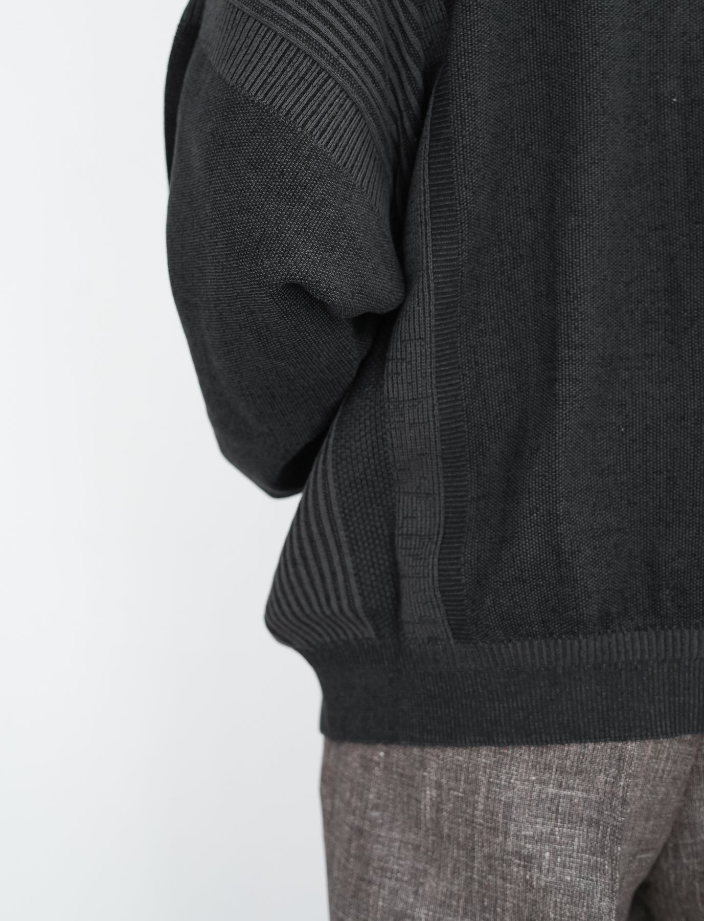 プレーティング編みと言われる表日側と裏日側で異なる糸を編む技法を使用し、表と裏で糸の色を変えて、2色で編むことで奥行きのある表情に仕上げています。
