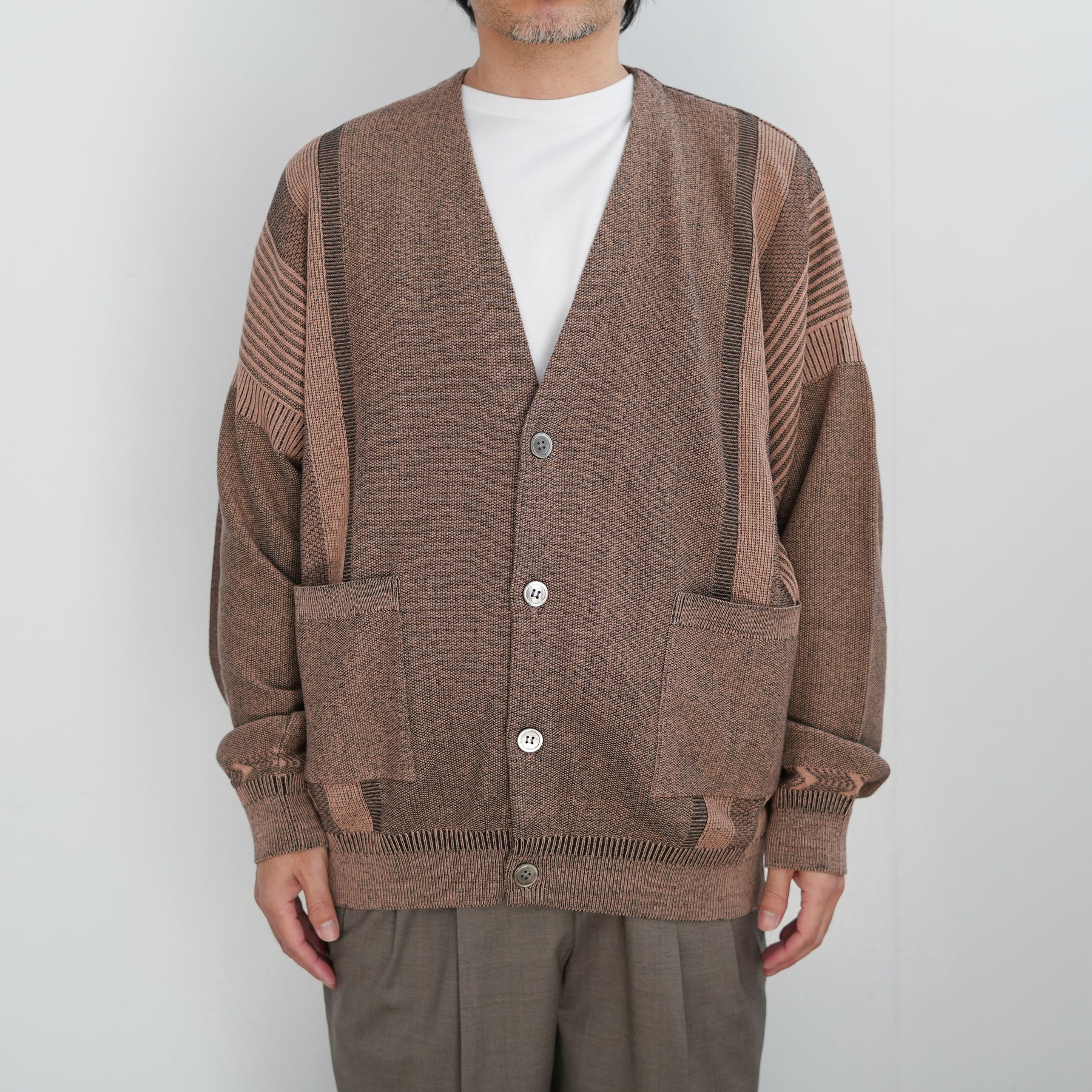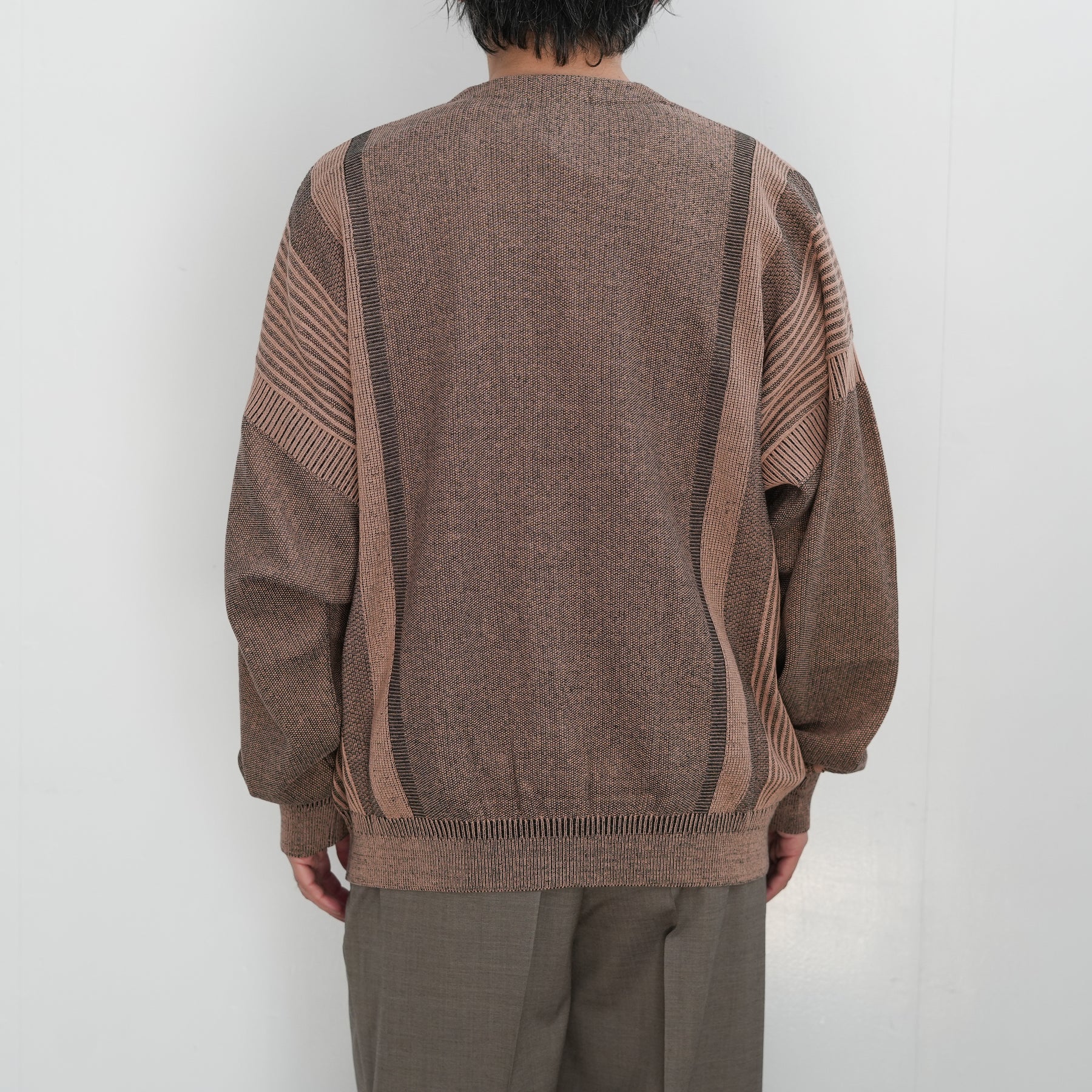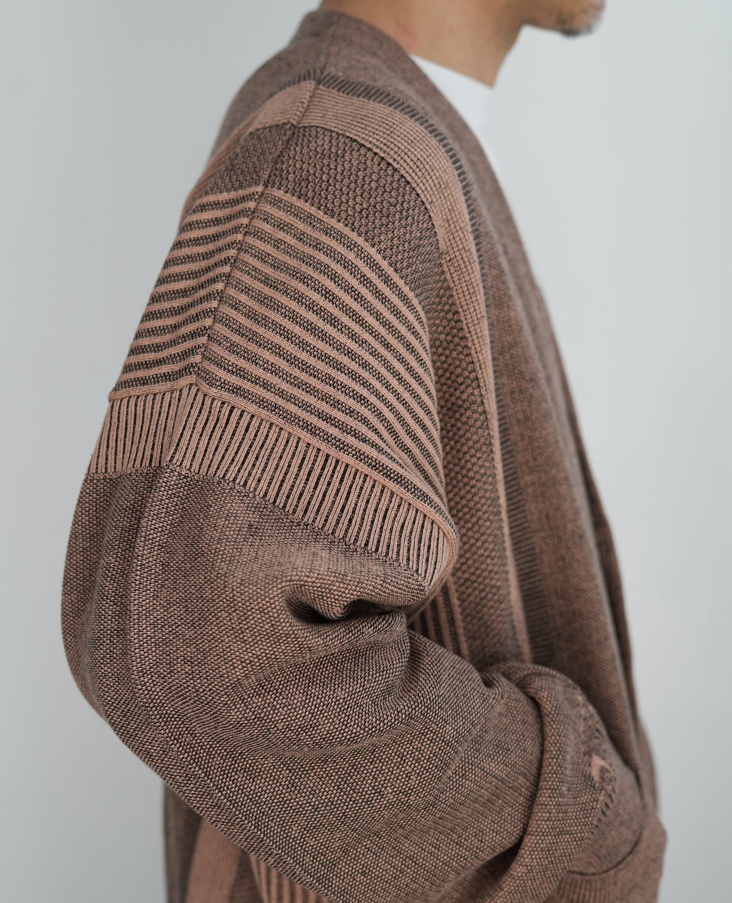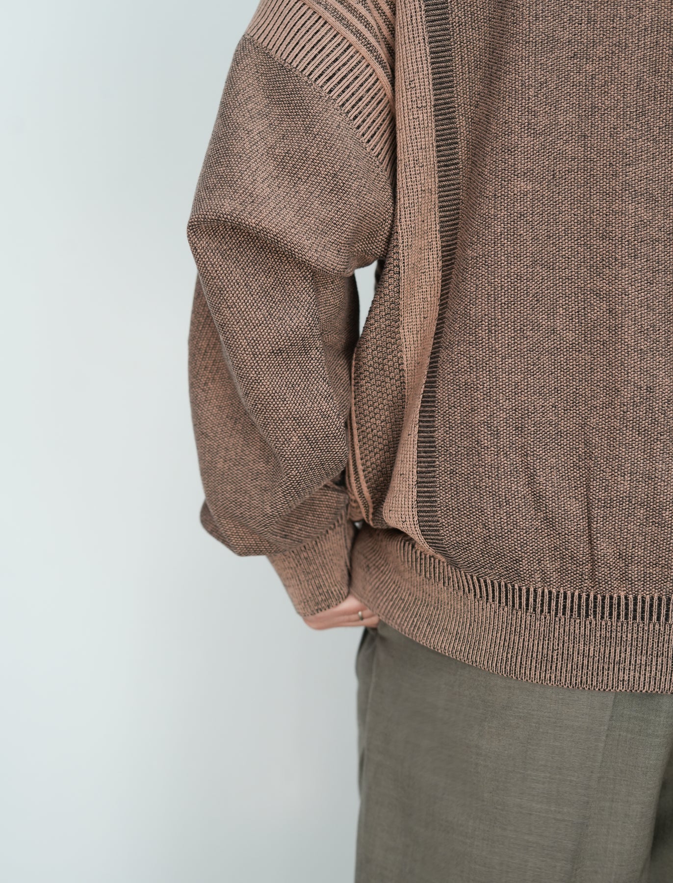 プレーティング編みと言われる表日側と裏日側で異なる糸を編む技法を使用し、表と裏で糸の色を変えて、2色で編むことで奥行きのある表情に仕上げています。