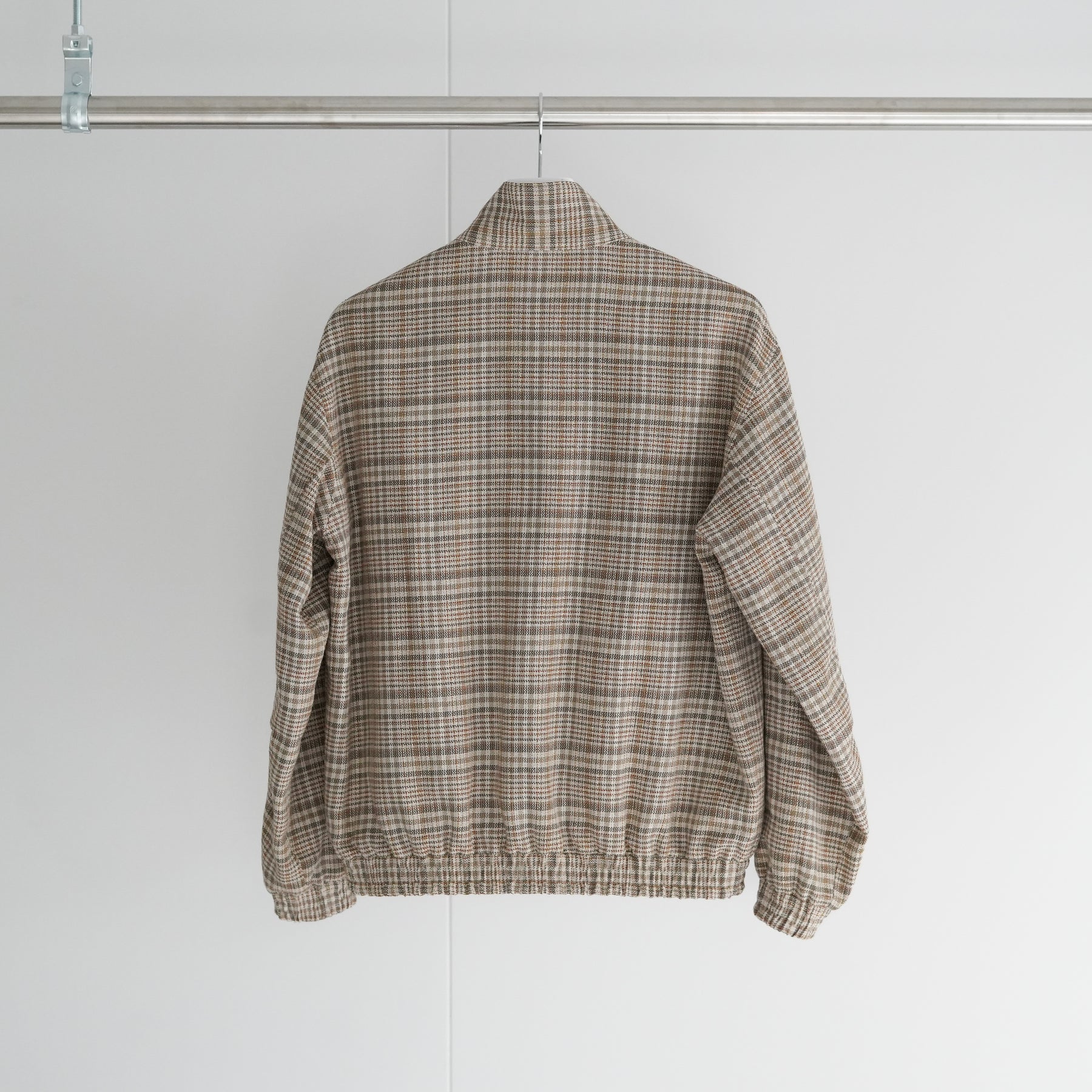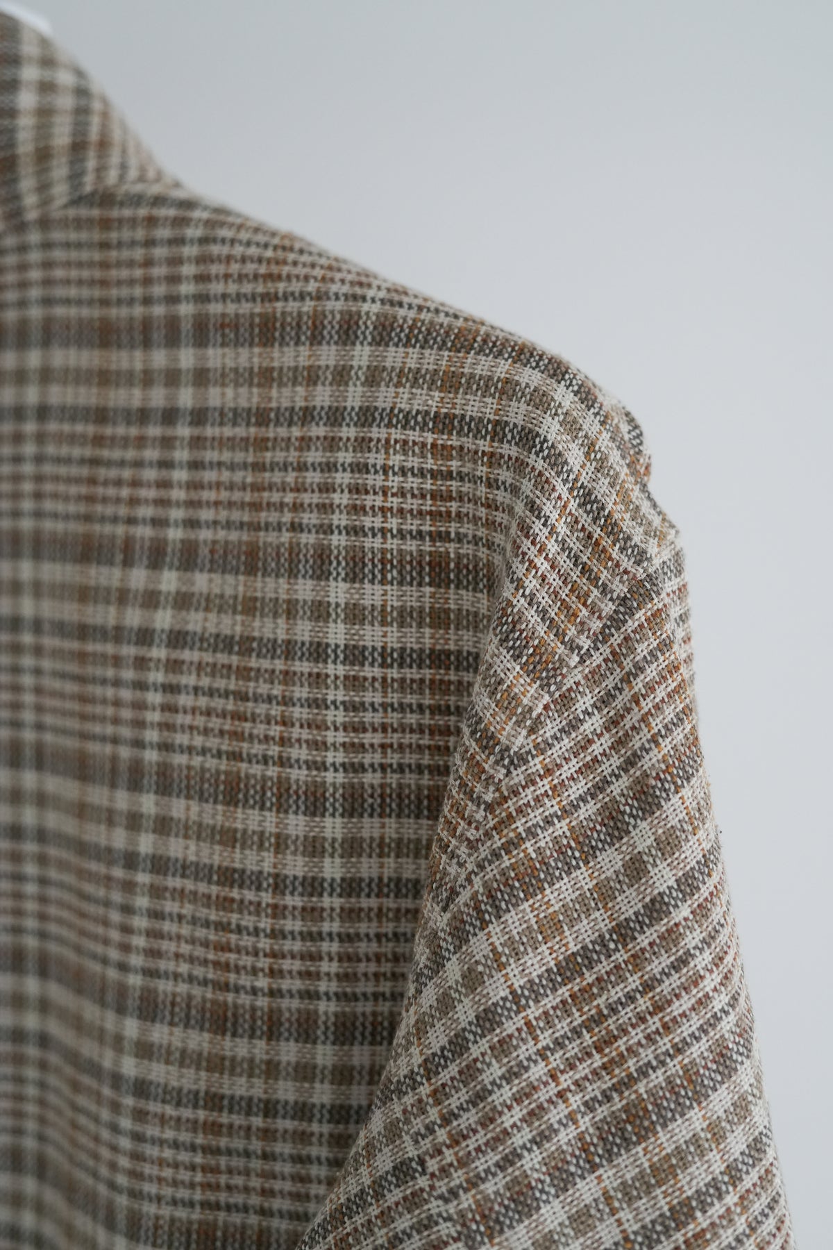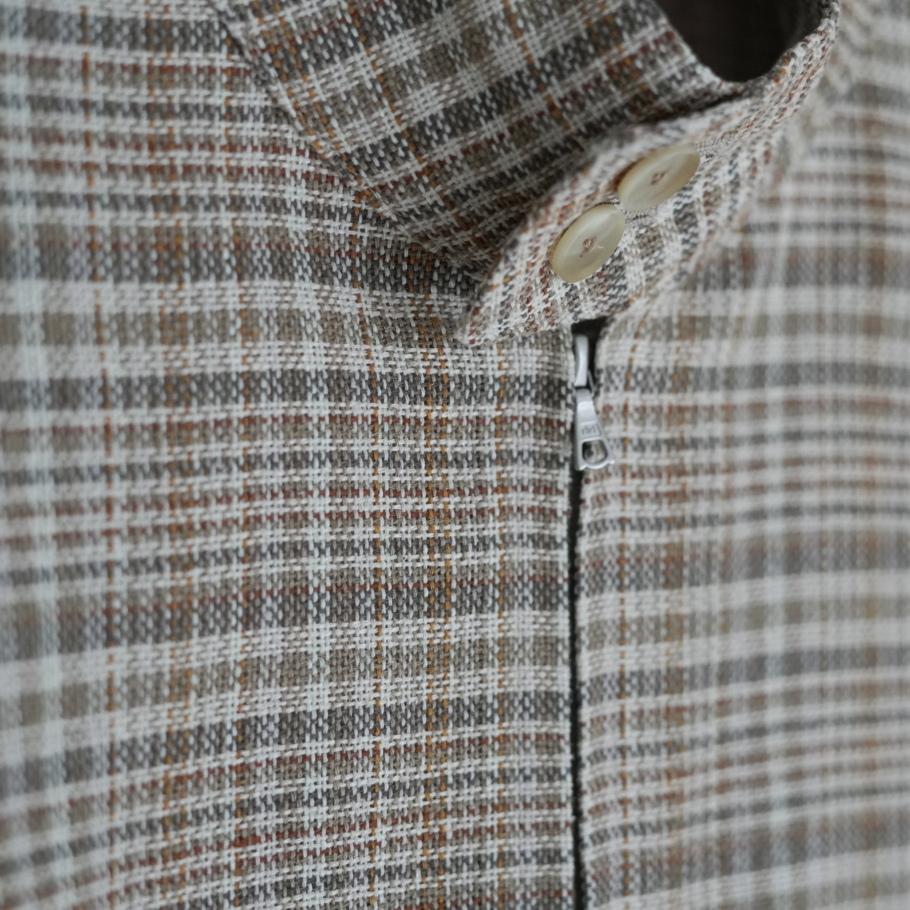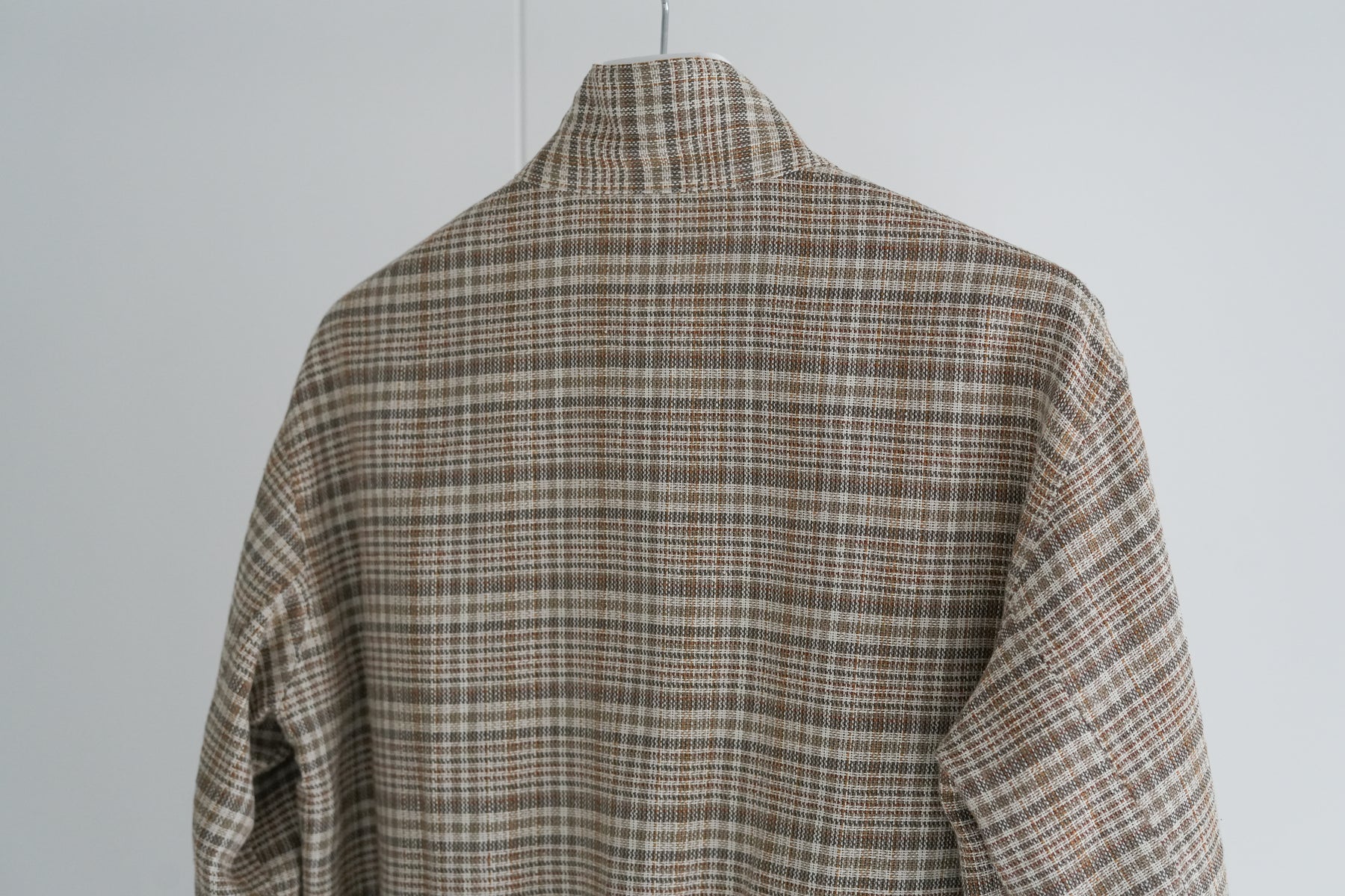 シルクノイルとリネンによる三つ杢糸をタテヨコに用いたチェック柄のサマーツイードを使った
