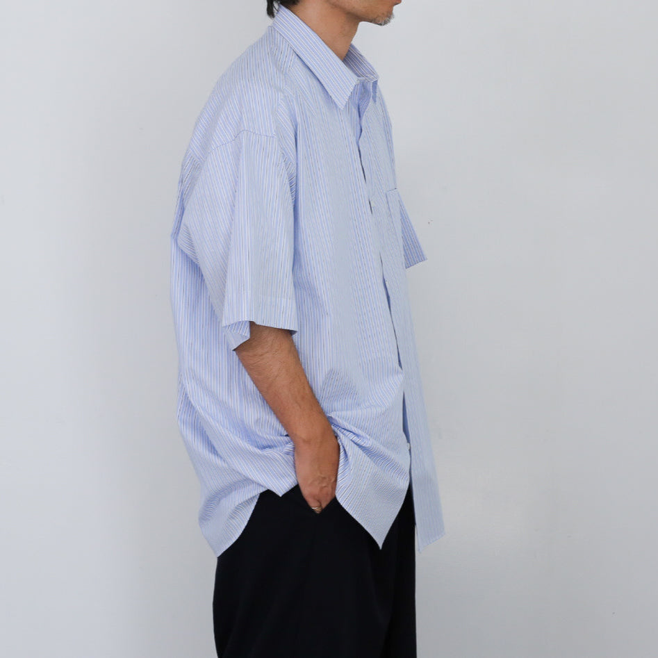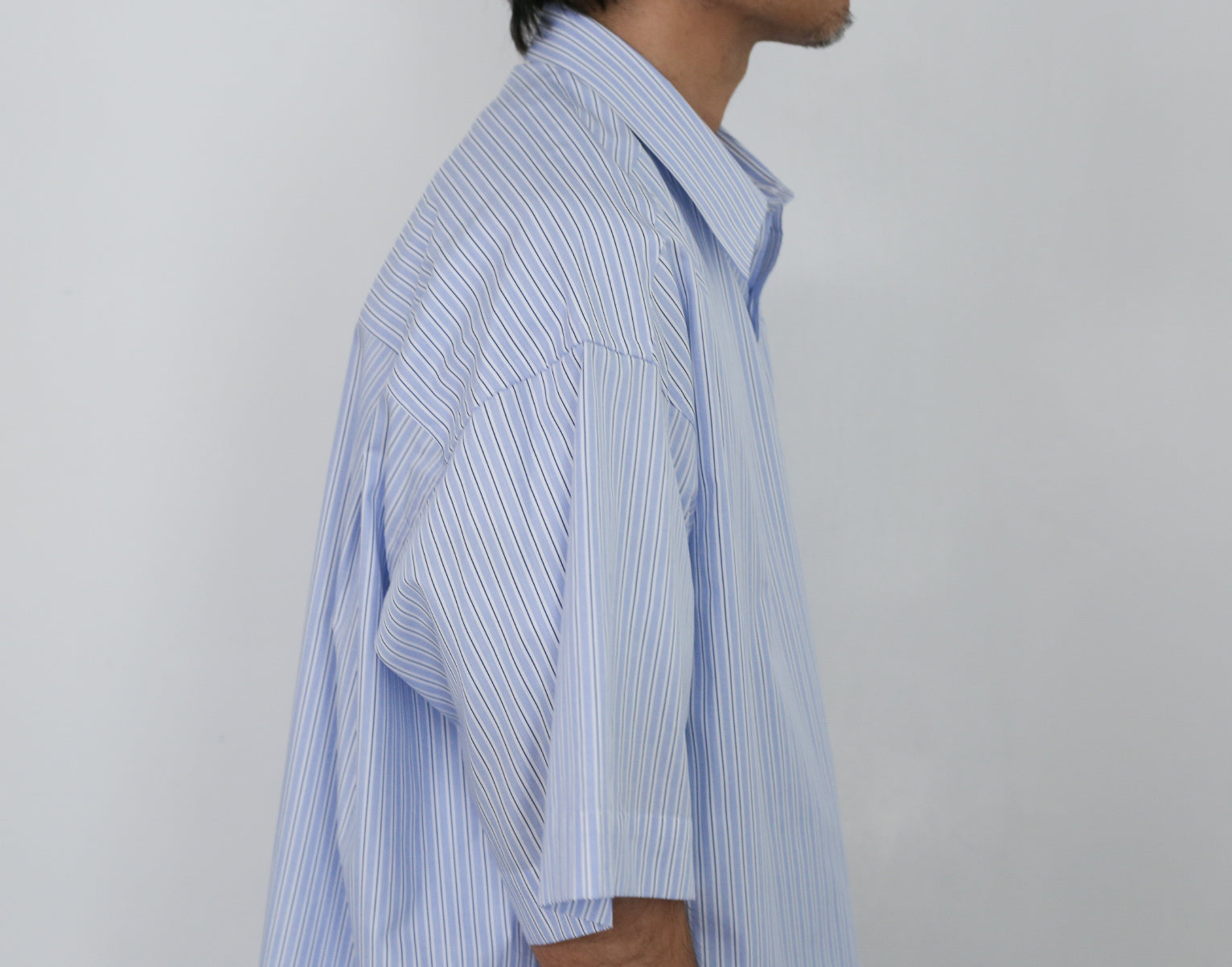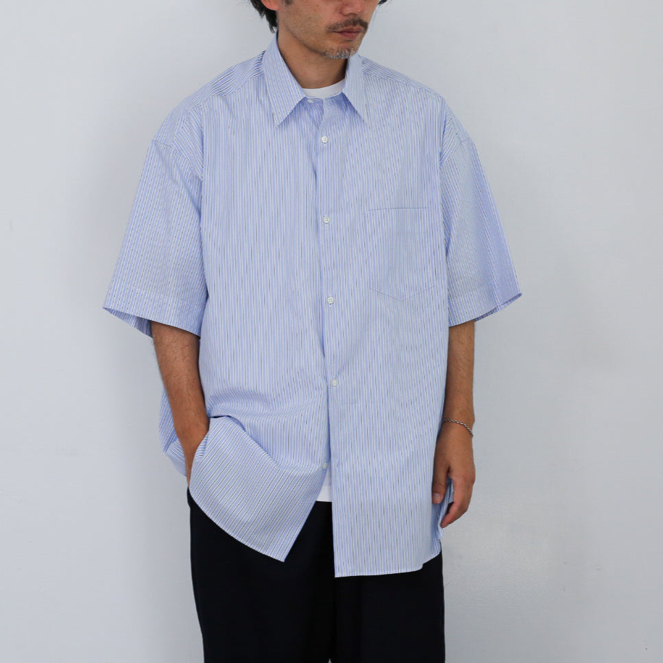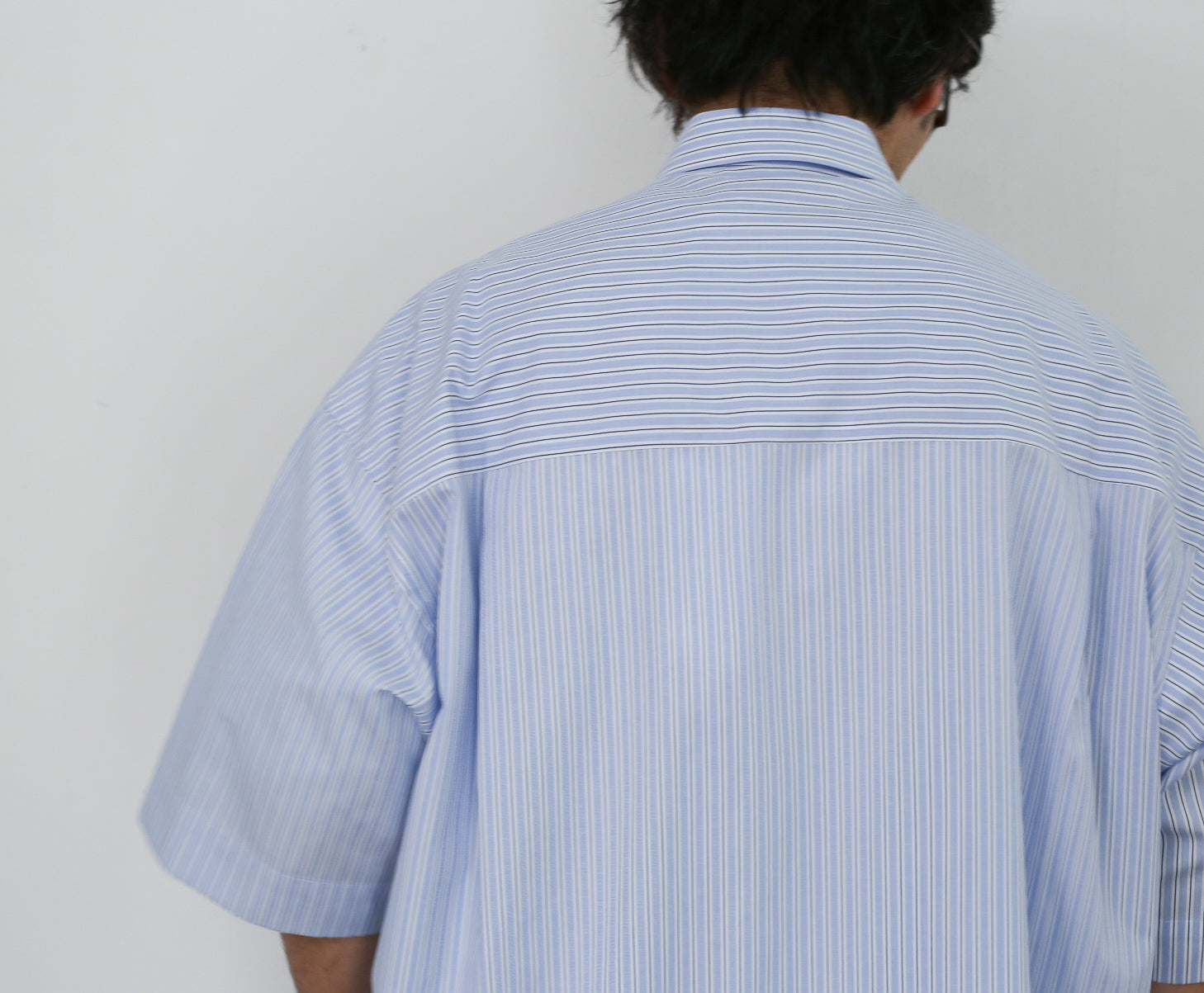 スペイン・バルセロナに拠点を持つSIDOGRAS(シドグラス)社の上質で繊細なコットンを使用したブロード生地の半袖オーバーサイズシャツ。鮮やかな染色と素材そのものの艶感と適度なハリコシ、柔らかい肌触りも魅力。ドロップショルダーでボリュームのあるボックスシルエットでオーセンティックなレギュラーカラー。肩の傾斜や低く下げられたヨークの位置、アームホールの広さなど、細かなディテールを特異なバランスで仕上げたビッグシルエット。