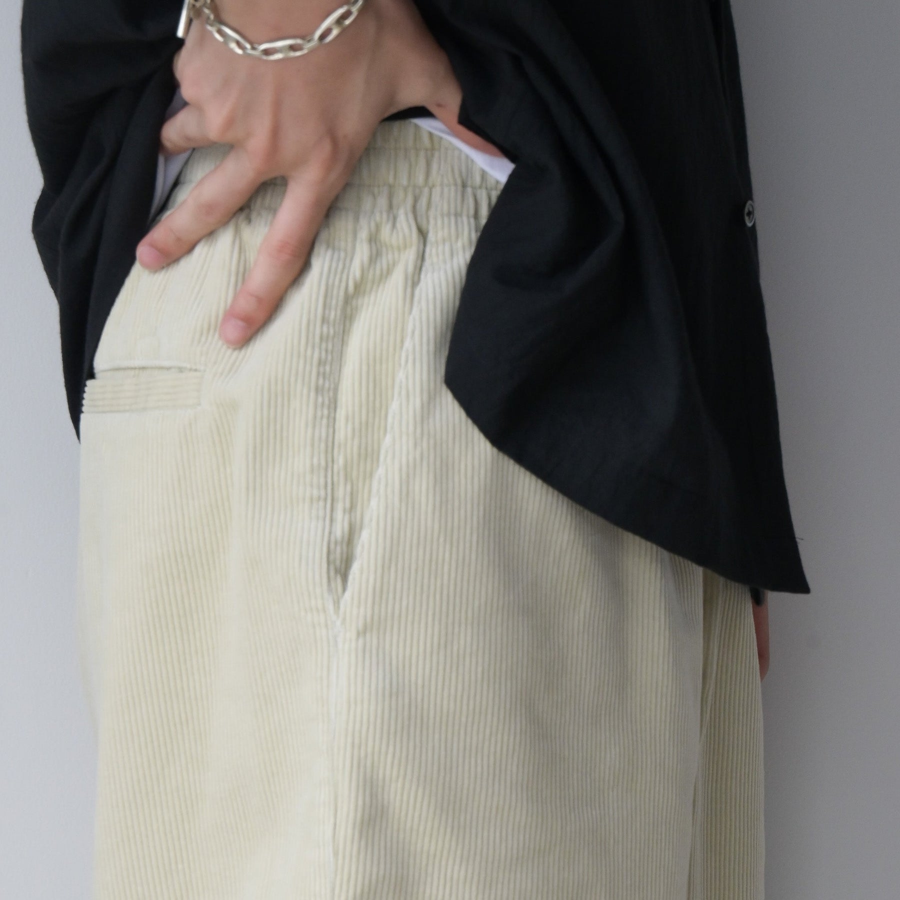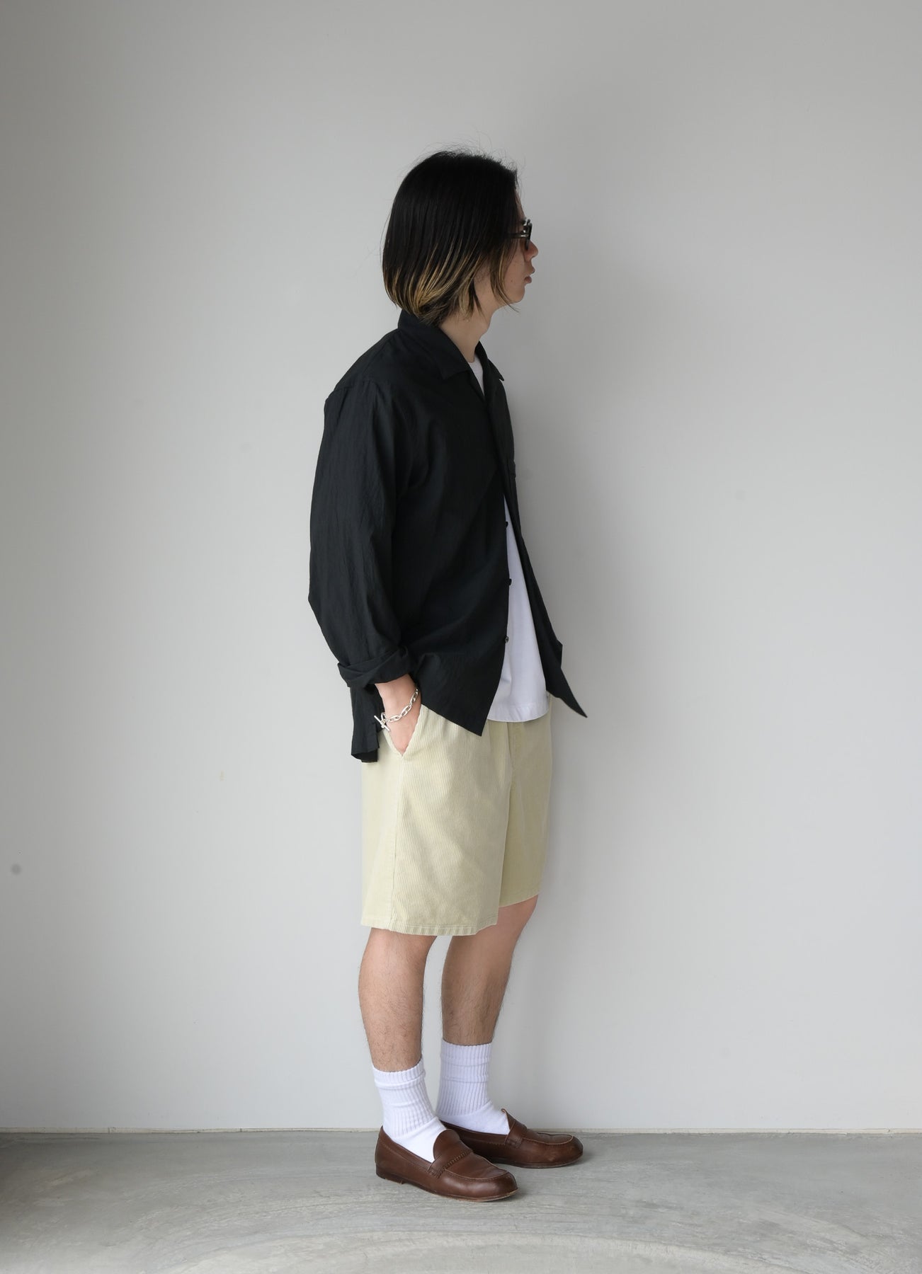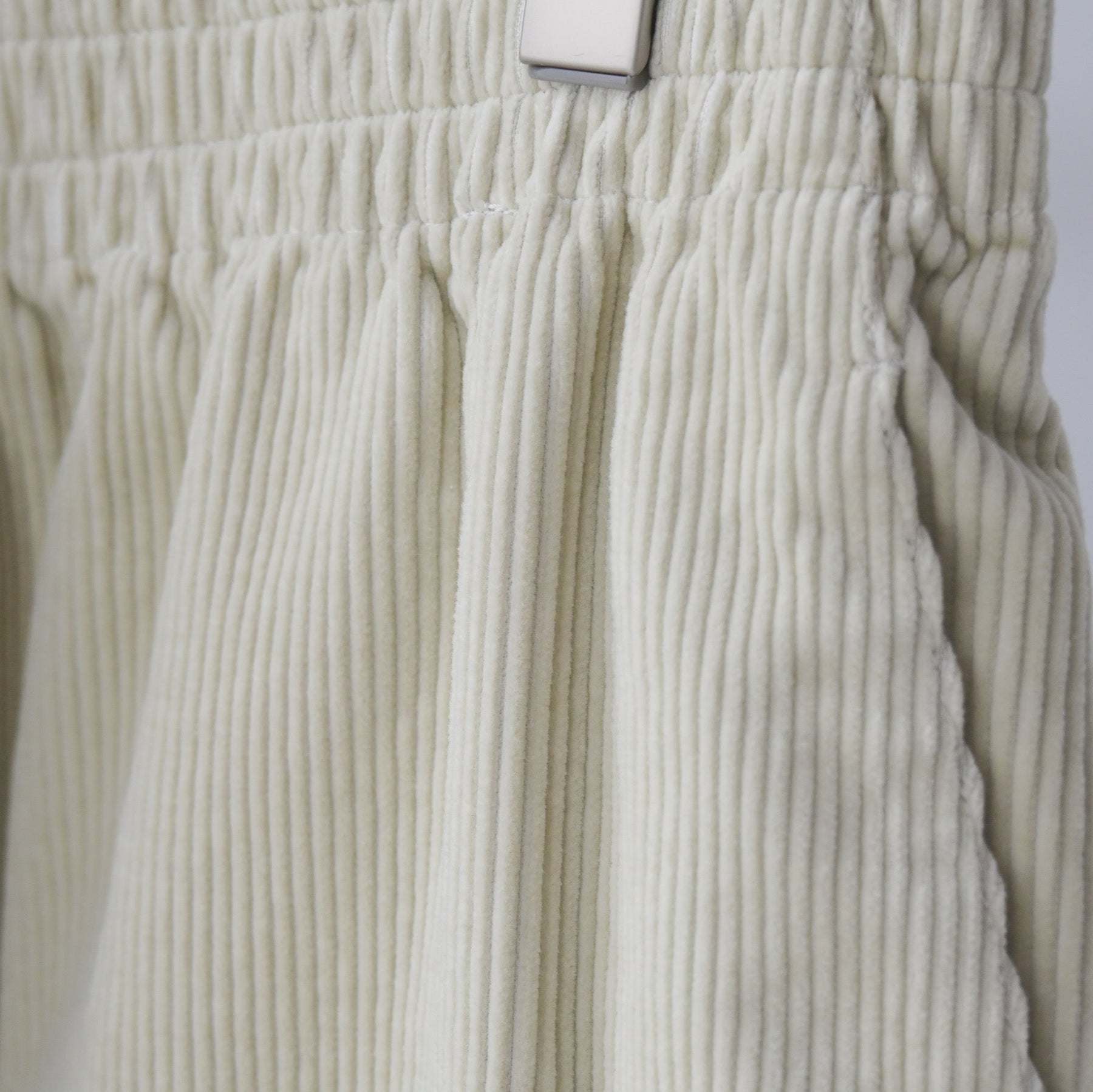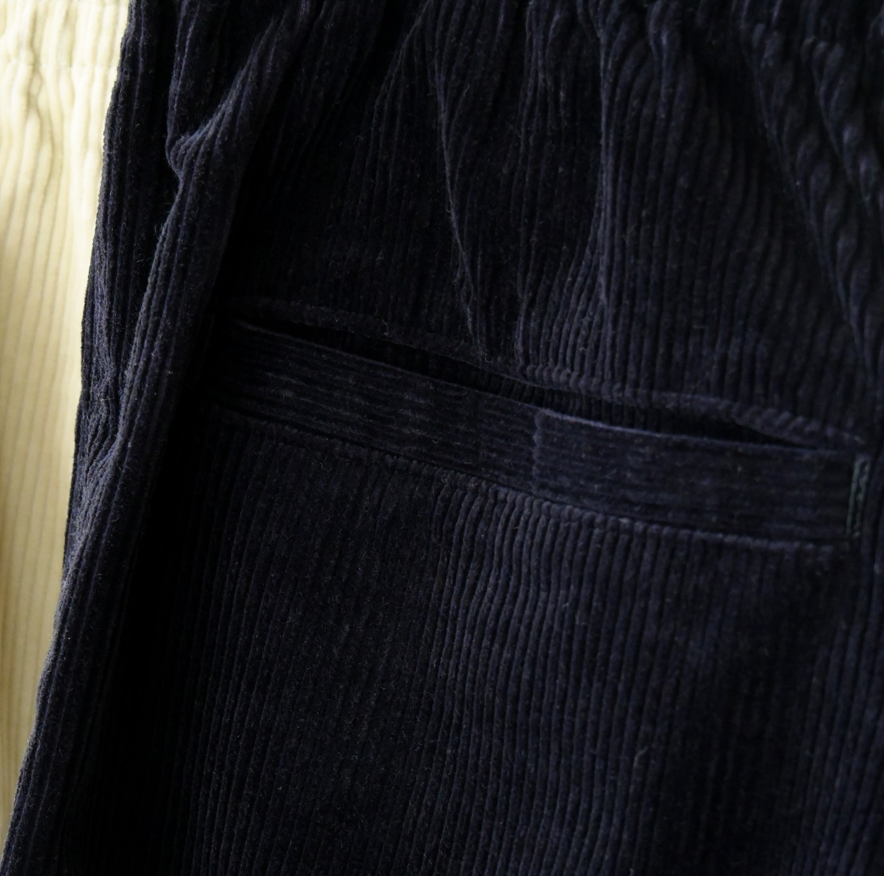 タテに32/2、ヨコに16/1のオーガニック糸を使用した基布が薄く柔らかなサマーコーデュロイです。太番手の糸を使用しながらも、ゆっくりの染め上げることで、柔らかく軽い風合いに仕上げております。洗いをかけてカジュアルに表現したイージーショーツです